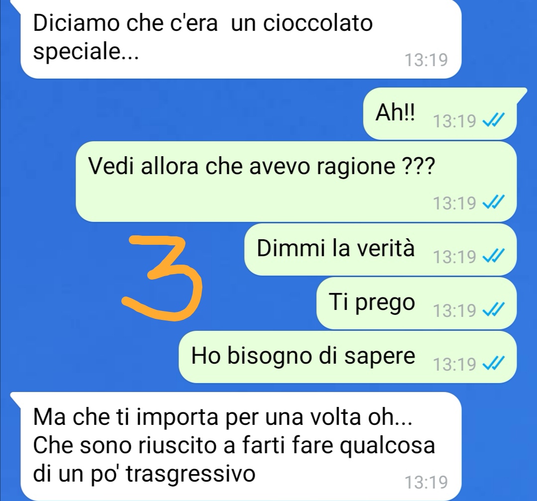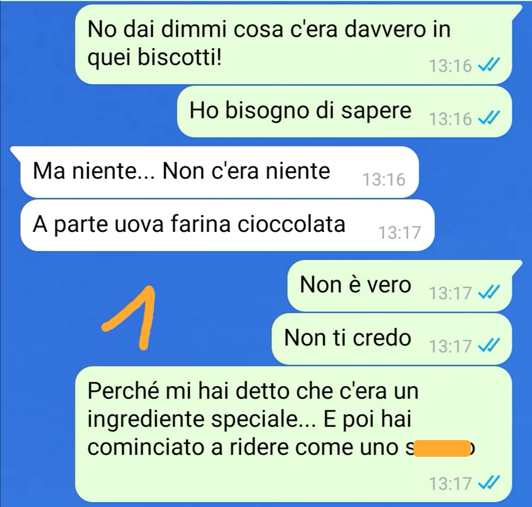 Mi chiamo Nicoletta e ho deciso di inviarvi questa chat perché qualche giorno fa mi è successa una cosa assurda! Praticamente vado a trovare mio fratello che vive da qualche mese da solo e condivide l’appartamento con la sua amica del cuore e coinquilina Daniela. Mentre sono lì vedo sul tavolo un piatto pieno di biscotti al cioccolato. Io sono golosissima e gli chiedo se posso assaggiare. Lui me li offre con entusiasmo e mentre mi godo il primo, buonissimo, vedo che lui mi guarda con un sorrisetto strano. Poi continua a offrirmene e io non mi tiro certo indietro. Dopo un attimo quel risolino diventa una risata che non riesce a trattenere. Gli chiedo per cosa cavolo stia ridendo…nulla, continua a scuotere la testa… Dicendo solo una cosa che leggerete all’inizio della chat. Io quel giorno ero molto agitata per ciò che mi aspettava dopo, nel pomeriggio, e che lui non sapeva. Mangiare mi aiuta sempre un po’ a combattere il nervosismo… ad un certo punto però mi viene un dubbio! In quei biscotti c’è qualcosa di cui lui non mi vuol parlare…vado via senza riuscire a farmelo dire, ma il dubbio ormai c’è e io ho bisogno di sapere! Così gli mando un messaggio e vengo a scoprire che…
