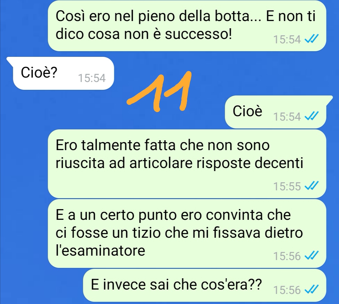 Mentre gusta il primo biscotto – che descrive come delizioso – nota però che il fratello la osserva con un’espressione strana, un sorrisetto trattenuto che ben presto si trasforma in una risata malcelata. Incuriosita, Nicoletta gli chiede il motivo di quella reazione, ma lui si limita a scuotere la testa e a dire solo una frase enigmatica, che si legge all’inizio della chat che ha deciso di condividere.