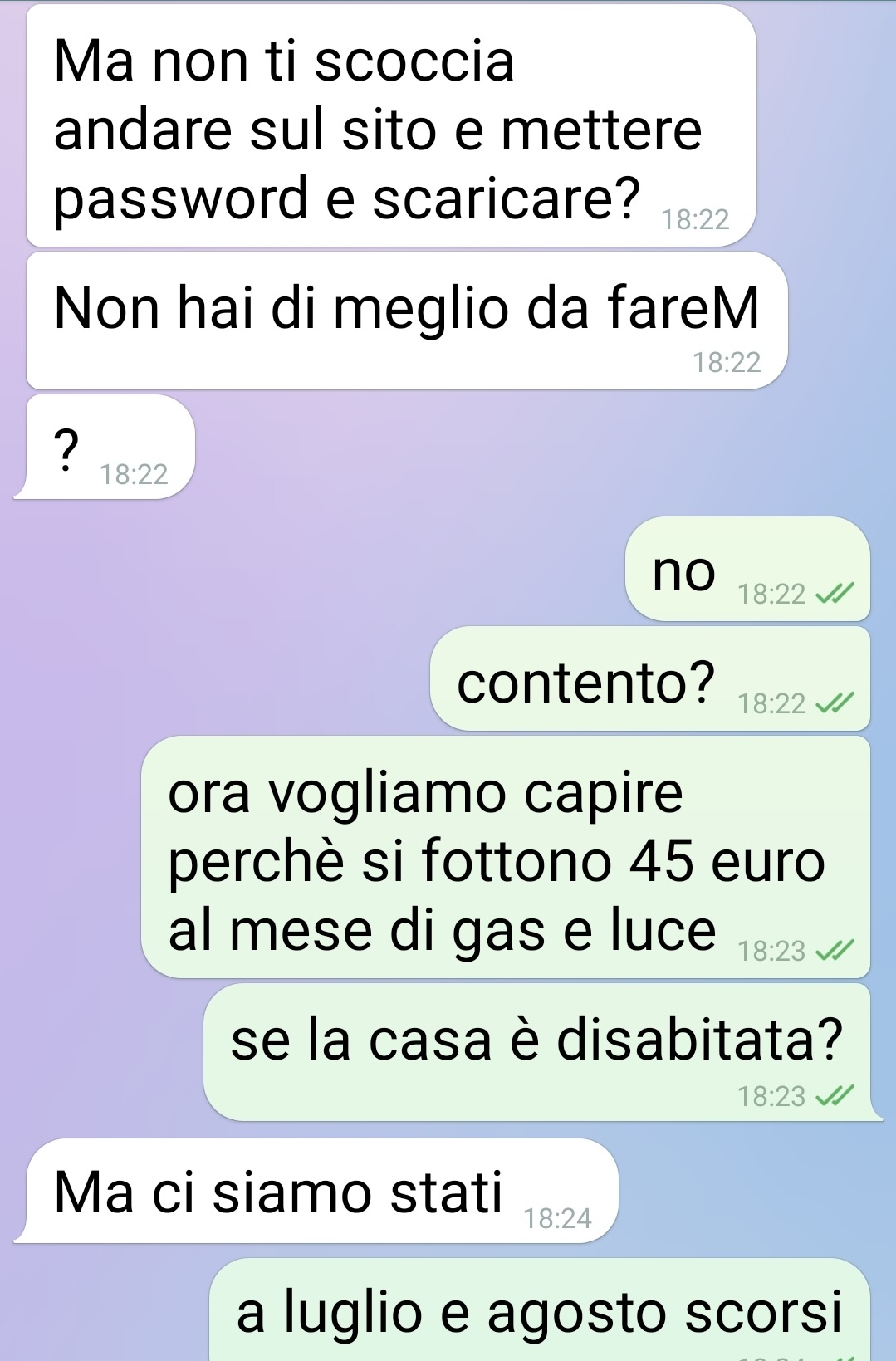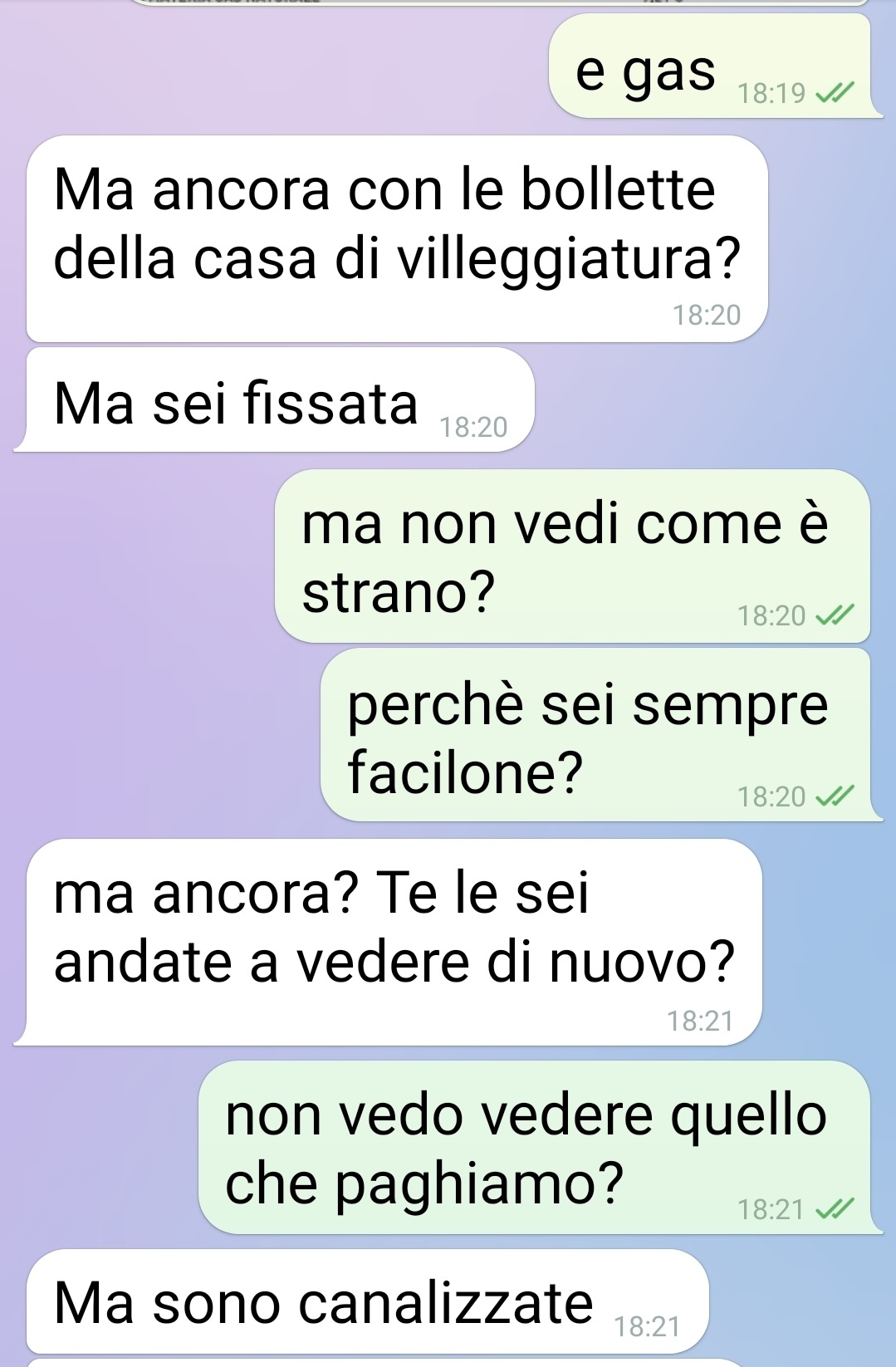 Mio marito insiste nel minimizzare le cifre delle bollette della casa di villeggiatura. Aveva da nascondere qualcosa di grosso. Io sono una donna, una moglie, una madre, una casalinga. E in virtù di tutto questo sono attenta alle spese che sostiene la mia famiglia. Se posso risparmiare qualcosa lo faccio, sperperare non mi piace. E naturalmente non sono propensa a pagare per qualcosa che non uso. Non è ovvio che voglio di conseguenza togliere le utenze dalla casa di villeggiatura che abbiamo? Fino a che nostro figlio aveva una dozzina di anni ci andavamo anche 3 mesi nel periodo estivo, ma adesso che è grandicello ma ancora senza patente… l’anno scorso solo un paio di volte per 2 giorni. E dato che non mi va di fare le grandi pulizie per non godermela… quest’anno ho deciso di non andare proprio. Ma le bollette sono aumentate! Voglio vederci chiaro ma Piero vuole dissuadermi. Alla fine ha parlato. E io sono ancora sconvolta. Non riesco a capire come mi sento. Di sicuro non bene.