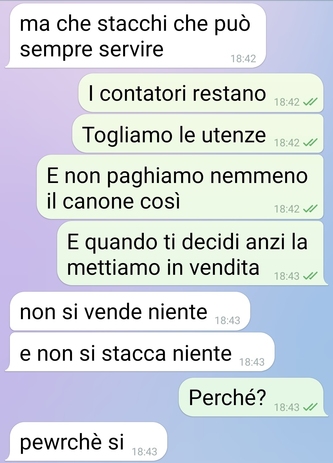 Le bollette dell’ultima stagione sono arrivate enormi: per luce, acqua, gas e altri consumi vari. Carmen chiede a suo marito Piero di togliere alcune utenze dalla casa o almeno metterle in funzione solo quando serve, perché non le sembra giusto pagare un sacco di soldi per un luogo che sta rimanendo praticamente inutilizzato.