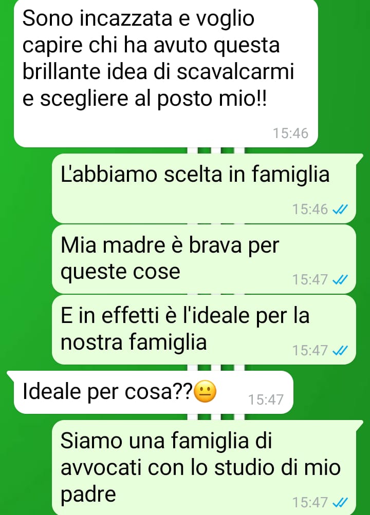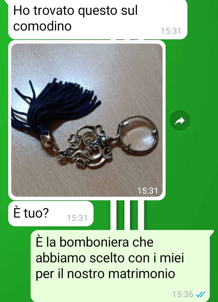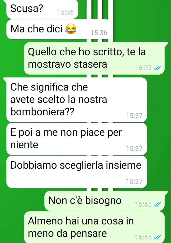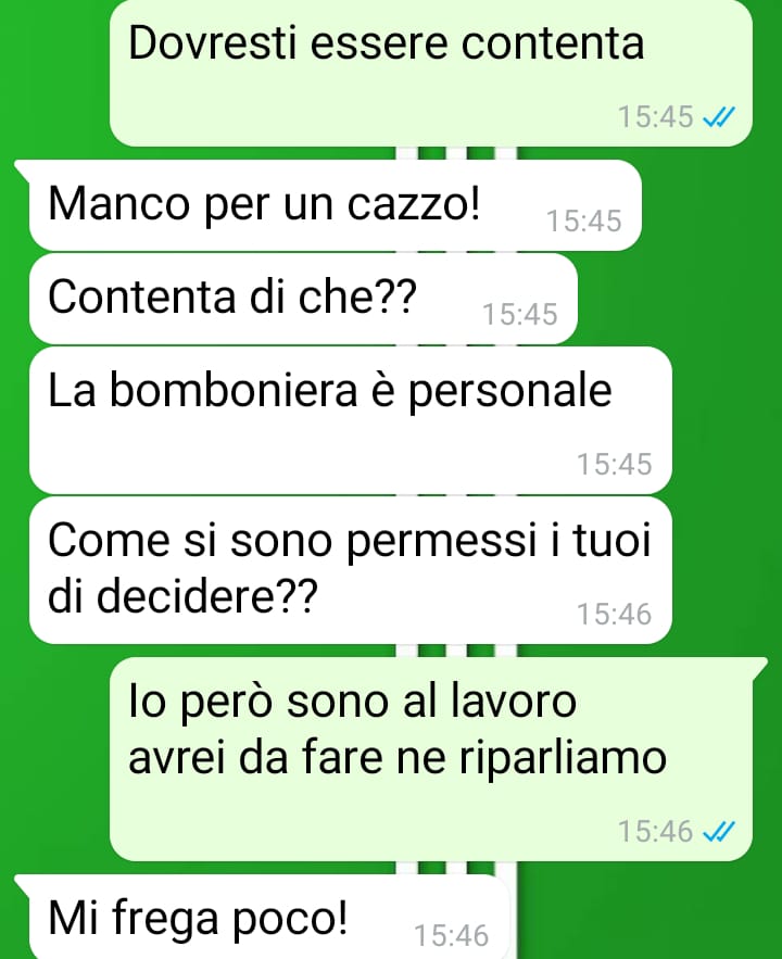 Sono un uomo che sta per sposarsi e siamo nel bel mezzo dell’organizzazione di tan6ssime cose, come tu8 quelli che si sono già sposa6 sanno benissimo. Tra il lavoro e altre cose della rou6ne giornaliera, ho avuto la fortuna di riceve un aiuto dai miei genitori per la scelta della bomboniera per la cerimonia e ho fa?o in modo di farla trovare a casa dalla mia compagna, così che potesse vederla subito. Ero molto entusiasta della scelta e speravo che potesse condividere questa piccola gioia, ma quando ha scoperto di cosa si tra?ava e che mi avevano aiutato i miei genitori a sceglierla, ha reagito davvero molto male. Non so davvero come risolvere questa situazione, che da sciocchezza lei ha trasformato in dramma, perché come vedrete lei mi ha messo davan6 a una decisione che in entrambi i casi mi danneggerebbe a causa dei rappor6 che ho con i miei genitori. Penso che sposarsi significhi esserci per l’altro e capire i suoi bisogni, anche quelli lavora6vi, ma lei non lo sta facendo e vorrei solo farle capire che ricevere aiuto in famiglia non è sempre una cosa nega6va.