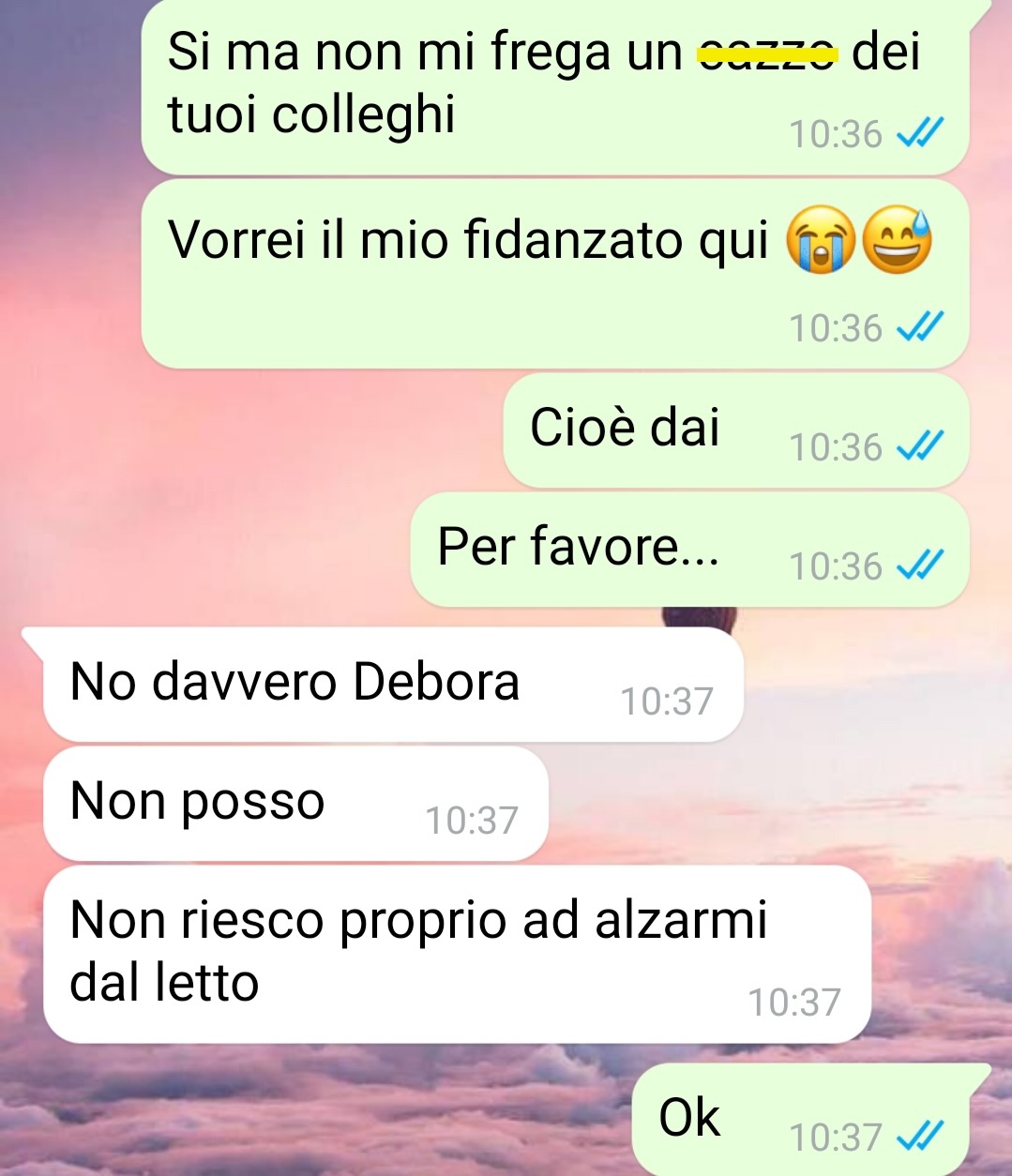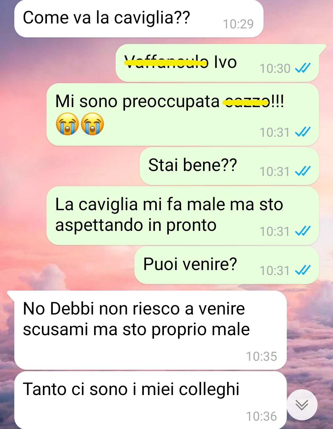 La nostra fan si chiama Debora, ha 31 anni e racconta di aver deciso di inviare degli screen risalenti a qualche tempo fa, che quel giorno aveva mandato alla sua migliore amica. In quel momento, come spiega l’amica, si trovava a vivere una situazione surreale e particolarmente pesante, tanto da essere finita anche al pronto soccorso. Per aiutare chi legge a comprendere meglio il contesto delle conversazioni, la nostra fan fornisce alcune spiegazioni sui protagonisti citati negli screen.