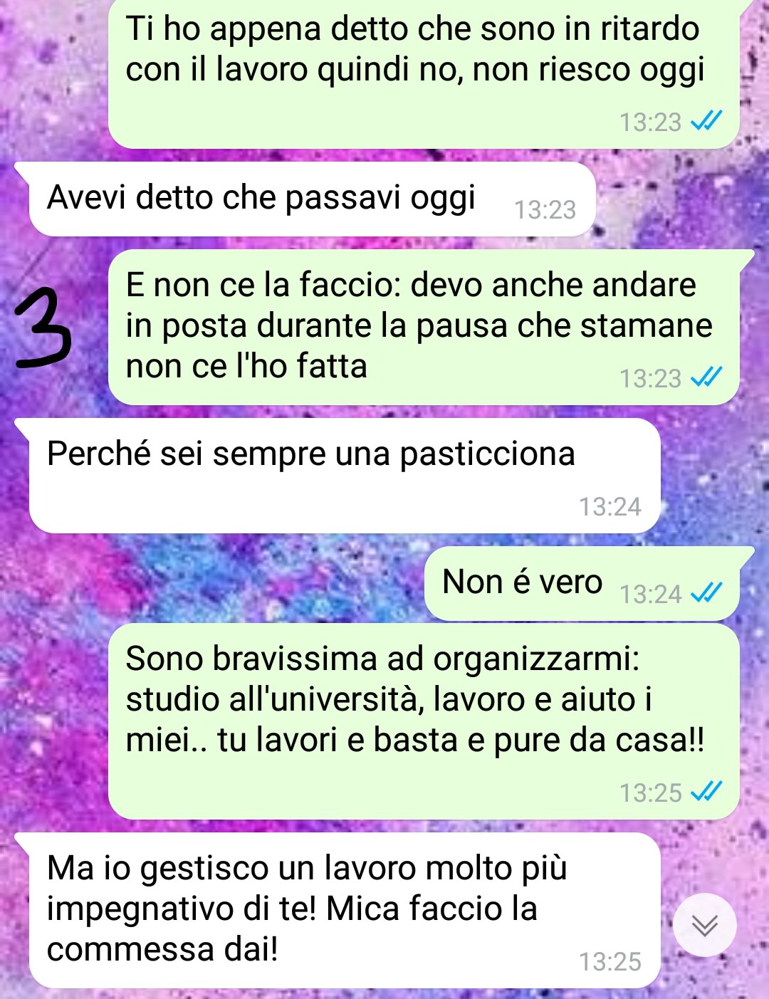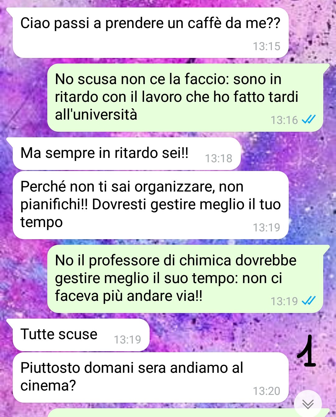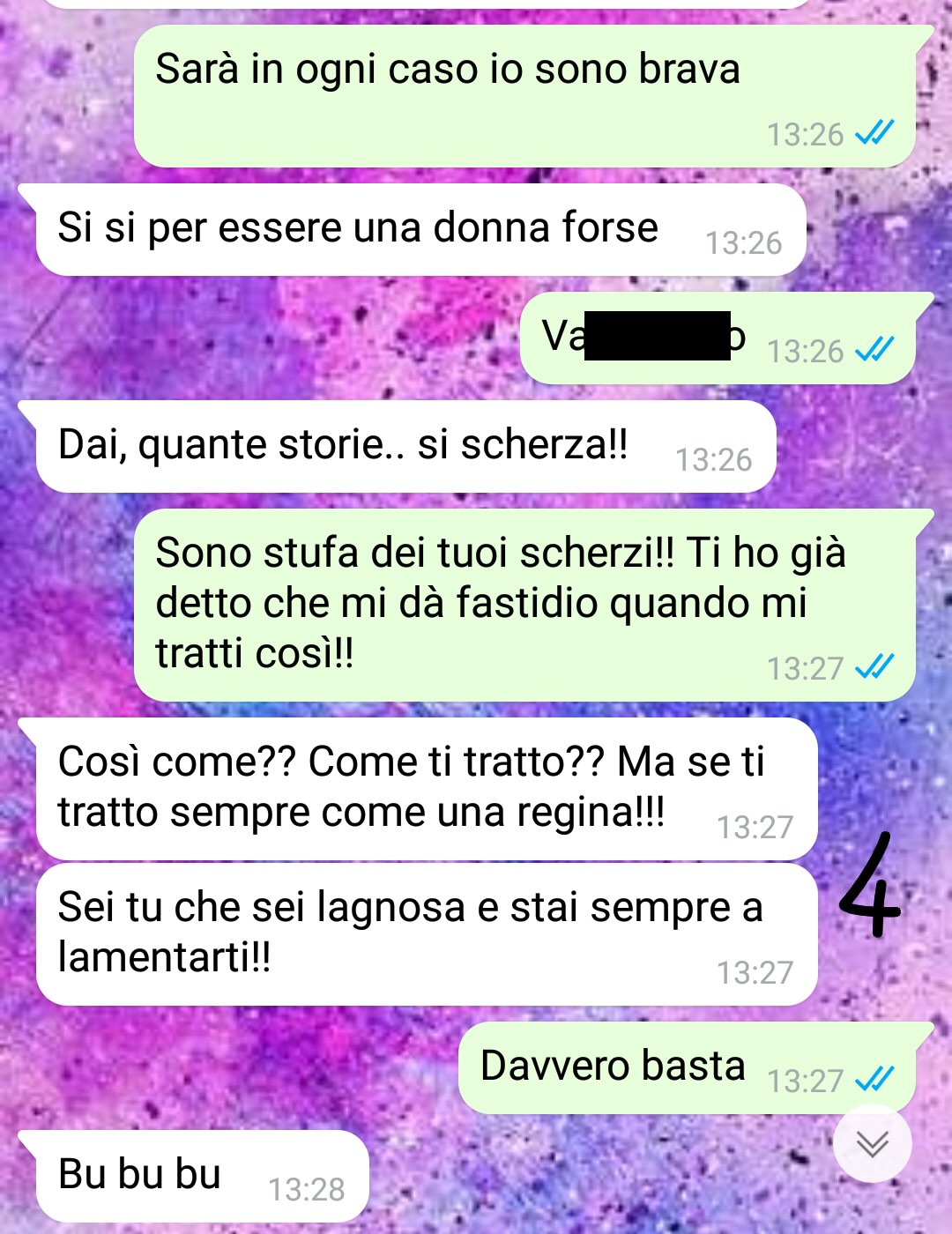 Mi chiamo Diaria, ho 23 anni e sono davvero giù: Marcello, il mio ragazzo mi tratta male.. cioè non è proprio che mi tratti male, non è che mi mette le mani addosso o cosa, ma sta sempre a criticarmi, sminuirmi e prendermi in giro in modo anche molto pesante. All’inizio lo faceva solo in privato, cioè quando eravamo noi due soli ma adesso ha preso a farlo anche quando siamo in pubblico, tipo in un negozio, al supermercato o davanti ad amici e parenti. Io le prime volte non ci ho fatto molto caso: alla fine lui è uno a cui piace scherzare anche in modo molto pesante e pensavo fosse semplicemente il suo modo di fare.. solo che con il passare del tempo è diventata una cosa eccessiva: non si può più avere una conversazione seria che lui subito inizia a sminuirmi e prendermi in giro, impedendomi di esprimere la mia opinione, liquidandomi con lo scherzo (che mi pare anche proprio scherzo non sia..) e dicendomi cose alla fine davvero brutte. Di fatto qualsiasi cosa io dica lui risponde con battute e sarcasmo, così io non ho più voce in capitolo su nulla! Insomma lui fa il bullo, io mi sento bullizzata!! Il problema più grave è che noi dovremmo andare a vivere insieme e mi chiedo come sarà la mia vita se lui continua a trattarmi così!! Certamente lo fa perché è insicuro e io ho provato a spiegargli che non mi va bene ma nulla è cambiato… l’altro giorno non ci ho visto più…