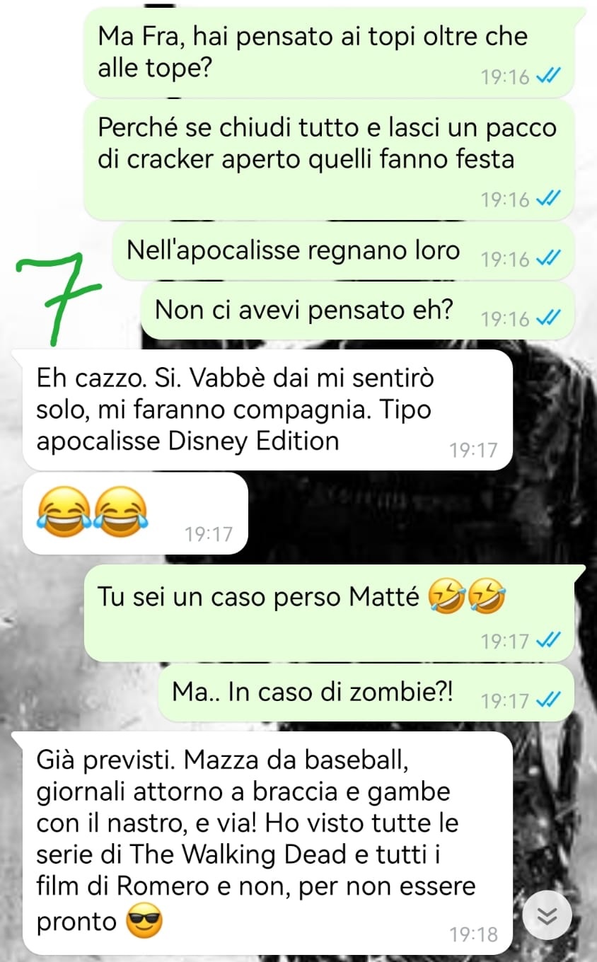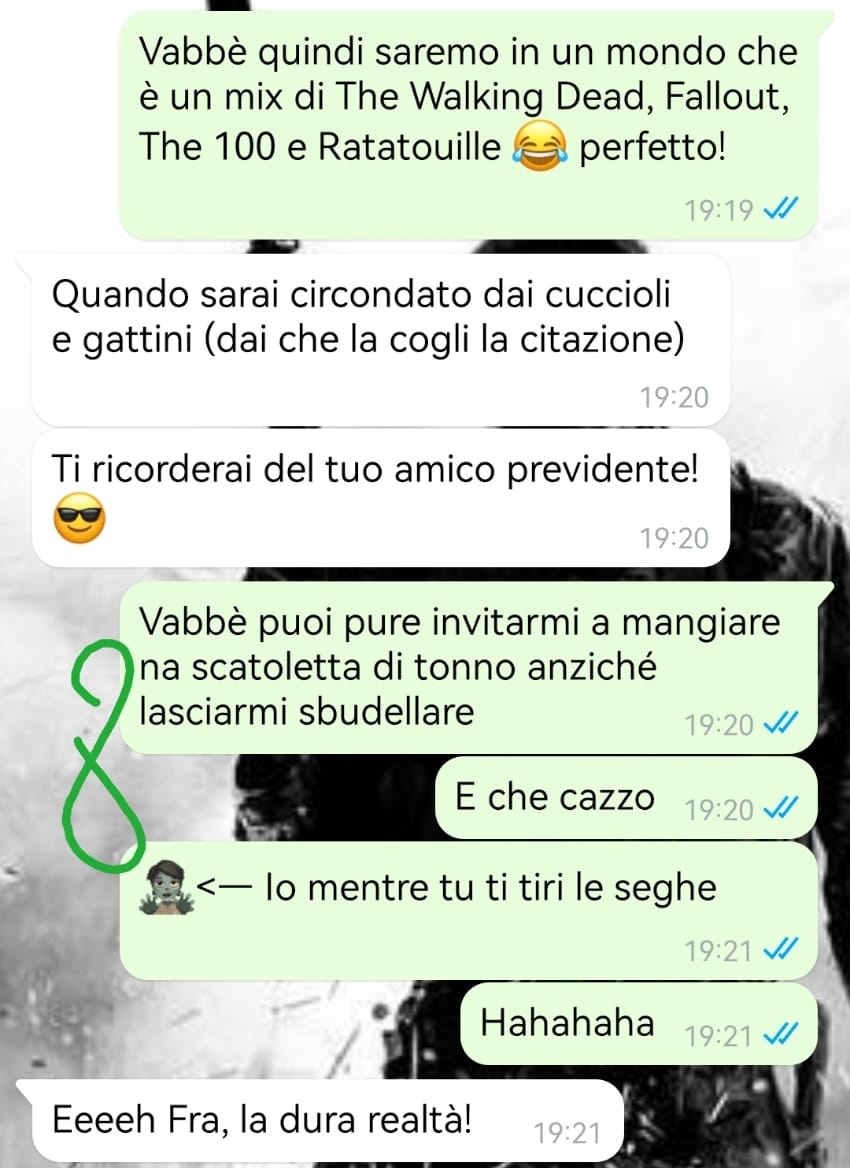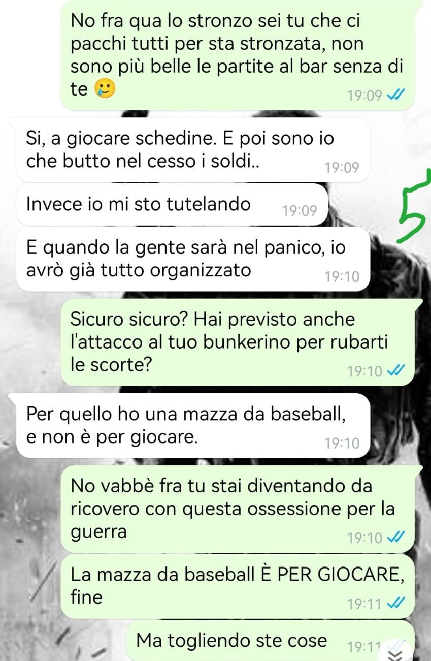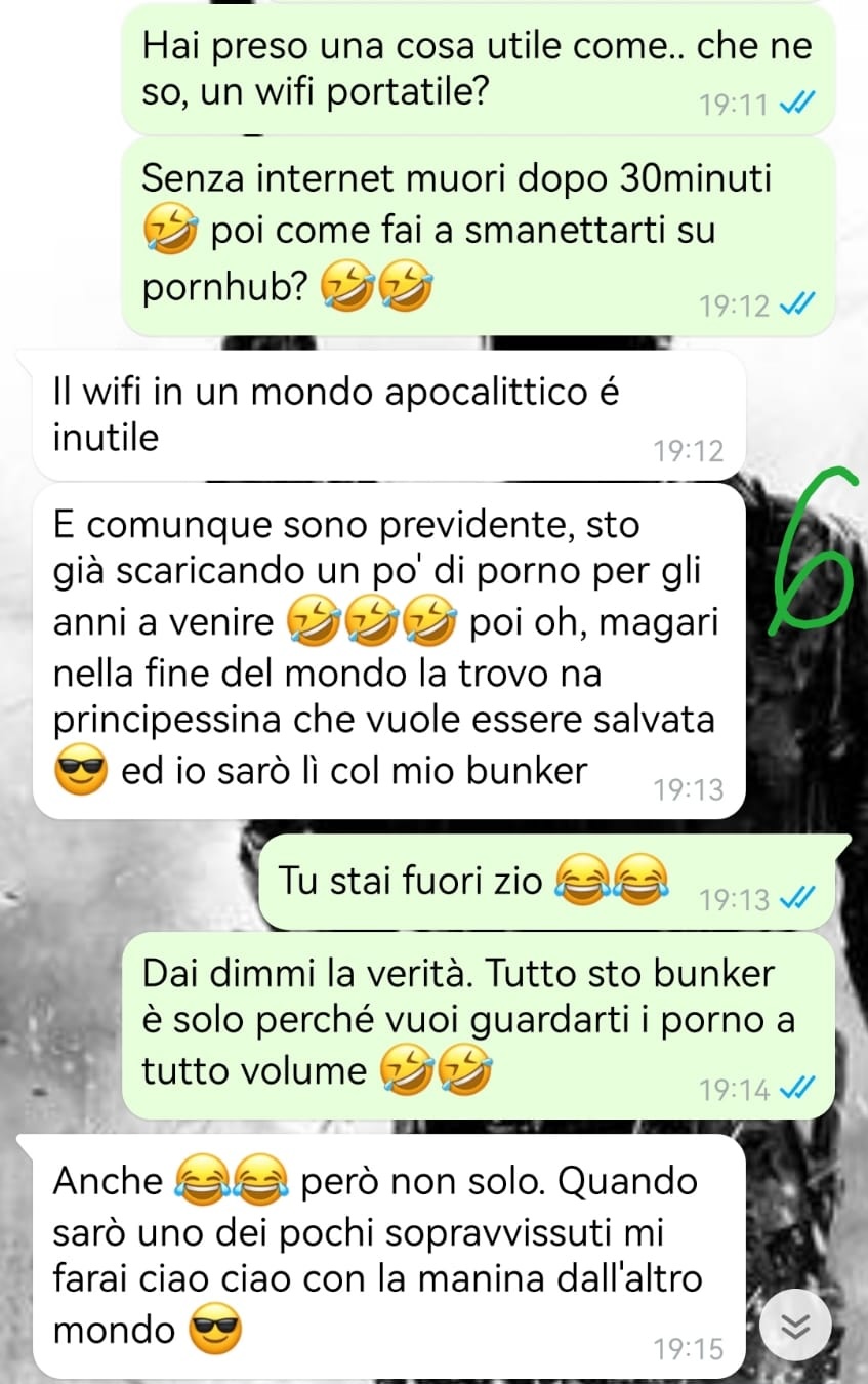 Il nostro fan racconta di avere un amico di nome Matteo, che descrive come una persona dal carattere particolare e dalle reazioni piuttosto estreme. Questo follower spiega come il suo amico trasformi ogni piccola notizia in un segnale dell’apocalisse imminente: un missile lanciato diventa presagio di guerra mondiale, un blackout di dieci minuti viene interpretato come invasione aliena, mentre un temporale più intenso del normale fa pensare agli zombie. La nostra amica paragona la mente di Matteo a un mix tra The Walking Dead, Mad Max e i documentari sui Doomsday Preppers, evidenziando come ogni evento venga filtrato attraverso questa lente catastrofista.