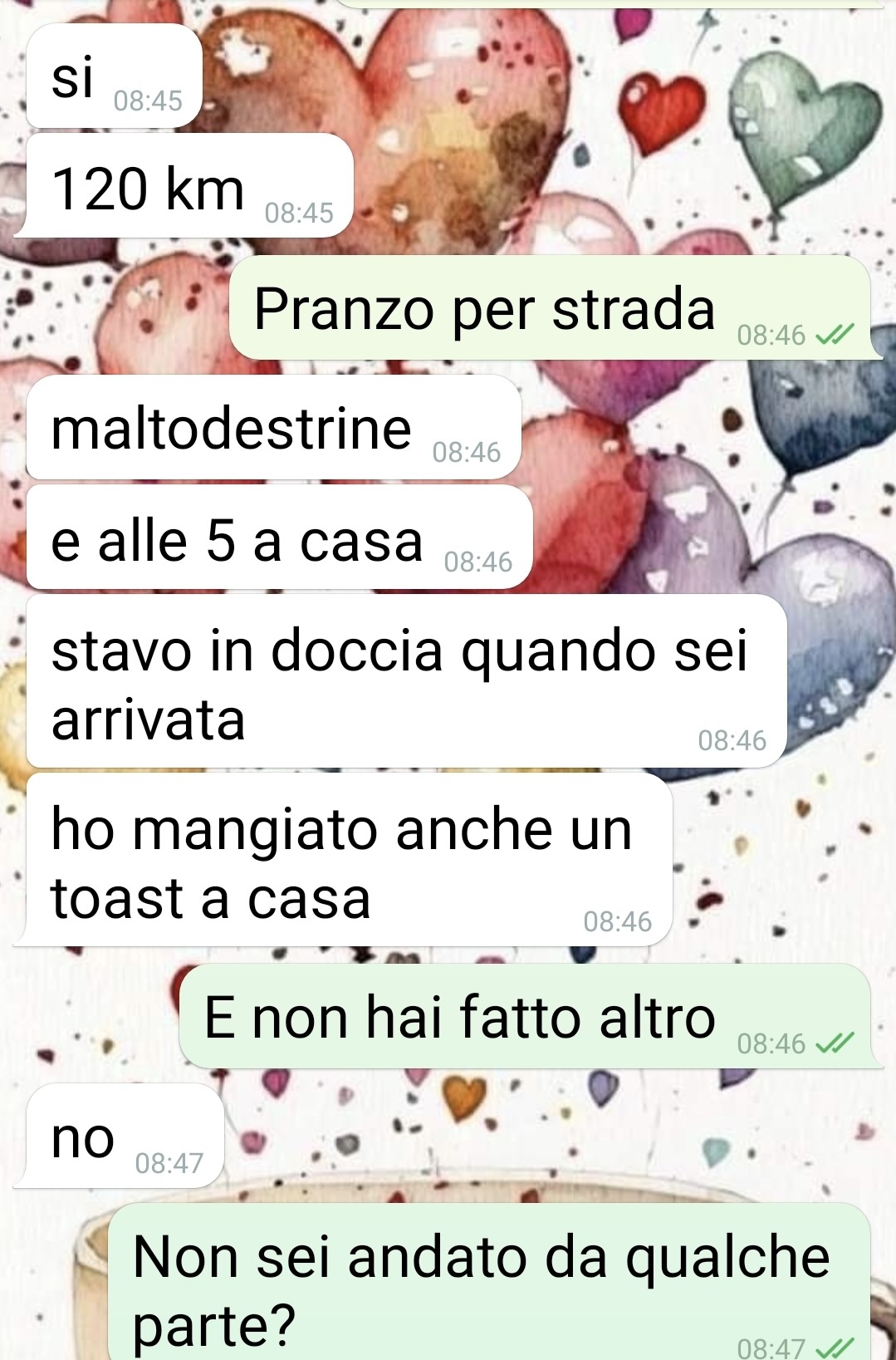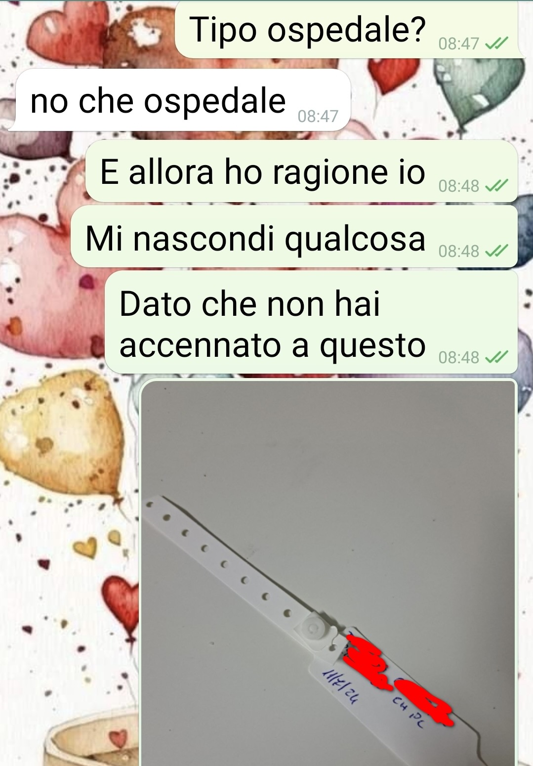 Il mio compagno è la persona più buona e disponibile al mondo. Un buon samaritano pronto a correre in aiuto di chi ha bisogno. Anche e soprattutto della ex… Sono a casa in attesa del fabbro, e intanto vi mando questa chat che mi ha dato tanto da pensare. Ho litigato con il mio compagno (stiamo sotto lo stesso tetto da meno di 4 mesi) perché mi ha mentito. una bugia bianca dice lui. Qualcosa di molto peggio, a prescindere dalle implicazioni “cornutesche” (che magari realmente non ci sono) dico io. Ieri come al solito ogni giovedì, che non ha lavoro, è andato a farsi il suo giro in bici con l’amico. Si sparano più di 6 ore ogni volta. Ma stamattina ho trovato nei suoi pantaloni qualcosa che non doveva esserci. Un braccialetto da ospedale, con tanto di data e nome. La sua ex. Era in bici o in ospedale? E perché? E perché non mi ha detto niente? Tutte cose che ho chiesto immediatamente poco fa. Quello che risponde lo trovate negli screen. Sbaglio io secondo voi?
