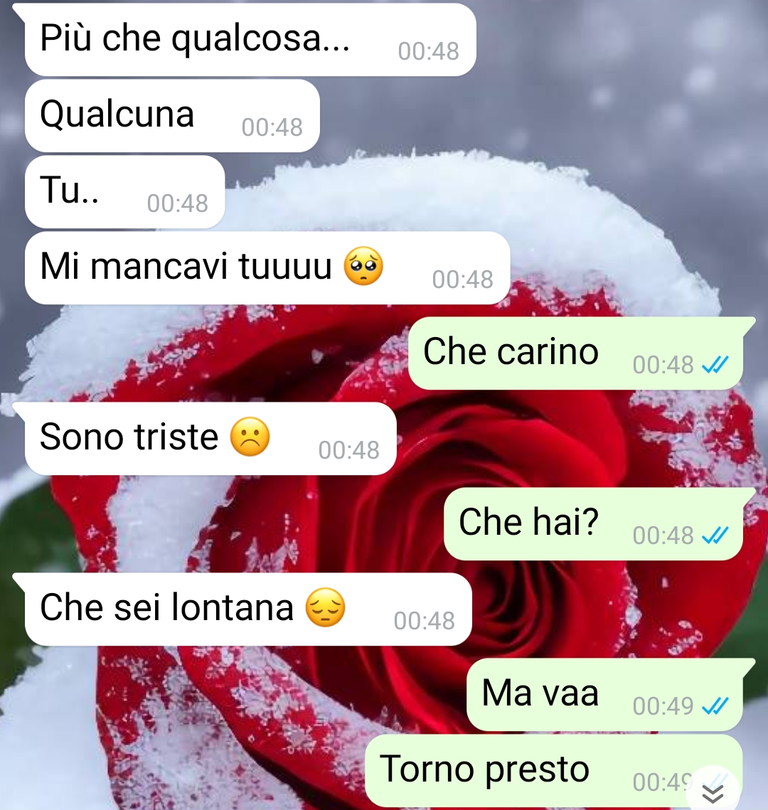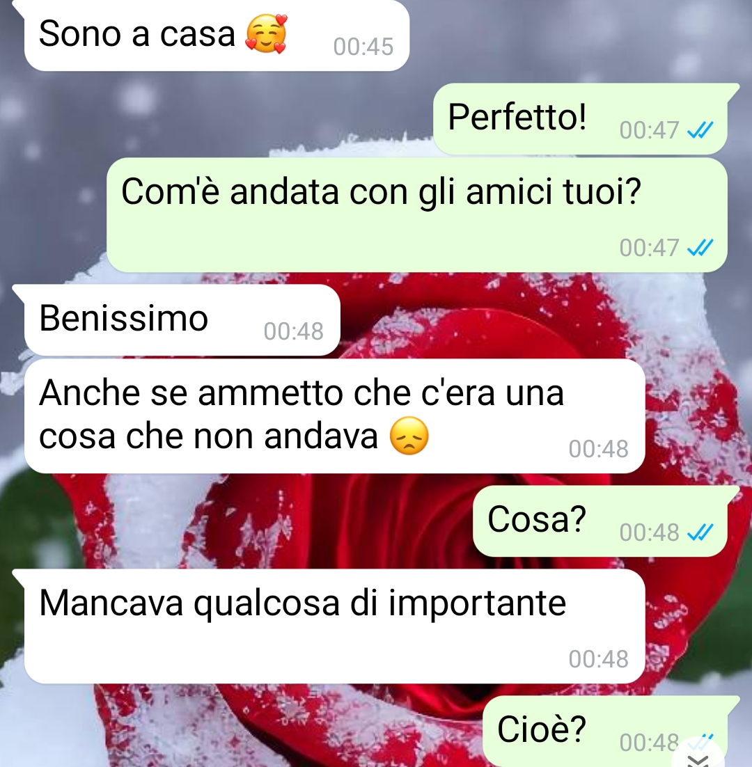 Cosa ho fatto di male per trovarmi un ragazzo così strano? No, in realtà all’inizio ero felice che fosse un tipo molto affettuoso, carino, disponibile e coccolone. Non amo quelli che devono fare i spacconi, i taciturni che se la tirano e non vogliono esprimere i propri sentimenti, e ne ho avuti tanti così. Con Andrea pensavo sarebbe andata diversamente ed effettivamente lui si comportava in modo assolutamente opposto. Spesso mi hanno detto che sembravamo io il ragazzo e lui la ragazza, e invece era l’esatto contrario. Io sono Teresa e scrivo in modo normale, lui invece mette cuoricini ovunque ed emoji e scrive cose un po’ sceme o romantiche. Mi è sempre piaciuto per questo suo lato così dolce e smielato, ma è anche vero che questa cosa ha iniziato a non funzionare più quando mi sono dovuta trasferire per un breve periodo più vicina ai miei. Dovete sapere che io e lui ci siamo conosciuti nella stessa città quando io vivevo da sola, ormai 3 mesi fa, ed è andato tutto bene perché lui è del mio stesso palazzo, vive con i suoi e ci vedevamo praticamente sempre. Sono dovuta andare dai miei e lui ha visto questa cosa come l’inizio di una storia a distanza, cosa che di fatto non è. La prima sera lui esce con dei suoi amici, torna tardi e tutto sembra normale, se non fosse che inizia a fare strani discorsi.