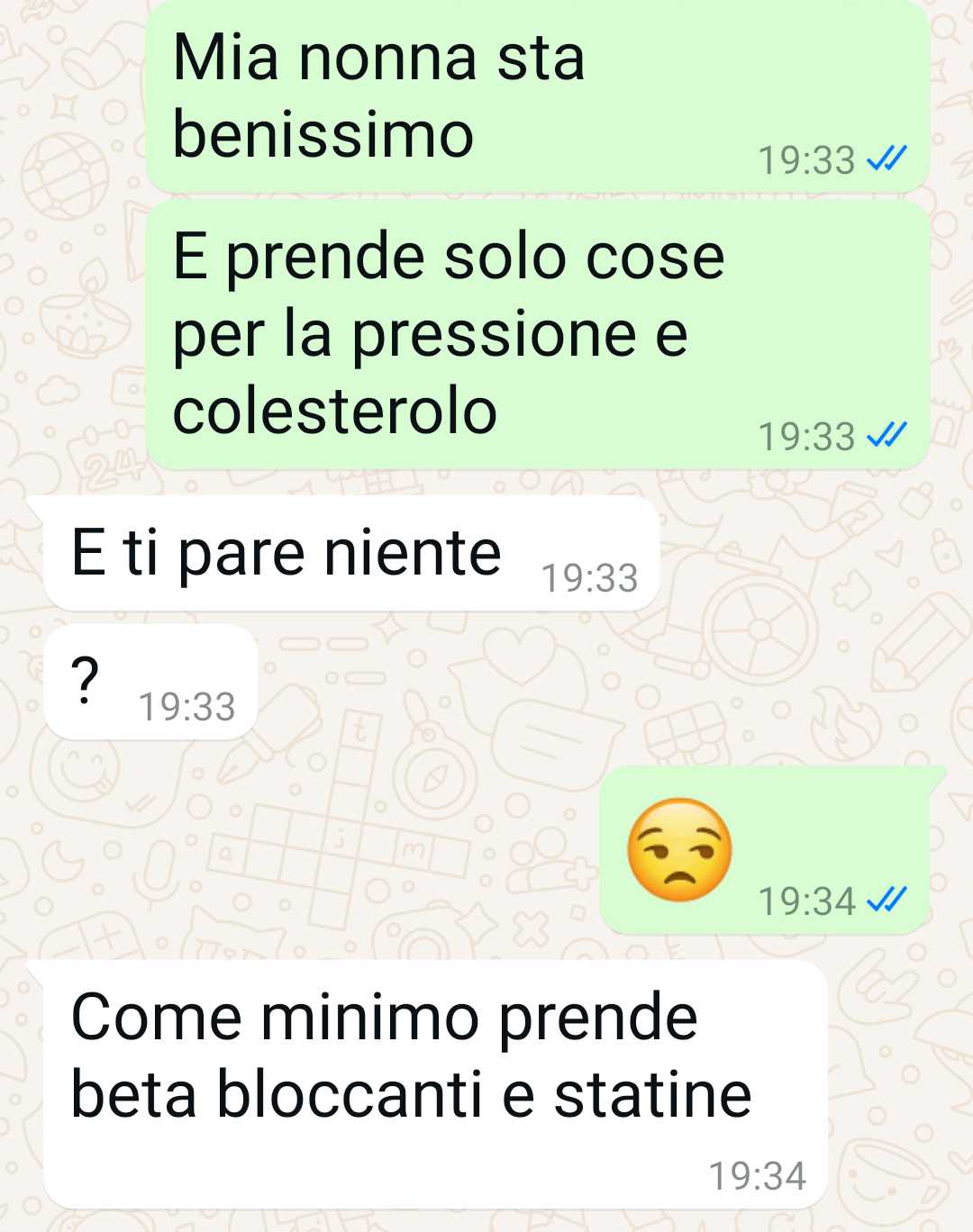 La mia fidanzata vuole regalare un buono farmacia a mia nonna. Ho dovuto dirle una cosa ca8va per farla ragionare. La mia ragazza pensa che alle persone avan; con gli anni (non voglio dire anziane) fa piacere ricevere un bel buono di 50 euro, ;po buono amazon, per comprar; quello che vuoi, dagli integratori alle supposte di glicerina. Io non la penso coì. Ho una nonna molto giovane e vivace. Una nonna forte che ne ha viste di coEe e di crude e che ha forgiato la sua pellaccia dura a suon di schiaffi della vita. La mia ragazza però dice che no, il buono le farebbe tanto piacere. Se n’è par;ta proprio per la tangente. MI ha proposto una serie di simpa;ci acquis;, tu8 assurdi. Ho dovuto dirle una cosa ca8va. Farla ragionare sul perché pensa che un buono per la farmacia sia per lei un bel regalo. Mi è dispiaciuto farle del male, ma un po’ me lo ha ;rato fuori di bocca. Ho scoperto però che la sua idiosincrasia per le persone coi capelli bianchi non nasce dal nulla. Ho scoperto che ha avuto proprio un trauma.