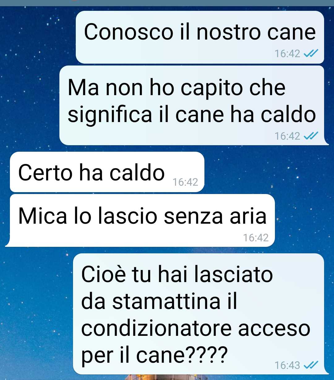 La mia compagna ha lasciato il condizionatore acceso tutto il giorno per il cane. Ero tornato a casa, dopo una giornata infernale a lavoro. Entro in salotto e trovo il condizionatore acceso. Mi sono arrabbiato. Ero certo che la mia compagna se lo fosse dimenticato acceso. Invece no. Freschissima mi dice che no, non se lo è dimenticato acceso. No, lei lo ha lasciato acceso per il cane. Cioè io penso alla fame, alla carestia, alle pestilenze e lei spreca energia e soldi per il cane, perché il cane ha caldo. Ho cercato di farla ragionare. Ho cercato di spiegarle. Noi viviamo in un appartamento in centro città. Siamo solo io e lei. Ci dividiamo tutte le spese, affitto, bollette, spesa. Tutto 50 e 50. Alla fine però mi è finita male. Dopo avere discusso, la situazione è peggiorata. È proprio vero che non c’è limite al peggio e ora mi ritrovo in una situazione più spinosa e spiacevole di prima. Avrei voglia di prendere quel cane e dirgli “benissimo vuoi l’aria condizionata anche tu? Inizia a lavorare!” Che tanto i lavori da cane non mancano mai.