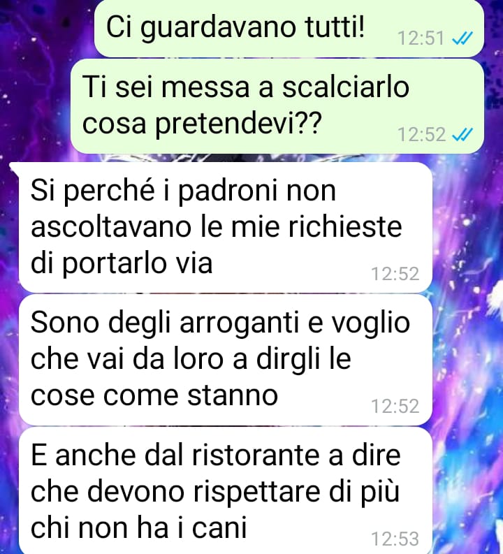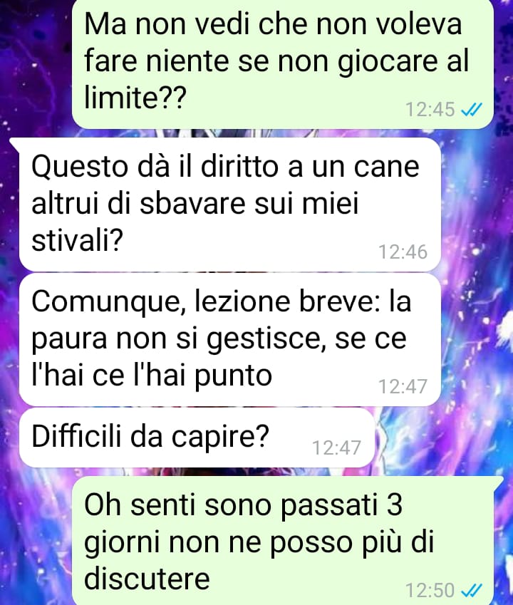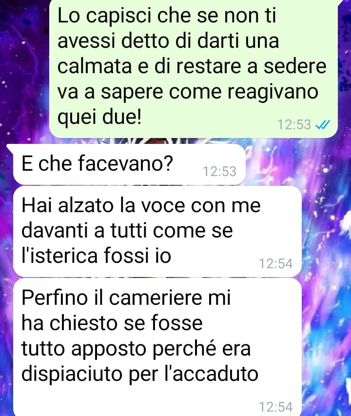 Racconta che la sua reazione, durante l’episodio in questione, è stata dettata dal buonsenso: trovandosi a interagire con persone sconosciute, ha preferito mantenere la calma e il controllo. A suo avviso, chiunque al suo posto si sarebbe comportato allo stesso modo. Angela, invece, ha interpretato la situazione in modo completamente diverso, arrivando a fargli una richiesta che lui considera assurda e completamente illogica.