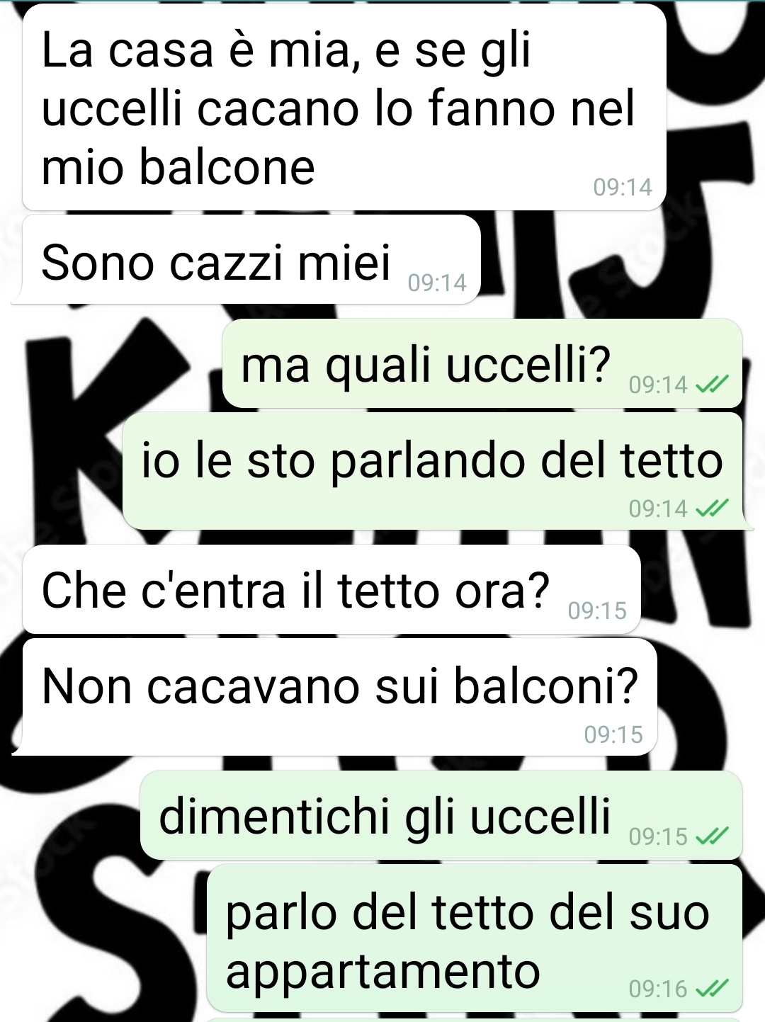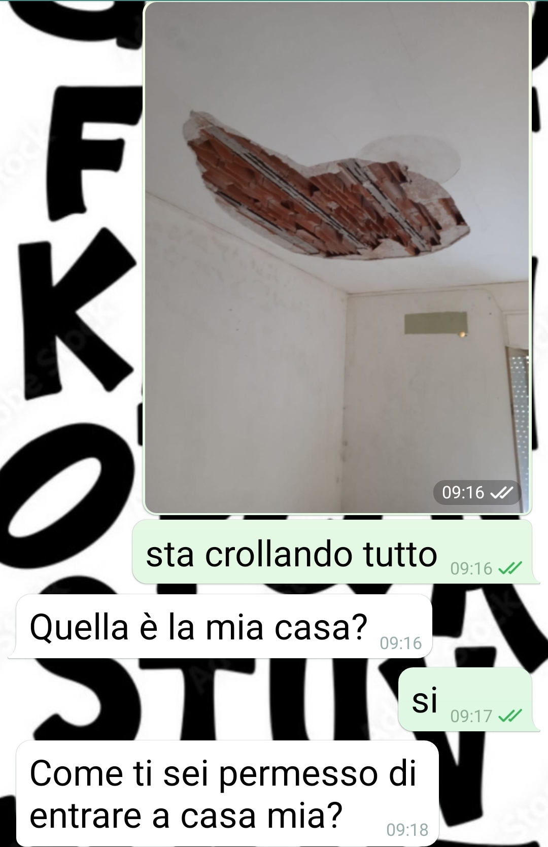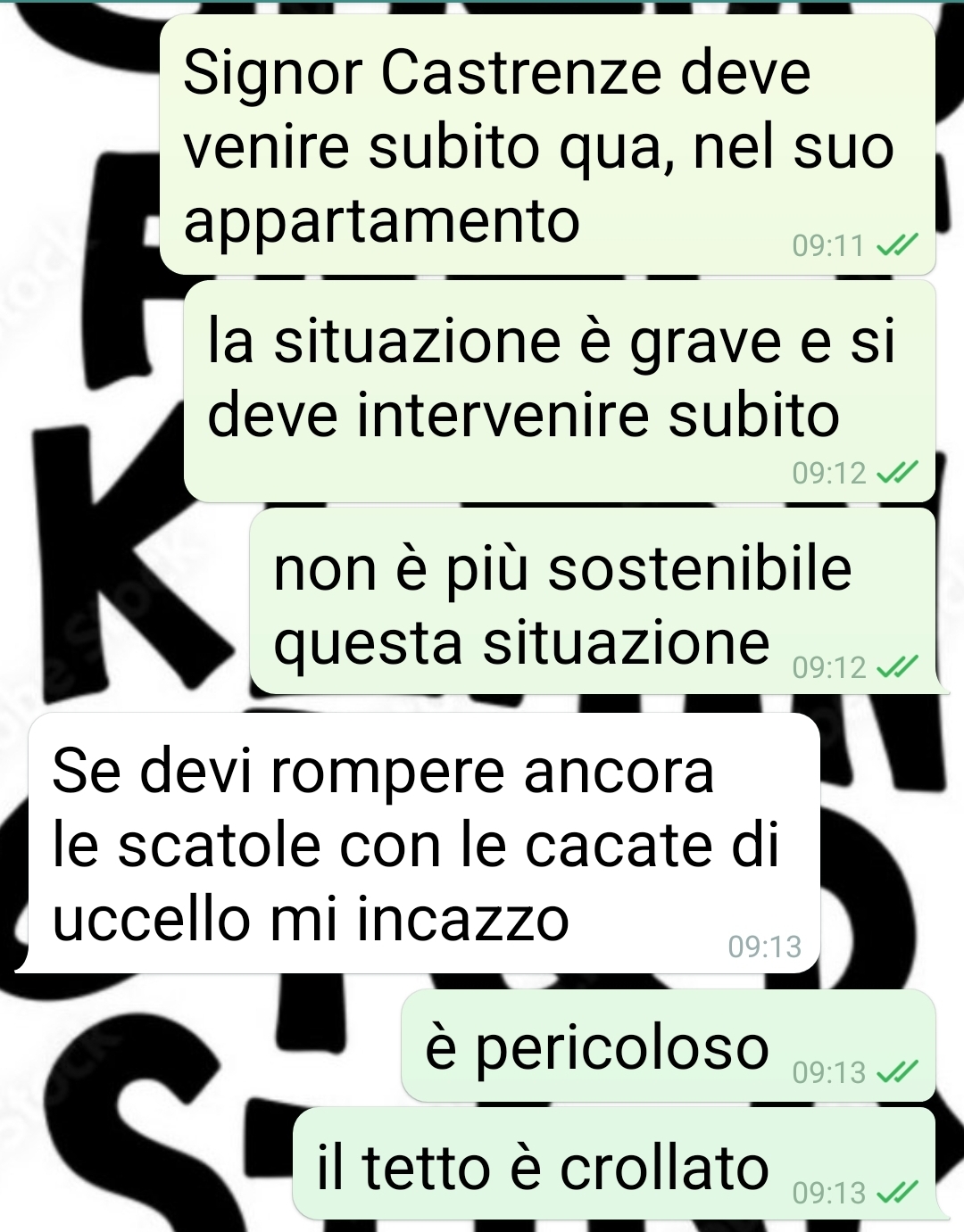 Stamattina sono dovuto scappare da lavoro per tornare a casa. Mia moglie ha sentito un crollo e un boato sul nostro soffitto. Ma il proprietario dell’appartamento di sopra non vuole conciliare. Con questo signore, Castrenze, ho sempre avuto problemi, sin da quando mi sono sposato e ho ristrutturato l’appartamento al primo piano, sotto al suo, che mi ha lasciato in eredità mio padre. Ah papà, buonanima, me lo diceva sempre che con questo Castrenze meglio starci alla larga. Ma infatti lui abita lontano. Non ci avrò tanto a che fare pensavo. Invece… invece non ha mai voluto neanche mettere un po’ di filo spinato per impedire agli uccelli di riempire di guano i suoi balconi. Ma stavolta la cosa è troppo seria. Il suo appartamento sta letteralmente crollando sul mio. Parliamo di rischi seri, non di sporco e puzza. E invece si è dimostrato per quello che è, anzi ancora peggio. Quasi che la comprerei davvero la sua casa per togliermelo di torno per sempre. Guardate che discorsi mi ha fatto!