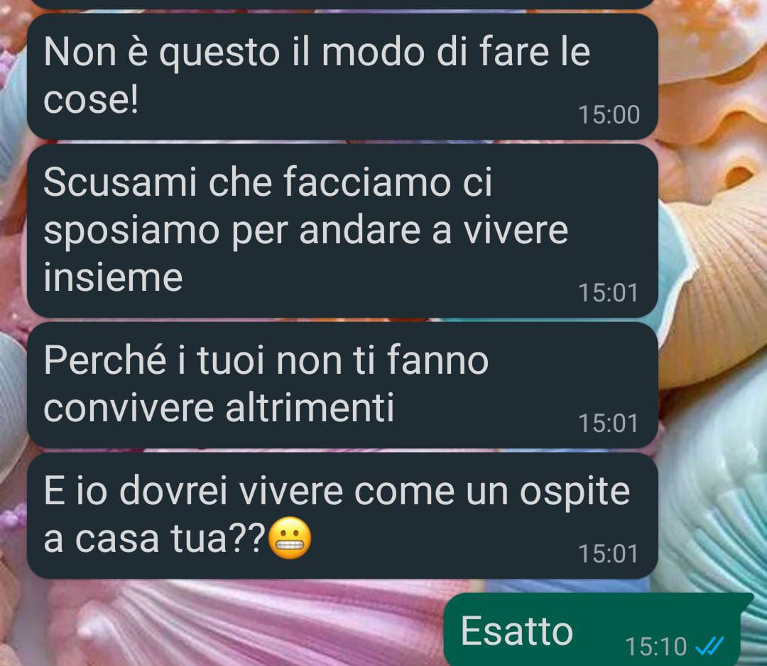 La nostra fan ha voluto condividere un episodio delicato e attuale della sua vita sentimentale. Da quattro anni è fidanzata con un ragazzo con il quale aveva deciso di compiere un passo importante: sposarsi e andare a vivere insieme. Tuttavia, per lei la convivenza prima del matrimonio non è un’opzione possibile, sia per convinzioni personali, sia per rispetto verso la sua famiglia, in particolare verso i suoi genitori che non avrebbero mai accettato una convivenza fuori dal vincolo matrimoniale.