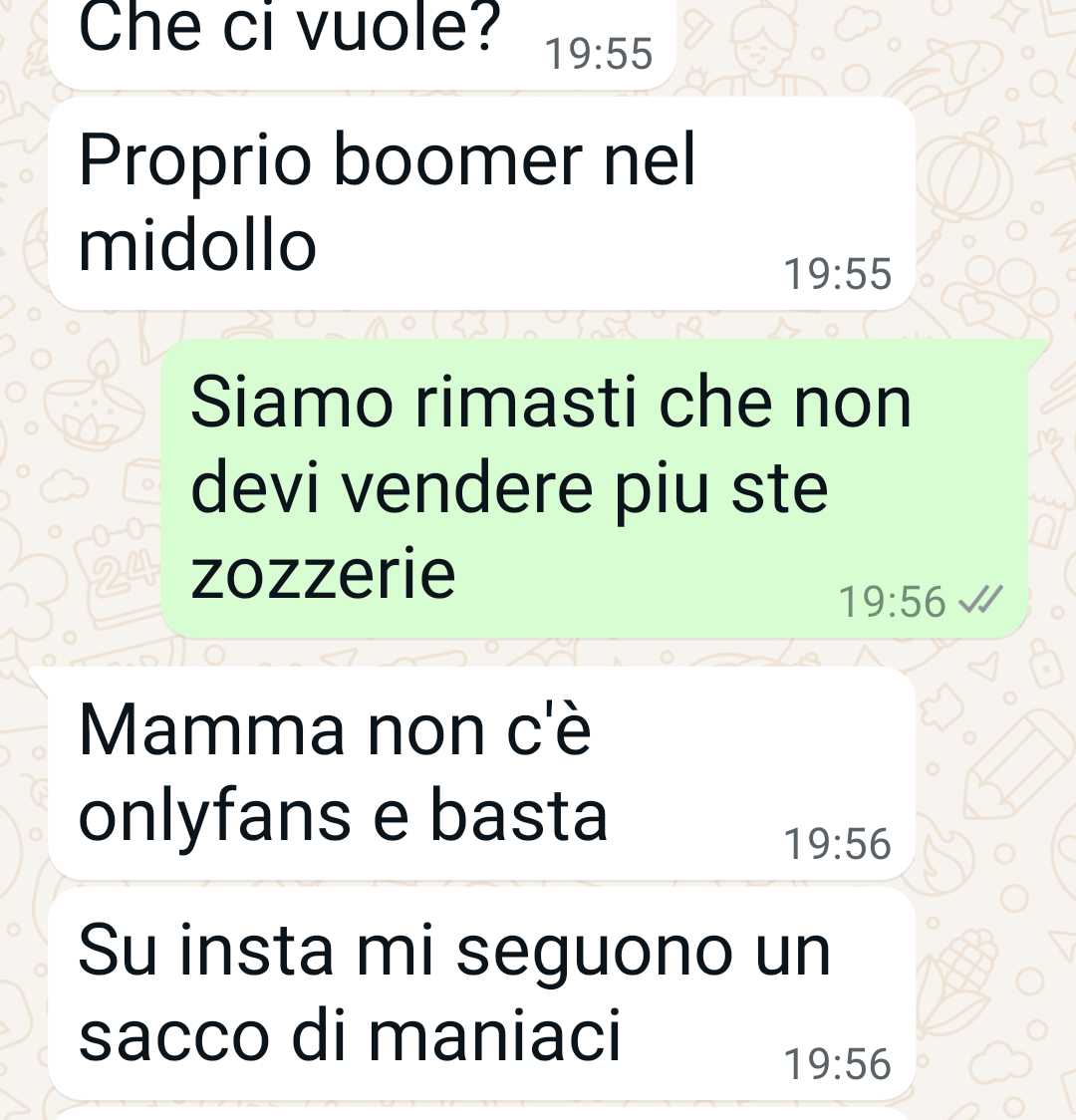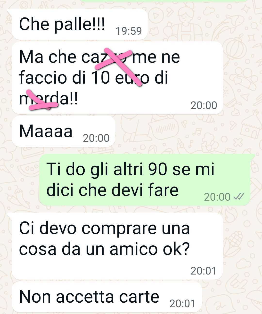 La nostra amica precisa che la figlia possiede già una carta prepagata che lei ricarica ogni mese con 300 euro. Nonostante questo, la ragazza ha chiesto altri 100 euro, specificando di volerli in contanti, o “cash”, come dice lei. La nostra fan racconta di aver scoperto a cosa le servono questi soldi e lascia intendere che il motivo potrebbe essere facilmente immaginabile da chi ha figlie di 18 anni.