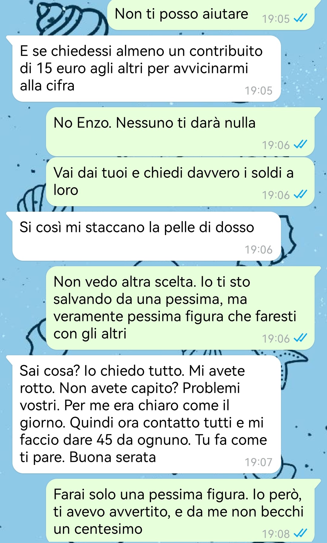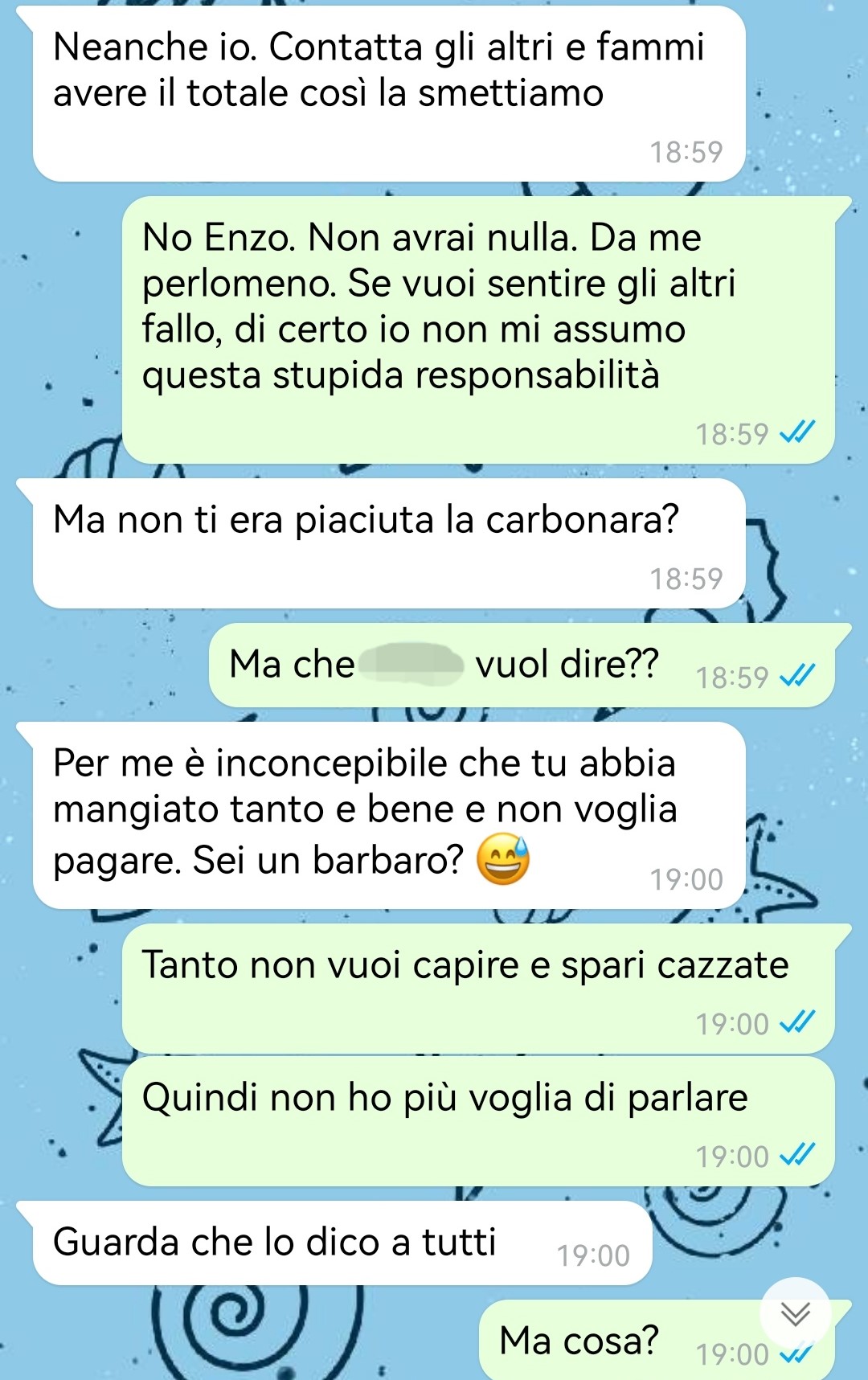 Enzo, infatti, non scriveva per ringraziare o per ridere dei postumi della serata, ma per un motivo che il nostro amico definisce assurdo e sconvolgente. Quella che sembrava una normale chiacchierata post-festa si è trasformata rapidamente in qualcosa di molto diverso, in cui Enzo – a suo dire – ha mostrato il lato peggiore di sé. Un atteggiamento inaspettato che ha lasciato l’interlocutore incredulo, e che ha spinto il nostro fan a inviare la conversazione a Commenti Memorabili, per condividere con altri lettori quello che può succedere anche dopo la festa più riuscita, quando il vero volto delle persone viene fuori nel modo più impensabile.