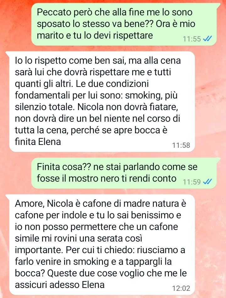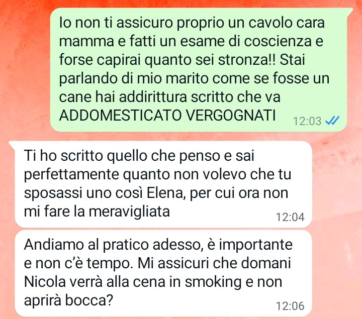La nostra follower sottolinea come, da oltre un mese, la madre sia completamente assorbita dai preparativi di una cena destinata ai membri del circolo di golf del padre. Un evento mondano che per i suoi genitori rappresenta un appuntamento di fondamentale importanza, tanto da mettere in secondo piano ogni altra cosa, compresi gli affetti più stretti. Elena, infatti, racconta di essere stata coinvolta, più volte e controvoglia, nei preparativi, venendo costantemente assillata da richieste e pressioni.