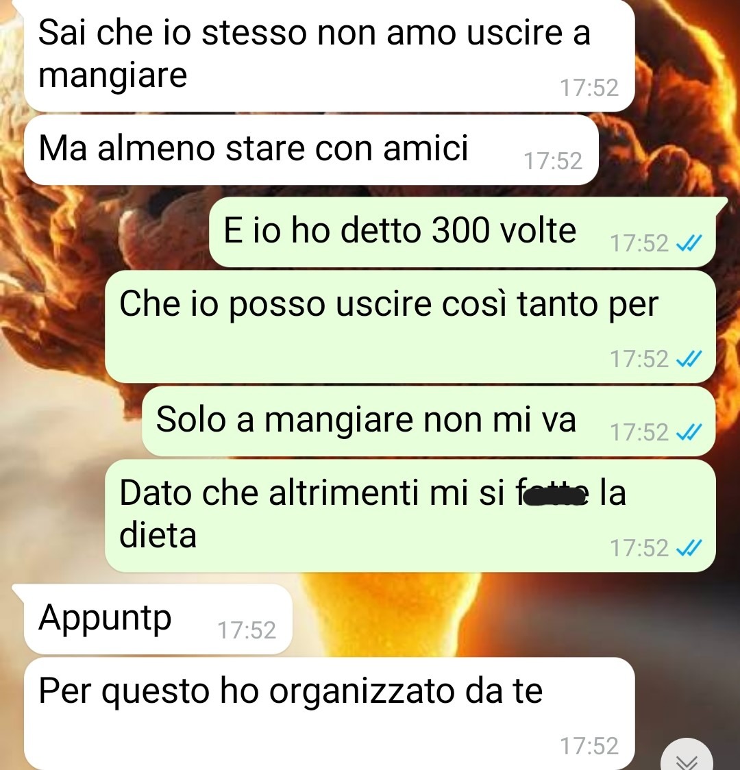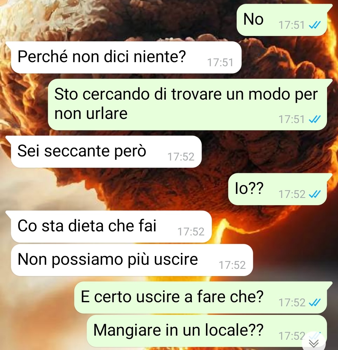 Sono Jessica e sto affrontando un periodaccio. Ho sempre avuto un fisico ben curato, avevo una dieta equilibrata e andavo in palestra ogni due giorni allenandomi tanto. Poi ho iniziato un lavoro che mi ha impedito di andarci, talmente stressante che ho veicolato le mie ansie e stress verso il cibo e ho preso parecchio peso. So che ci sono molte persone a cui non importa, ma a me sì e mi dispiace che a causa dello stress poi devo strafare e mangiare troppo. Per questo motivo ho ripreso a fare una dieta più ferrea e sto iniziando a perdere peso e ad avere risultati, anche se l’ombra di divorare la qualsiasi è dietro l’angolo. La mia dieta mi impone di avere un pasto a settimana in cui posso mangiare qualcosa di un po’ più goloso e siccome io di per sé sono una persona golosa mi organizzo sempre in modo tale da poter mangiare quello che mi piace anche perché solo una volta a settimana va a finire che non fai altro che aspettare quel giorno lì. Ora il problema è che io sto con Daniele, un ragazzo che pure lui è molto curato nel fisico, ma dato che lui se mangia troppo poi si distrugge di allenamento in palestra perché tanto è un personal trainer, sta continuando a fare cose che mi infastidiscono e rovinano i miei piani e la mia dieta. Soprattutto quando organizza cene senza interpellarmi nel mio giorno di libertà.