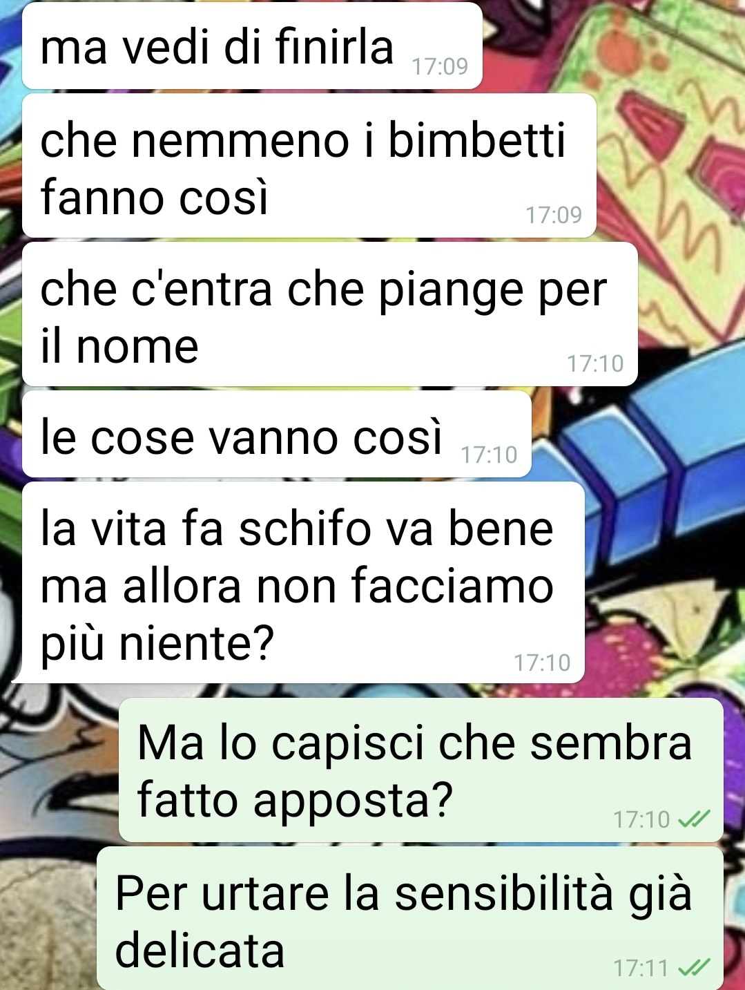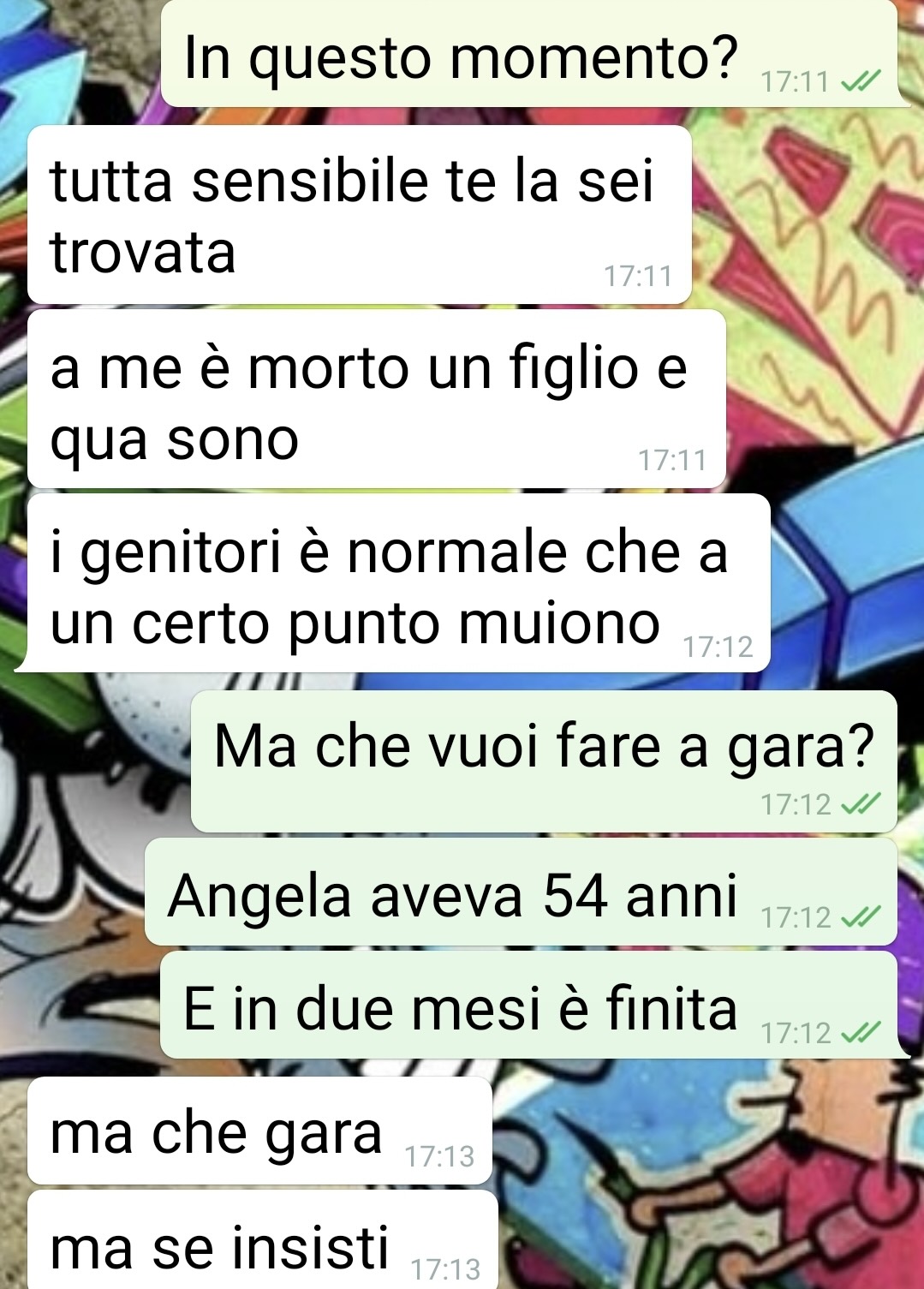 La chat che ha deciso di condividere è il tentativo di farle capire il dolore e la rabbia che ha provocato. Un confronto diretto, a tratti acceso, in cui il nostro amico cerca disperatamente delle risposte, un’assunzione di responsabilità, un minimo di autocritica. Ma, come lui stesso ammette con amarezza, si è trovato a parlare con un muro di gomma: ogni parola, ogni argomentazione, sembrava rimbalzare senza lasciare traccia.