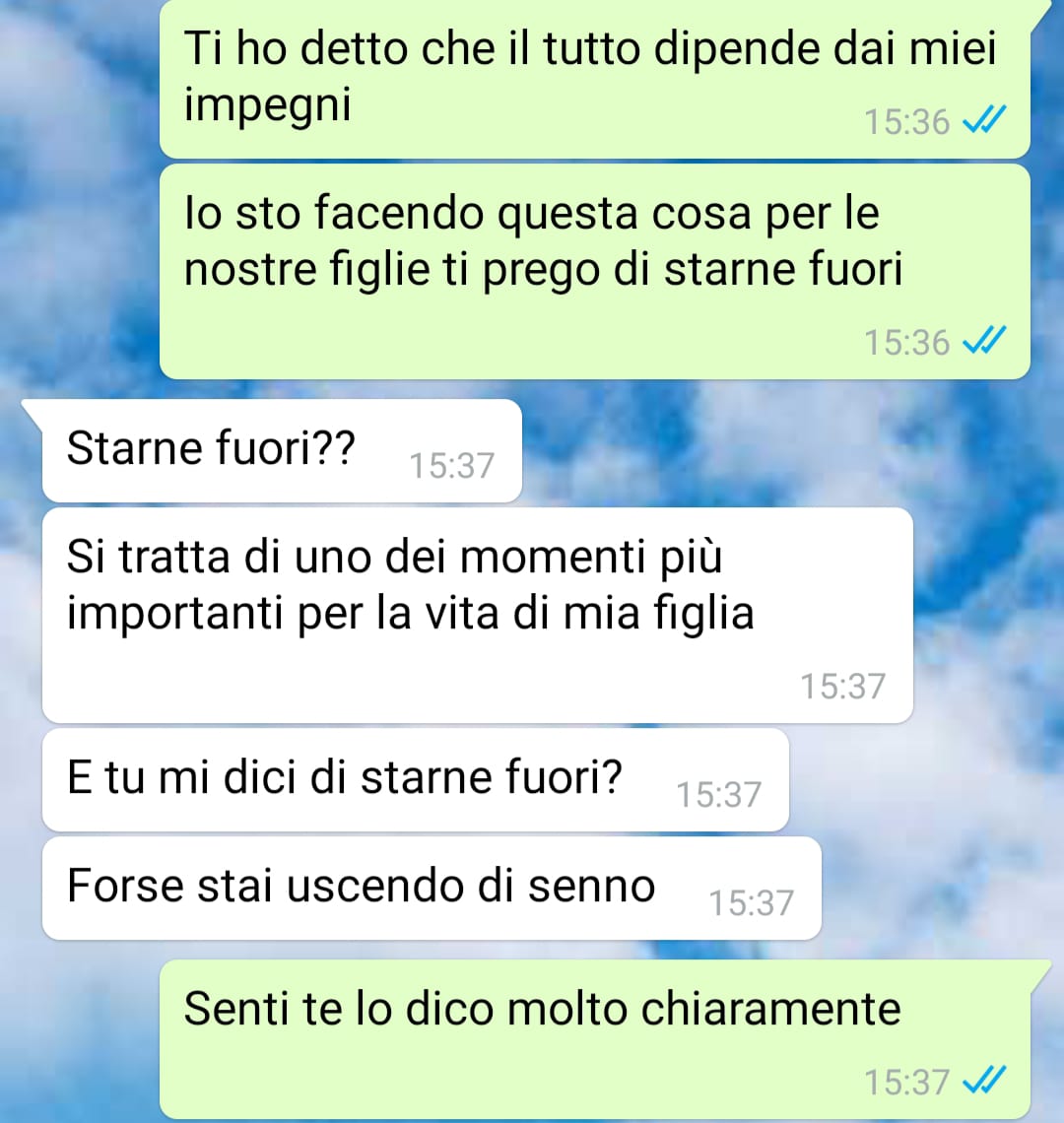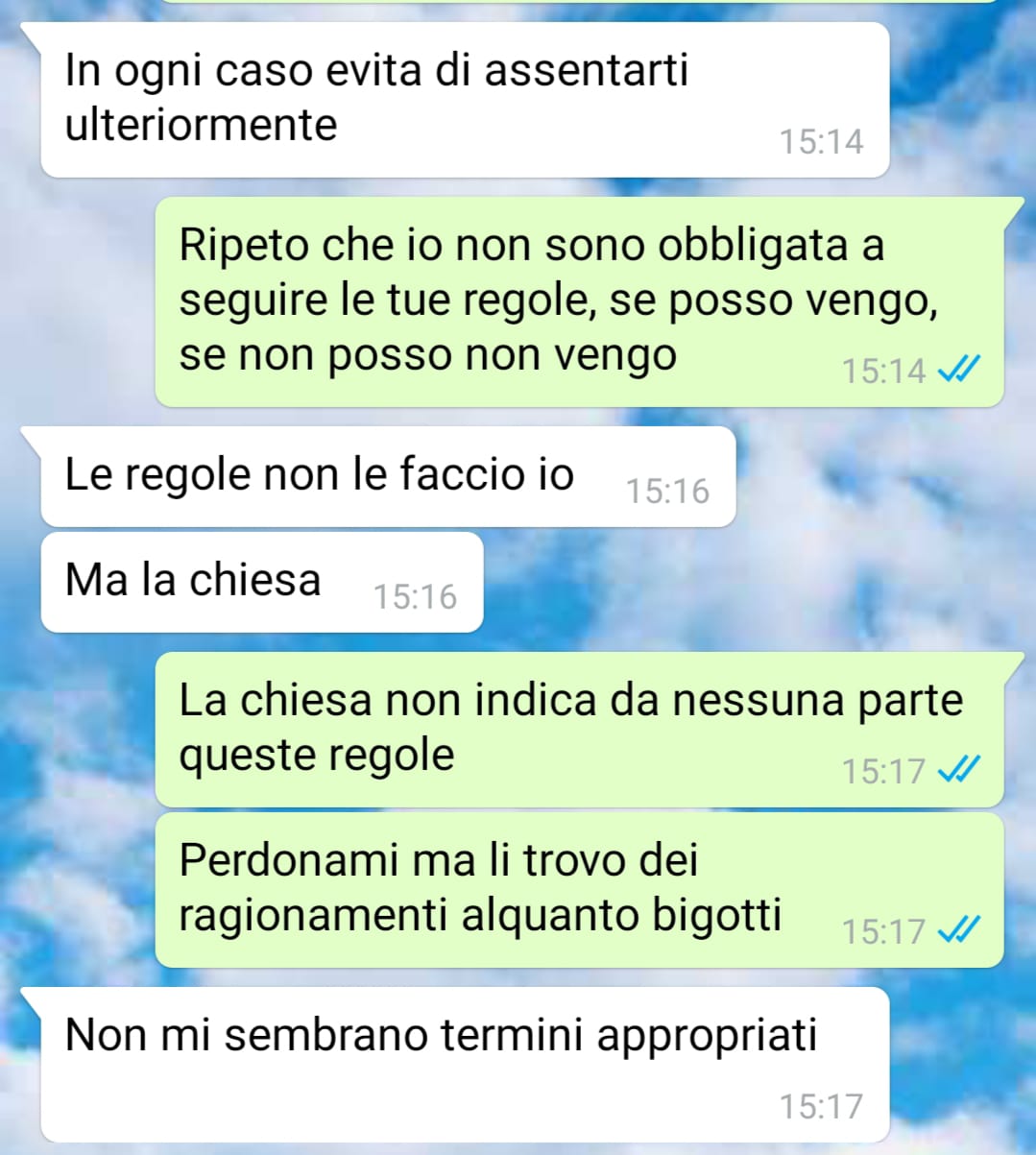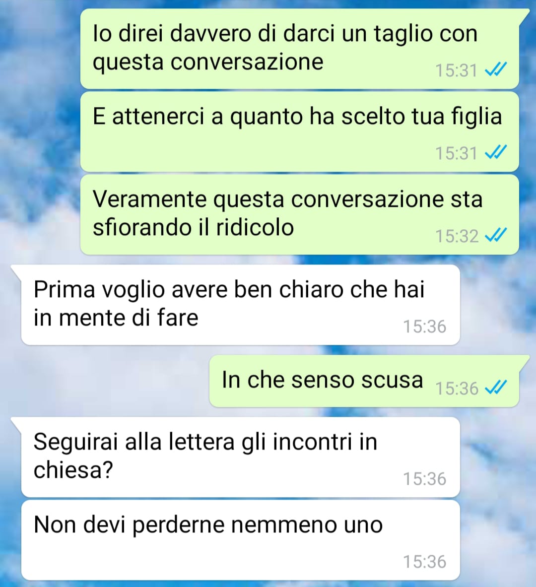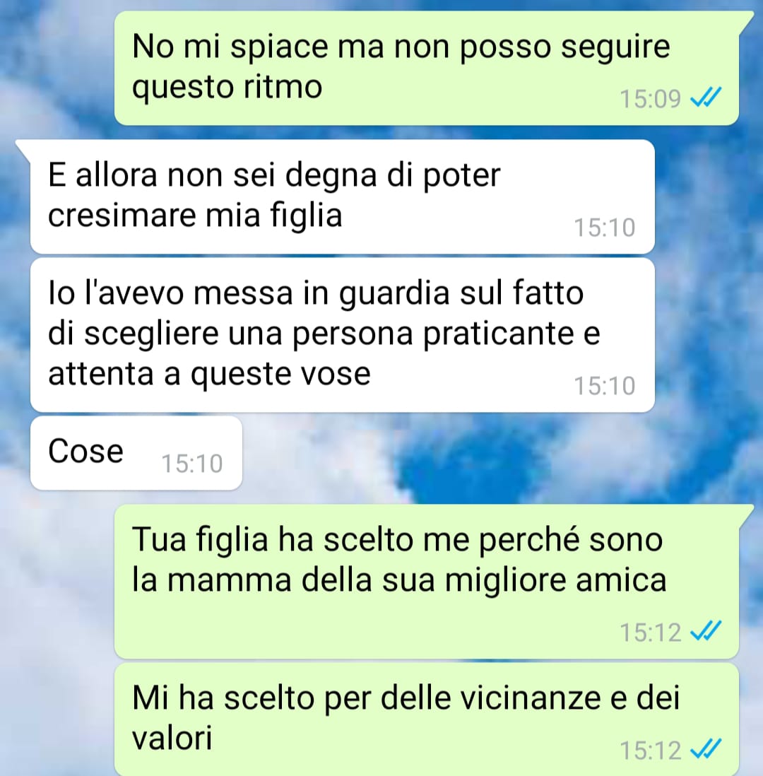 Chiara e desidera condividere gli screenshot di una conversazione avuta con la madre di un’amica di sua figlia. La madre le ha chiesto di essere la madrina di cresima della sua bambina. Chiara ammette di non essere una persona religiosa e che la chiesa non rappresenta una priorità per lei. Tuttavia, per il bene di sua figlia e dell’amica, ha accettato con piacere la richiesta. Come noto, ci sono vari incontri e messe da seguire in questi casi, ma avendo solo la domenica libera, spesso non sente il desiderio di partecipare. Inoltre, la cerimonia religiosa non rispecchia le sue convinzioni personali. La madre dell’amica ha però notato la sua assenza la scorsa domenica e l’ha ripresa per questo motivo. A volte, il fanatismo può spingere le persone a comportarsi in modi strani, ma Chiara ritiene di essere nel giusto e non sente la necessità di giustificare la sua reazione. Chiara si trova in una situazione delicata in cui i suoi valori personali si scontrano con le aspettative e le tradizioni religiose. Pur essendo grata per l’opportunità di essere madrina di cresima, le sue convinzioni e il suo modo di vivere la fede differiscono da quelli della madre dell’amica.