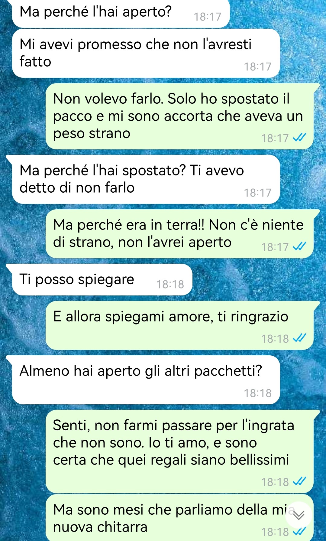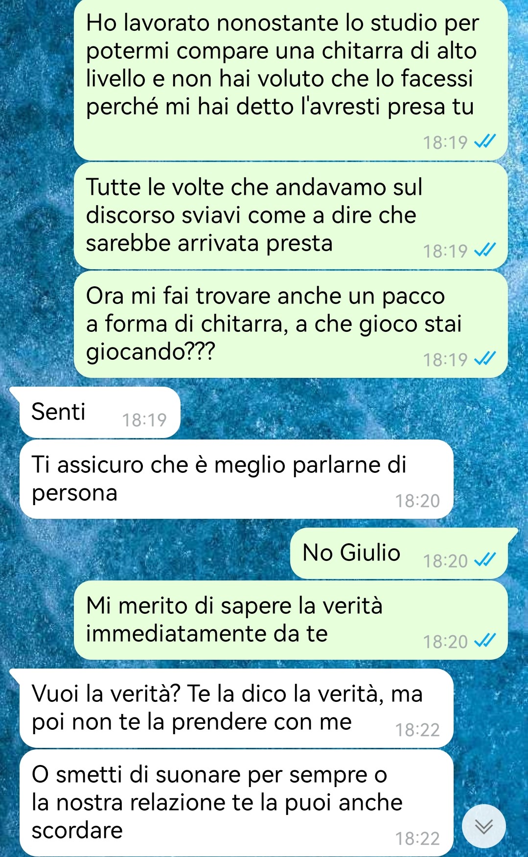 Lei, essendo una grande appassionata di musica, amava suonare la chitarra, una passione che il suo ragazzo sembrava apprezzare e incoraggiare. Questo è diventato particolarmente rilevante quando, a seguito di un incidente, la sua chitarra si è rotta.