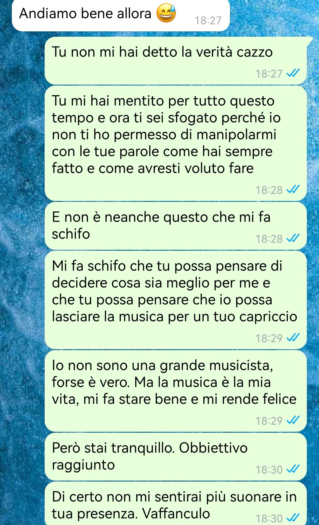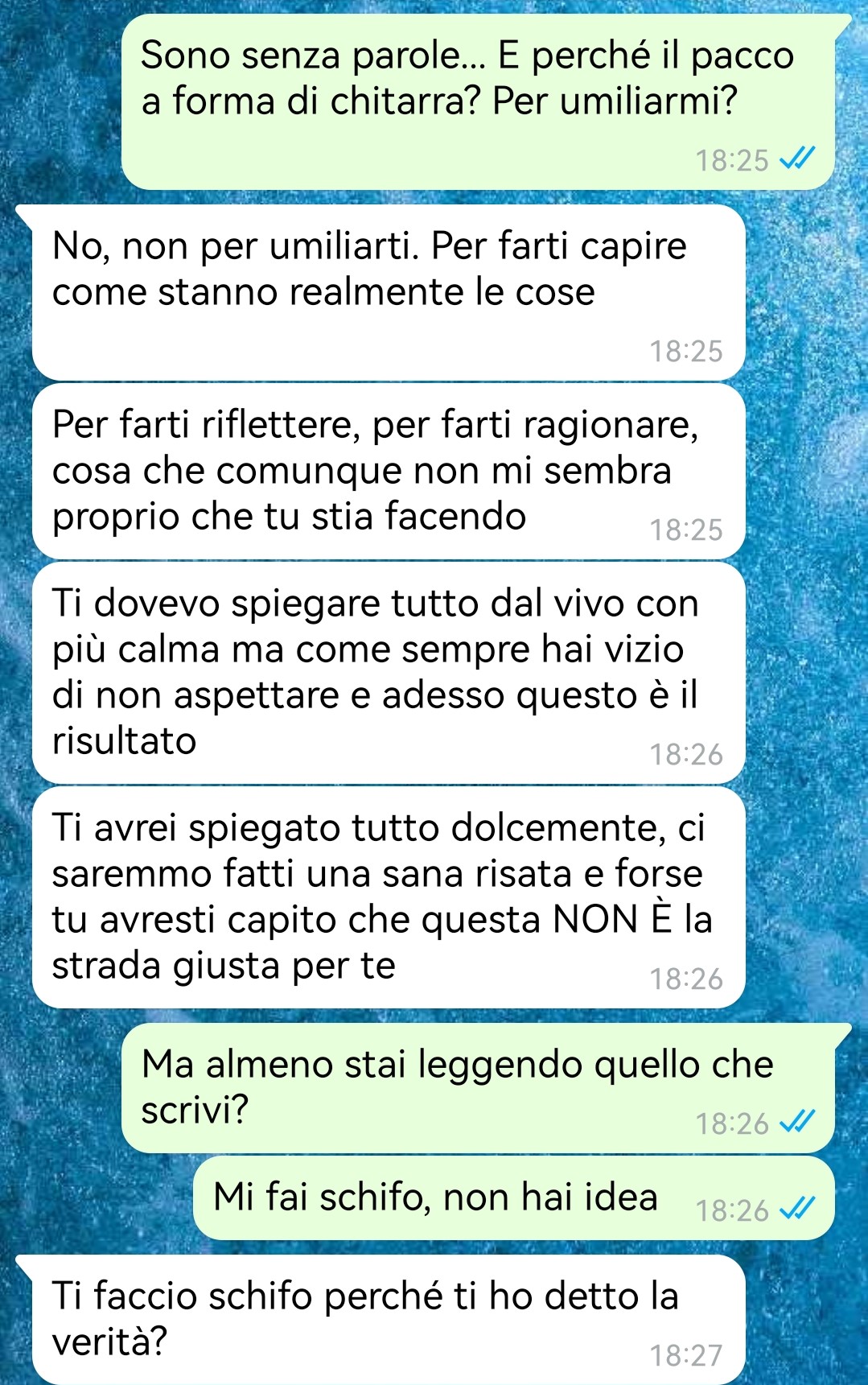 Tuttavia, quando è arrivato il giorno del compleanno, è emersa la verità. La storia non specifica esattamente cosa sia successo, ma è chiaro che il ragazzo non solo non ha regalato la chitarra, ma ha anche rivelato la sua mancanza di sincerità nei sentimenti e nelle promesse fatte. Questa rivelazione ha avuto un impatto devastante sulla narratrice, facendole crollare il mondo addosso e facendola sentire tradita e delusa.