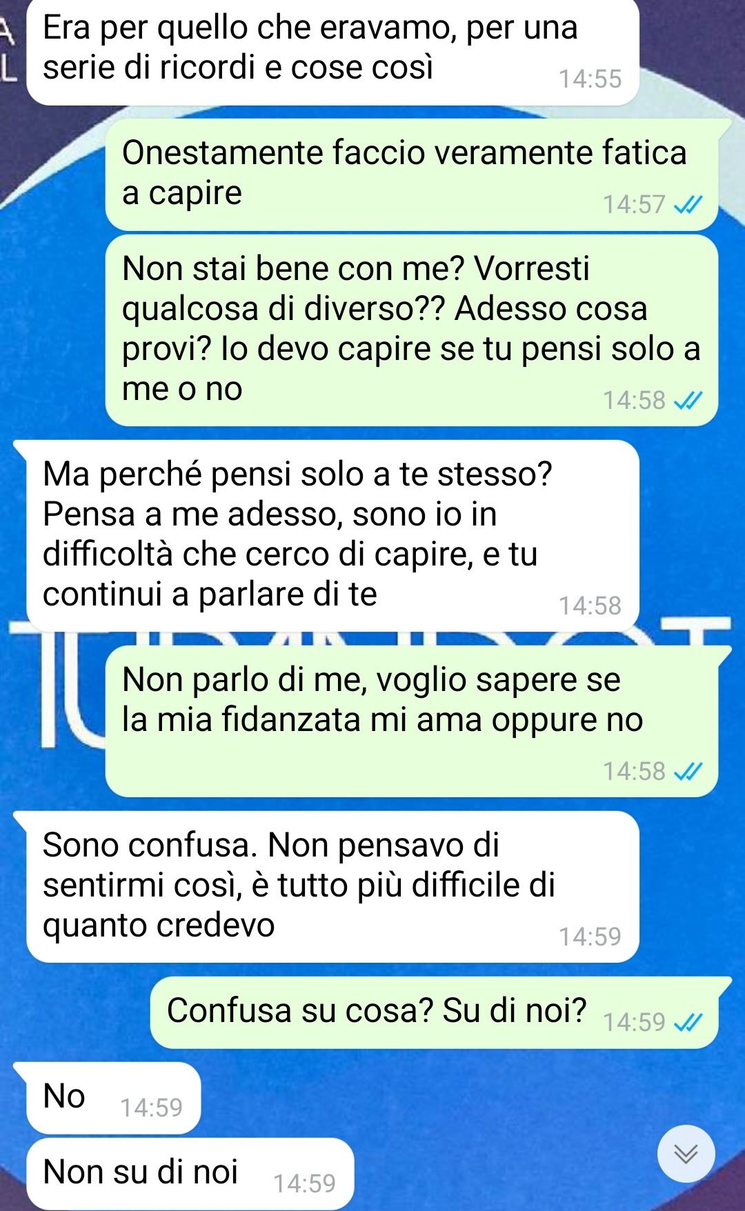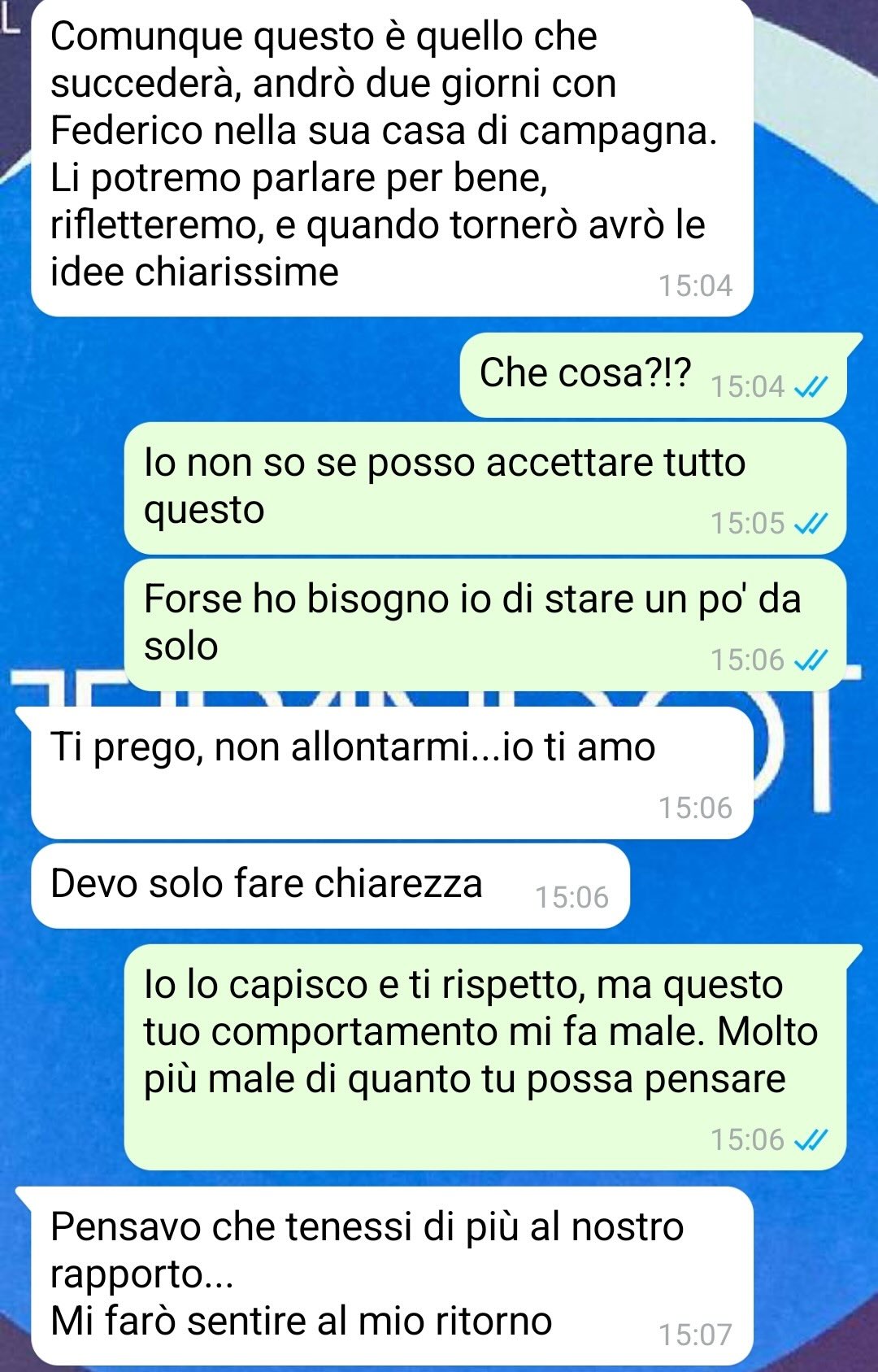 Il nostro amico sente il bisogno di prendersi del tempo e dello spazio per capire cosa prova davvero. Ha bisogno di riflettere senza pressioni, per mettere a fuoco i propri sentimenti. Teme però che, qualunque sarà la conclusione di questo percorso, nulla potrà tornare com’era prima.