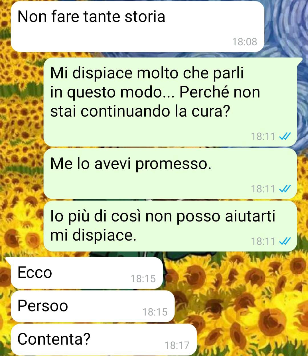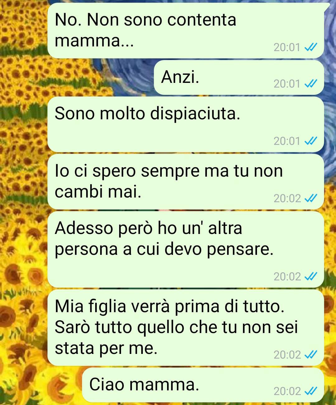 L’amica si è trovata a dover gestire scuola, studio, pulizie domestiche, lavoretti pomeridiani e preparazione dei pasti, un carico pesante che ha affrontato con determinazione per amore verso la madre e il desiderio di aiutarla. Dopo aver chiesto supporto ad amici e conoscenti, è riuscita a convincere la madre a seguire delle terapie che hanno portato miglioramenti significativi, facendole sperare di poter finalmente riavere indietro la figura materna. Nel frattempo si è sposata e ha iniziato una nuova vita con il marito, continuando però a supportare la madre. Tuttavia, ha iniziato a percepire nuovamente segnali preoccupanti che hanno trovato conferma attraverso alcuni messaggi ricevuti, lasciandola profondamente abbattuta e con un senso di colpa, pur nella consapevolezza di non poter essere lei la salvezza della madre.