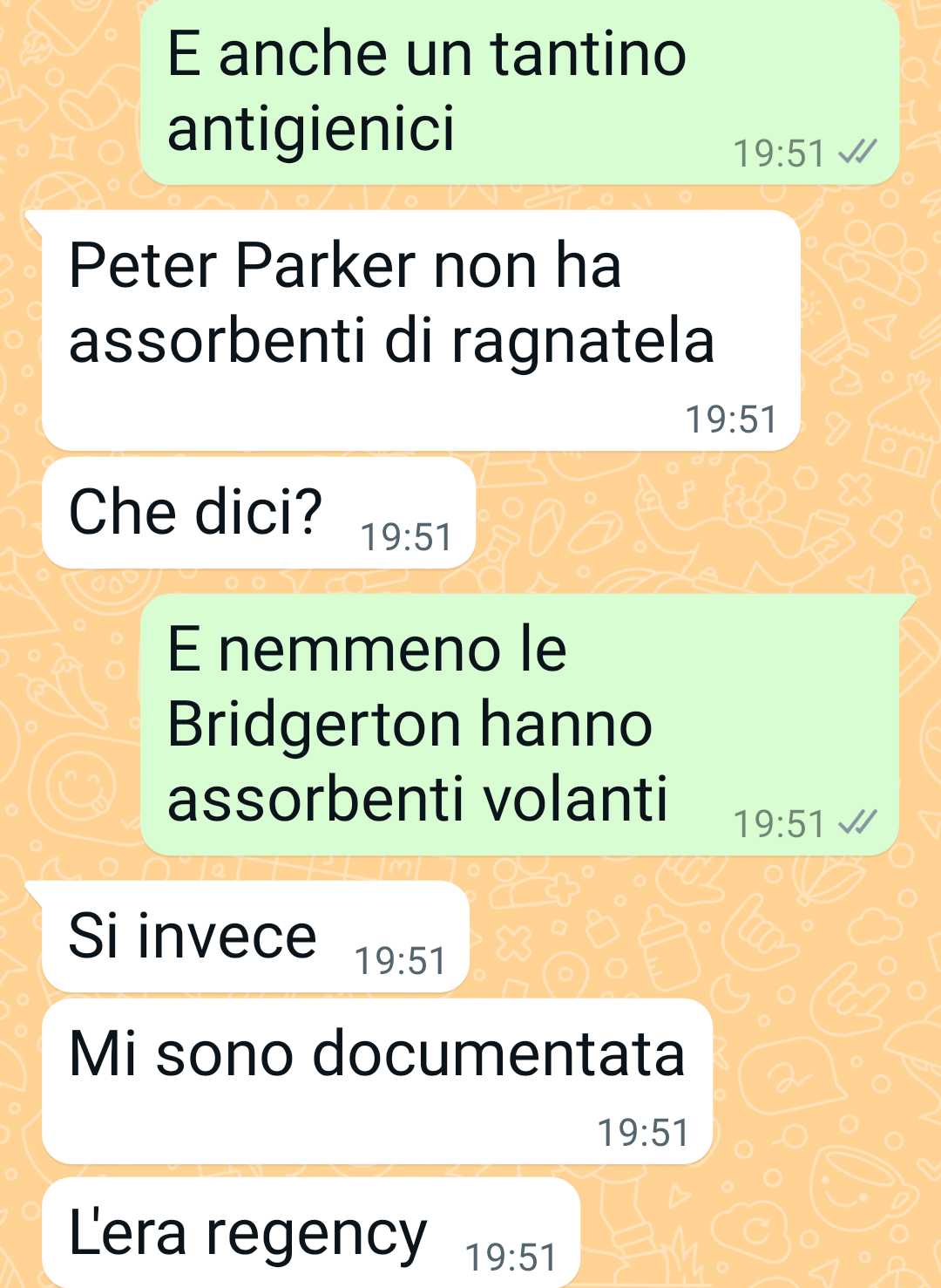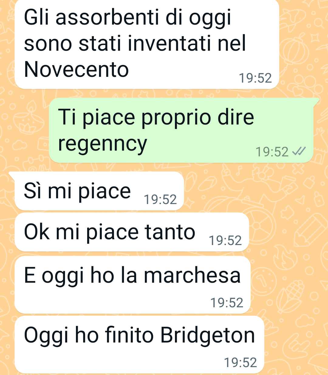 La situazione prende una piega ancora più surreale quando la sua ragazza, influenzata dal clima ottocentesco della serie, decide di affrontare il ciclo “come si faceva una volta”. Non specifica con esattezza cosa significhi, ma lascia intendere che si tratti di un approccio particolarmente teatrale o fuori dal comune. Lui, spiazzato, prova a capirne le ragioni, ma dichiara di non riuscire in alcun modo a seguire la sua logica, neppure dopo una conversazione in chat in cui lei cerca di spiegarsi.