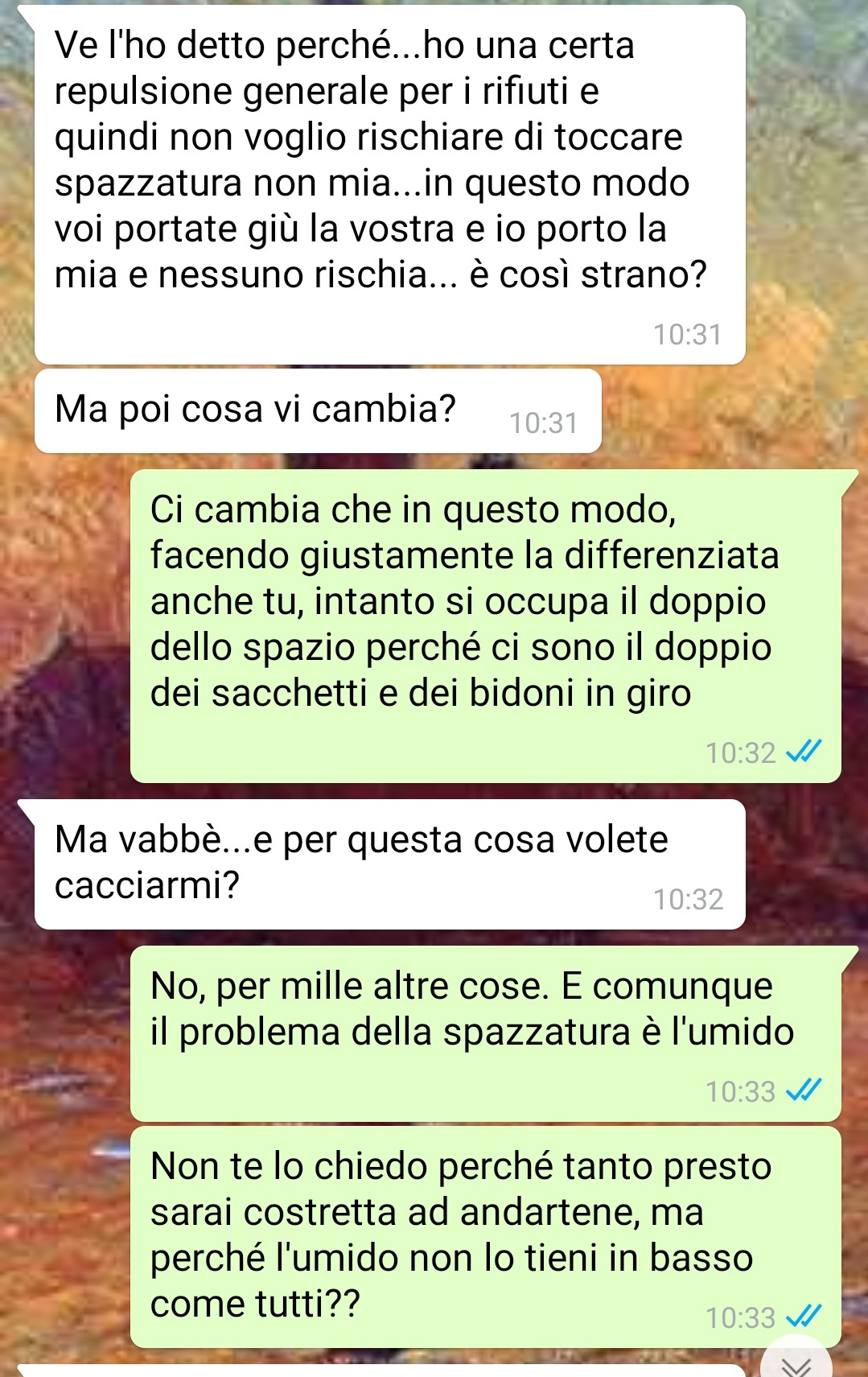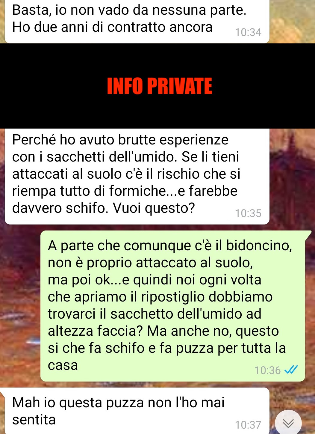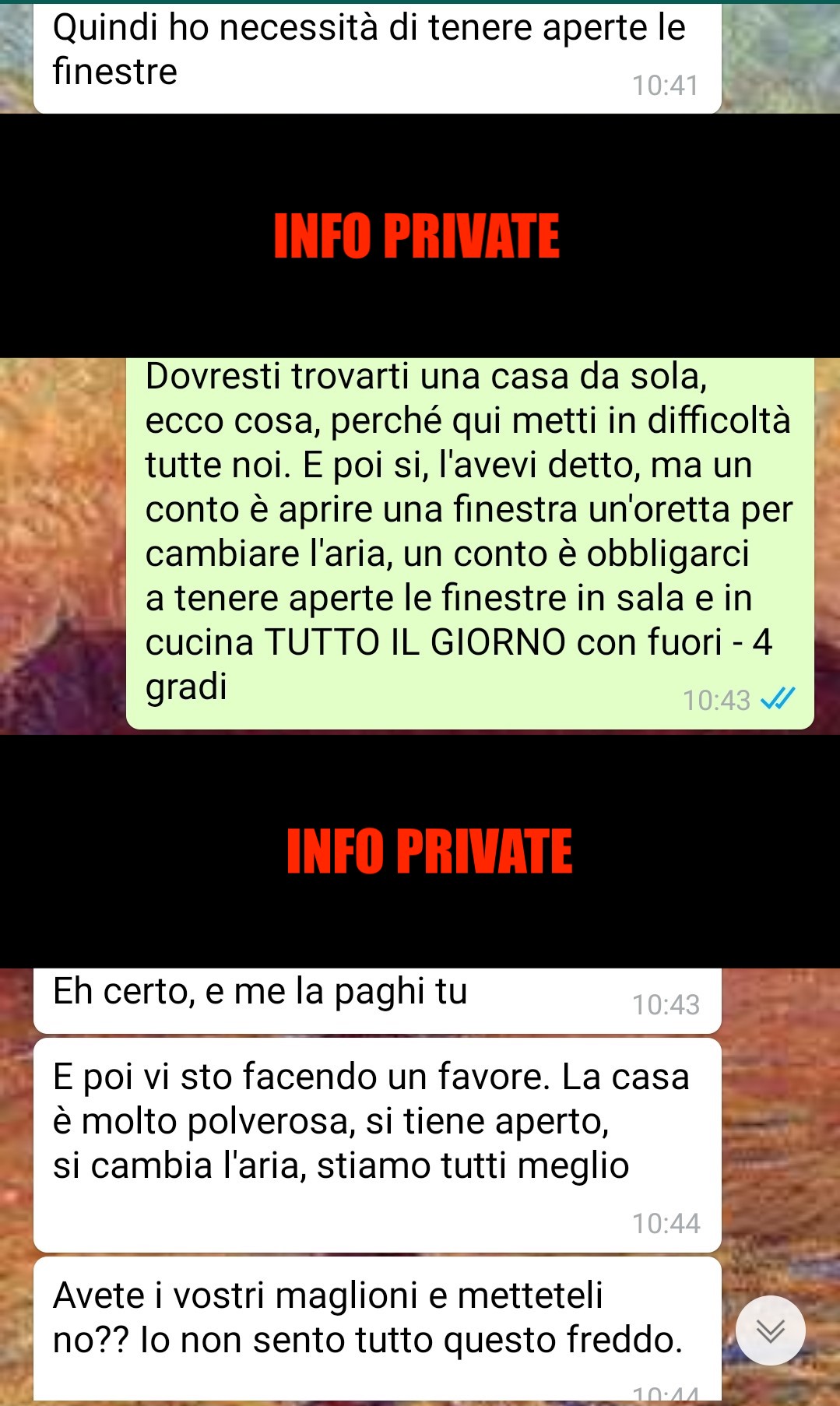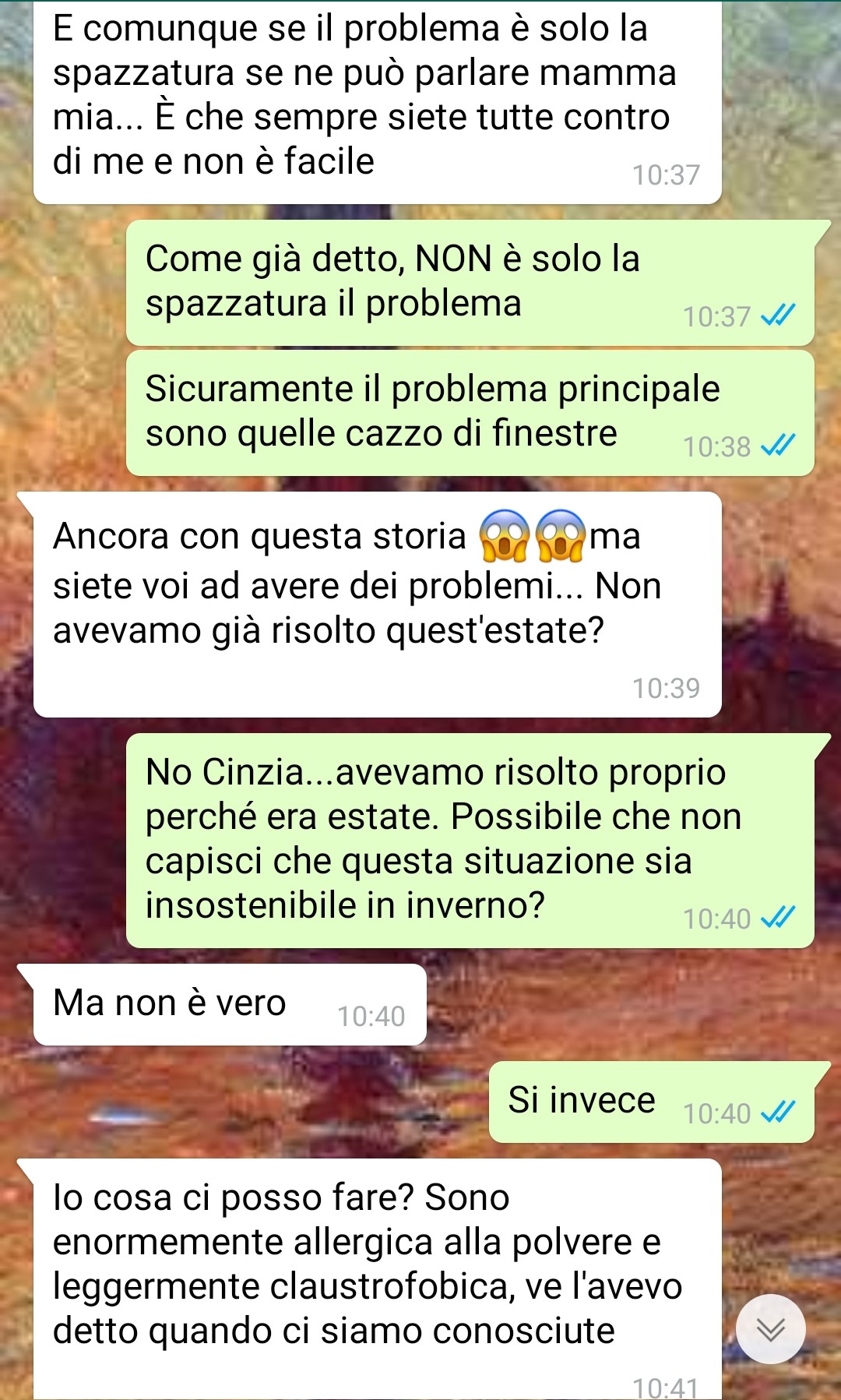 La nostra fan che attualmente vive in una casa condivisa con altre studentesse e una coinquilina di nome Cinzia, descrive una situazione di convivenza problematica. Mentre il rapporto con le altre coinquiline è positivo e caratterizzato da divertimento e reciproco sostegno, la convivenza con Cinzia si rivela essere un disastro.