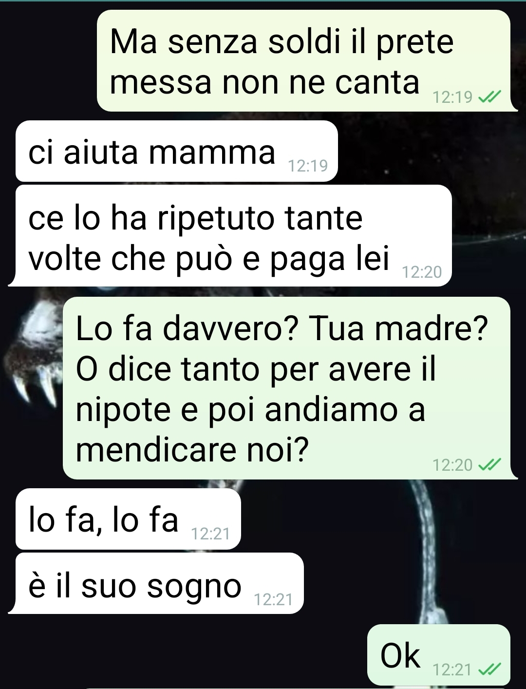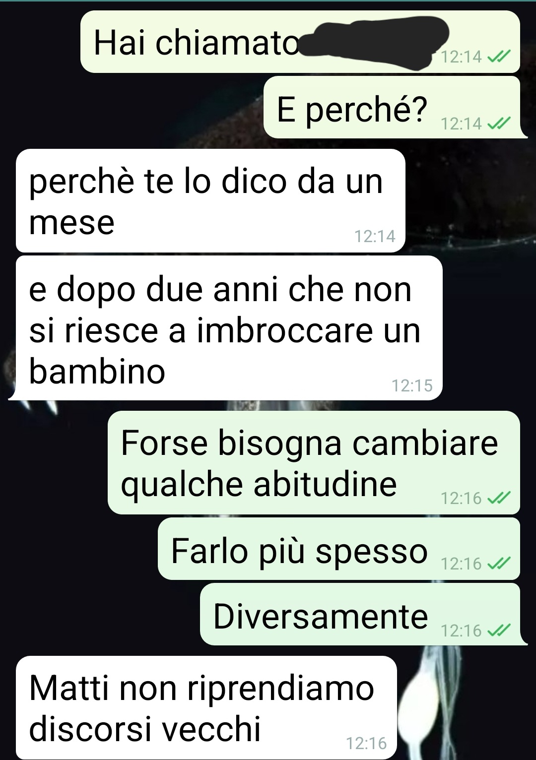 Mia moglie vuole che andiamo in una clinica per la fertilità. Ma ci deve venire pure sua madre! Buongiorno da Maria amici di Commenti Memorabili. Non so bene come prenderla, se a ridere o a piangere. Magari mi aiuterete a decidere e a fare (o non fare) quello che devo. Parto dal principio. Sono sposato con Giulia, felicemente, dal 2020. Da 2 anni abbiamo anche il desiderio di avere un bambino. Solo che fino ad ora non ci siamo riusciti. E diciamo che se all’inizio siamo andati leggeri adesso l’impegno, le procedure e gli esami sono serrati. Ma niente. Quindi Giulia ha pensato di affidarci ad una clinica per la procreazione assistita. Quantomeno un primo consulto per avere un quadro chiaro e un parere sulla nostra difficoltà. Diciamo che mi sono convinto, anche se resto per l’esborso economico. Ma al consulto dovrebbe venire mia suocera! Vi rendete conto??? A farsi gli affari nostri, i più intimi e personali. Questa è la chat e relativa lite con mia moglie sulla questione. Gustatevela e… aiutatemi!