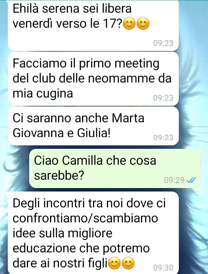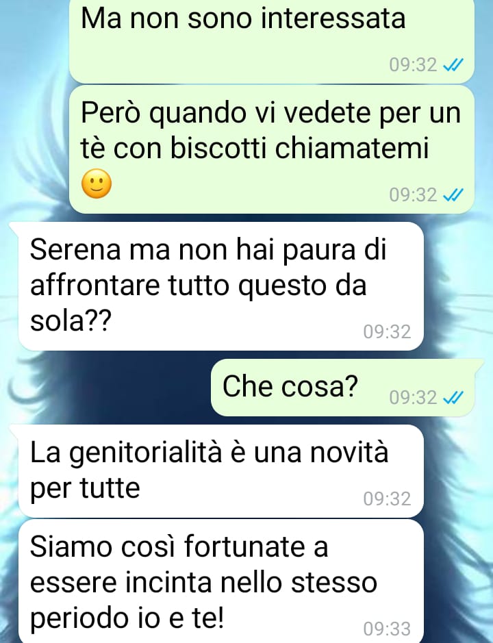 ho avuto una conversazione alquante imbarazzante con una mia vicina di casa, alias Camilla. Io e lei siamo mezze cresciute insieme, giocando da piccole nel vicinato. Una volta andate a scuola ci siamo perse, ma avendo entrambe continuato a stare nelle case delle nostre famiglie, tra un caffè e l’altro ci siamo ritrovate. Saltuariamente ci incontriamo con il suo gruppo, prendendo tè, facendo un aperitivo o per una semplice chiacchiera in giardino. Insomma, non sono sicuramente le mie amiche del cuore, ma sono sempre stata bene in loro compagnia. Ora però le cose stanno cambiando, perché io e Camilla siamo entrambe incinta e più di una volta le sue amiche (già madri) hanno voluto darmi consigli gratuiti. Solitamente ringrazio e poi vado per la mia strada. Questo finché Camilla non mi ha scritto per dirmi che stanno mettendo su un club di neomamme. La cosa fa ridere già così, lo so, ma quello che ha detto e che ha insinuato dopo che ho semplicemente chiesto spiegazioni non fa ridere per niente. Sono passate due settimane in cui mi ha riempito di messaggi, ma io non riesco a trovare un buon motivo per cui dovrei portare avanti un’amicizia del genere.