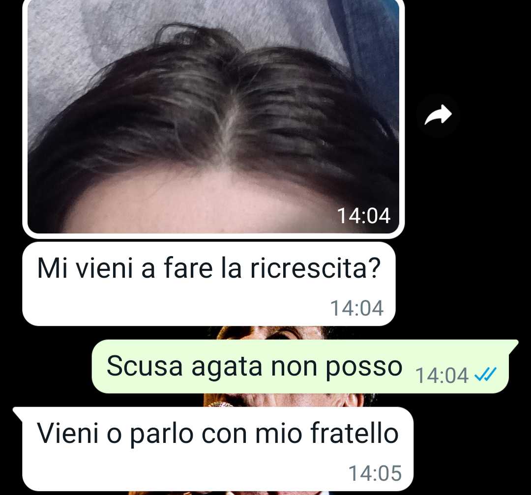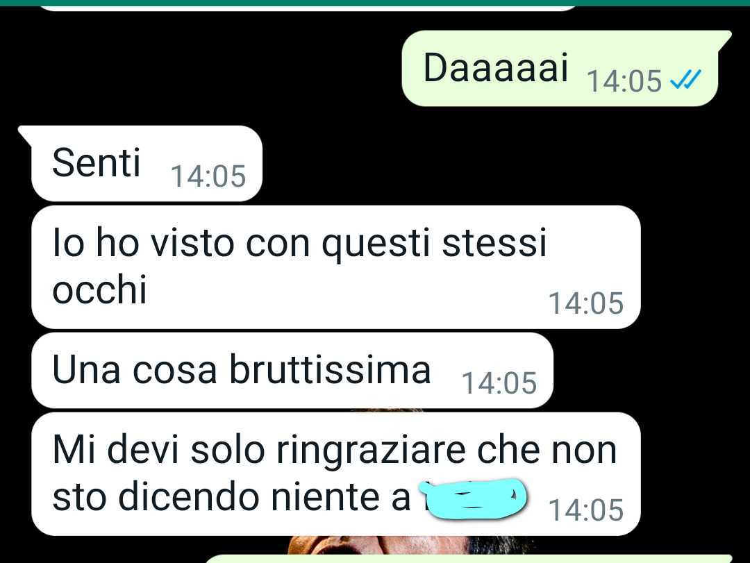 “Ciao Commenti Memorabili, mi chiamo Samantha. Mia cognata Agata mi sta ricattando. Non so che fare?? Non vi ho mai mandato una conversazione, ma ora che mia cognata mi sta ricattando vi ho pensato per ricevere consigli. A volte quando sei dentro una situazione brutta non puoi fare altro che starci, cali la testa e dici sì anche a cose che non ti stanno bene, perché non sai come reagire. Mia cognata mi ha vista mentre ero fuori e ha visto una cosa che non doveva vedere. Nella chat leggete cosa ha visto e cosa dice di avere visto. Perché ok, io ho sbagliato, ok. Ma ho dovuto sbagliare, dovevo chiudere una cosa, e dire addio come si deve, una volta per tutte. Lei però mi ha visto per strada e mi è corsa incontro e mi ha fatto capire che aveva visto tutto ma che non avrebbe detto niente al mio ragazzo. Io ho pensato dai che carina, per una volta non fa la stronza, e poi vi ripeto non stavo facendo niente di così brutto… Ora come potete leggere dalla conversazione lei ha cominciato a ricattarmi. Io non so che fare. Ho paura ,anzi la certezza, che se lei parla io perderò il mio ragazzo.”