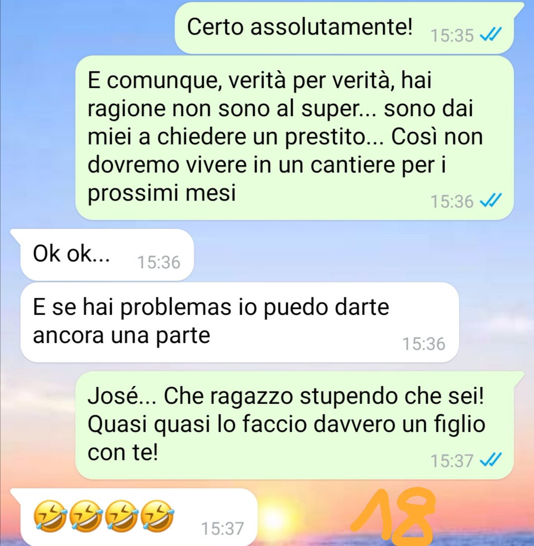 La nostra follower aggiunge un dettaglio che rende il racconto ancora più curioso: Josè parla spesso un “itagnolo” tutto suo, un misto tra italiano e spagnolo. Dopo le vacanze trascorse in patria, questa sua caratteristica linguistica si sarebbe accentuata ulteriormente. È proprio all’interno di questo contesto, tra equivoci, convivenza e dialoghi coloriti, che prende forma la chat che la nostra fan ha scelto di far leggere.