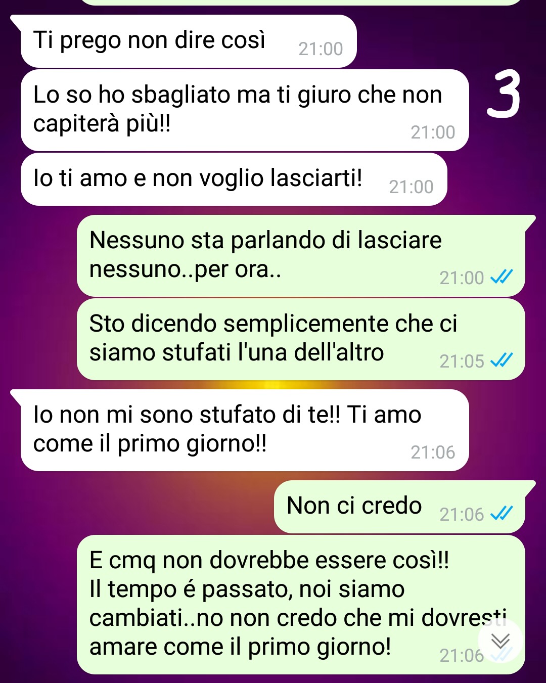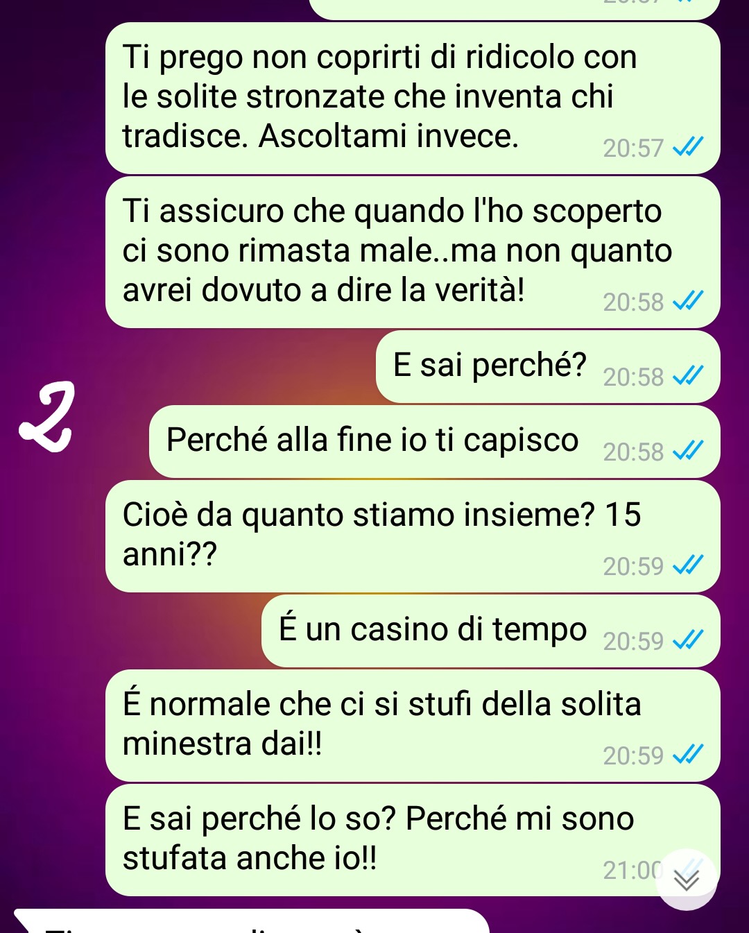 Sono Viola e ho scoperto da poco che mio marito mi tradisce. Che devo dire: ne avevo il sospetto ma non la certezza e per un po’ ammetto di aver fatto finta di non vedere perché.. perché sapevo che avrei sofferto un casino e che se avessi saputo tutta la verità questo avrebbe mandato in frantumi il mio matrimonio. In ogni caso… alla fine ho voluto sapere così ho indagato e ho scoperto che lui non solo mi tradiva, ma lo aveva fatto anche in passato. A questo punto avevo due opzioni: o lasciarlo o cercare un modo per tenere insieme il mio matrimonio, per superare il tradimento. Ci ho pensato molto. Mi sono anche chiesto perché lui mi avesse tradita. Alla fine sono giunta alla conclusione che dopo tanti anni di matrimonio, noi siamo sposati da quasi 15 anni, ci si può anche essere stufati del proprio partner da quel punto di vista. E devo dire che alla fine lo capisco.. cioè anche io sono un po’ stufa della solita minestra a dire il vero!! Ma un matrimonio non è fatto solo di sesso e passione, c’è dell’altro.. almeno secondo me!! Così ho individuato quella che secondo me poteva essere una soluzione, un modo per superare il tradimento di mio marito. Certamente anche lui doveva volerlo. Leggete la mia proposta e come lui ha reagito..