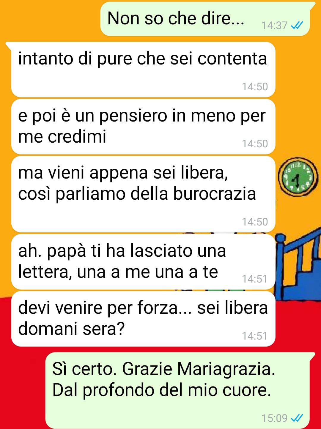 Dopo poco, le ha raccontato di aver bisogno di una mano in casa e le ha offerto un lavoro ben retribuito. Così, dopo l’ufficio, andava ad aiutarlo e, spesso, lei e Alessia restavano a cena da lui, in compagnia anche della figlia Mariangela. Nel tempo, quel rapporto è diventato una vera amicizia. Durante le feste natalizie, Mariangela insisteva sempre perché andassero tutti da lei: la nostra fan, sua figlia, la sorella e il cognato. “Venite, questa casa è troppo grande e mi mette tristezza”, ripeteva ogni anno.