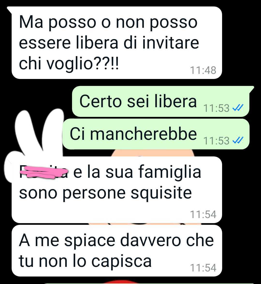 La nostra fan si trova ad affrontare una situazione delicata con la suocera, che non l’ha invitata al proprio compleanno. Quello che rende la situazione ancora più spiacevole è il fatto che l’ex fidanzata del suo compagno abbia invece ricevuto l’invito alla festa. L’amica considera questo comportamento profondamente ingiusto e lo attribuisce a una forma di stupidità da parte della suocera, riflettendo su come il mondo sia purtroppo pieno di persone con atteggiamenti simili.