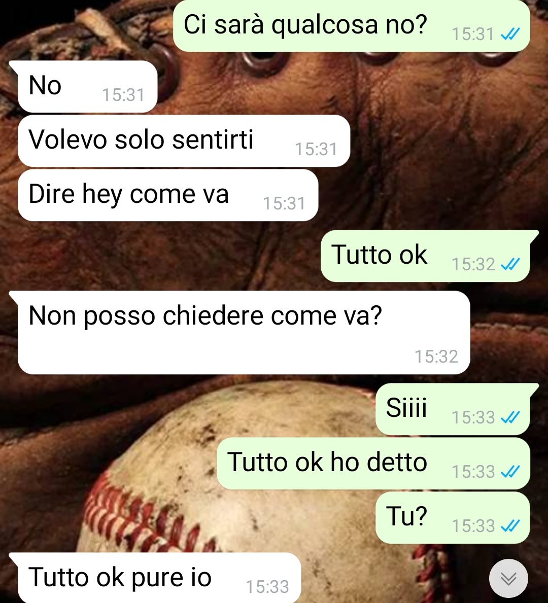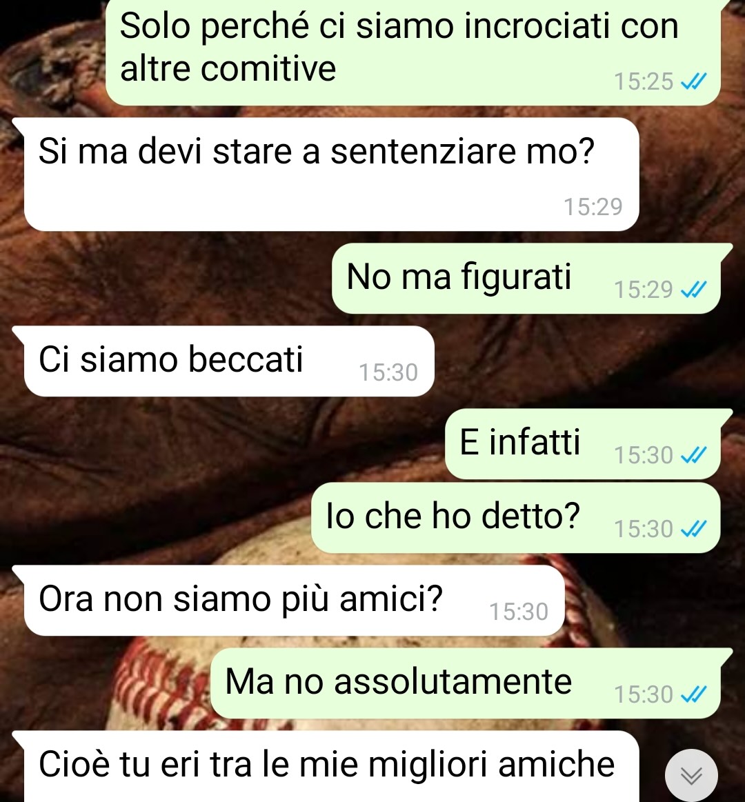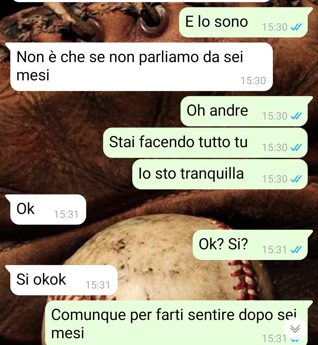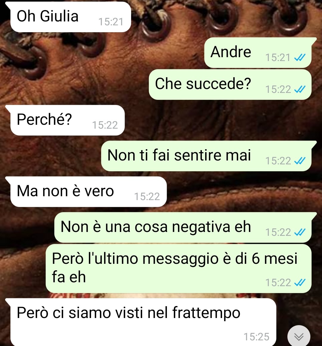 Salve a tutti, io mi chiamo Giulia e quello che voglio adesso è rendervi partecipi di una questione piuttosto spinosa che si è venuta a creare con un mio vecchio e caro amico. E non capisco nemmeno perché lui si è dovuto comportare così, anche se una piccola idea me la sono pure fatta. Infatti lui negli ultimi tempi si è fatto una nuova comitiva di amicizie che lo stanno portando a essere una persona totalmente diversa. Infatti all’inizio lui si comportava come al solito, all’inizio della conversazione che vi sto mandando intendo, e poi cambia repentinamente atteggiamento come se ci fosse stato qualcuno accanto a lui a dirgli cosa fare, ma forse sono io che mi faccio troppi problemi ed è semplicemente cambiato. In ogni caso lui si chiama Andrea e lo conosco da quando andavamo insieme al liceo, poi ci si è separati un po’ quando abbiamo fatto percorsi diversi all’università com’è normale che sia, ma ci si sentiva e vedeva sempre. Lui è sempre stato un animo gentile, buono, timidissimo ed ero io a dovergli tirare le cose di bocca quando si chiudeva a riccio e non parlava. Poi è scomparso per sei mesi e quando è ricomparso, per il suo compleanno in dirittura di arrivo, ha iniziato a pretendere cose assurde.
