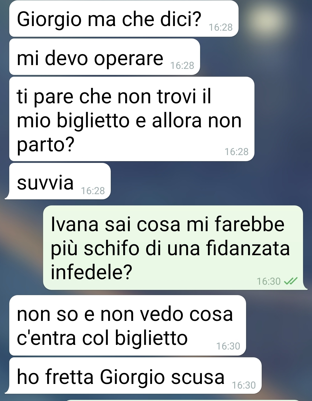Giorgio premette che scrive spinto da un forte senso di disgusto, il più intenso che abbia mai provato, e con una domanda precisa che lo tormenta: cosa è più grave, l’infedeltà della propria compagna o il fatto che la madre di lei sia complice e partecipi attivamente a coprirla?