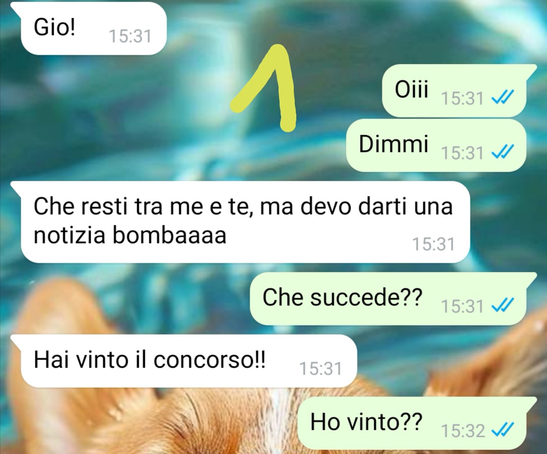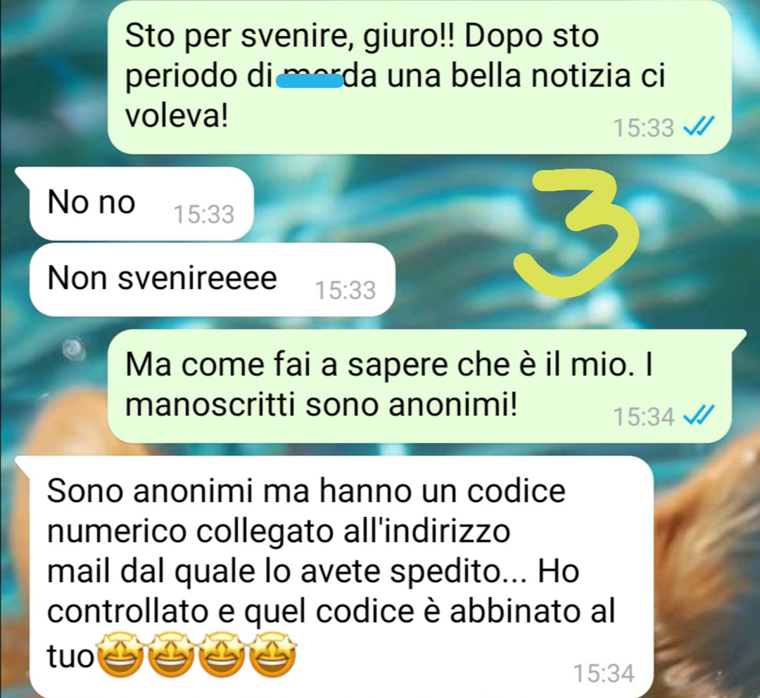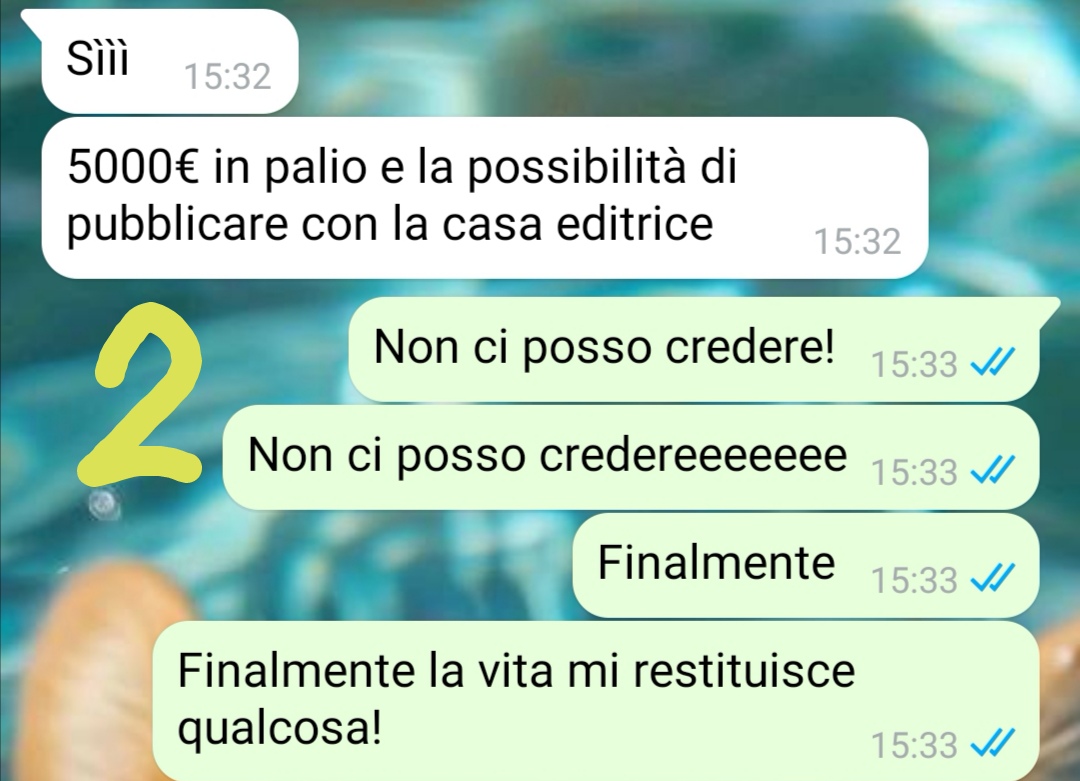 Mi chiamo Giovanni, sono un aspirante scrittore e la chat che vi invio ha come oggetto proprio questa mia grande passione. Amo scrivere da sempre, ho scritto tanti racconti, romanzi e inviato tanti manoscritti che mi vengono sempre prontamente bocciati.So che è un mondo difficile e so anche che uno come me, sempre in bolletta e con parecchi pro-blemi familiari, non dovrebbe nemmeno rincorrere sogni così utopici.Negli anni ho conosciuto tante persone nel settore, stretto anche amicizie con chi lavora nelle case editrici, quelle più piccole.Un giorno uno di questi ragazzi, Lorenzo, che ora è diventato un mio grande amico, mi manda un messaggio per dirmi che la sua casa editrice sta organizzando un concorso per esordienti e che il primo premio è in denaro: 5.000€ più la pubblicazione.Sinceramente l’idea mi fa gola anche perché sono davvero in difficoltà economiche e decido di partecipare, con la consapevolezza che sarebbe stato un altro buco nell’acqua.Passa qualche settimana dall’invio e un giorno ricevo il messaggio che leggerete all’inizio degli screen che vi mando…non mi sembra vero nulla, mi sembra tutto un sogno…E nulla, io di solito le storie le scrivo, ma mai avrei pensato di diventarne protagonista.Dato che mi piace molto questa pagina di racconti via chat, ho pensato che magari vi avrebbe fatto piacere leggere la mia piccola storia. Piccola sì, ma credo abbastanza profonda…un saluto a tutti.