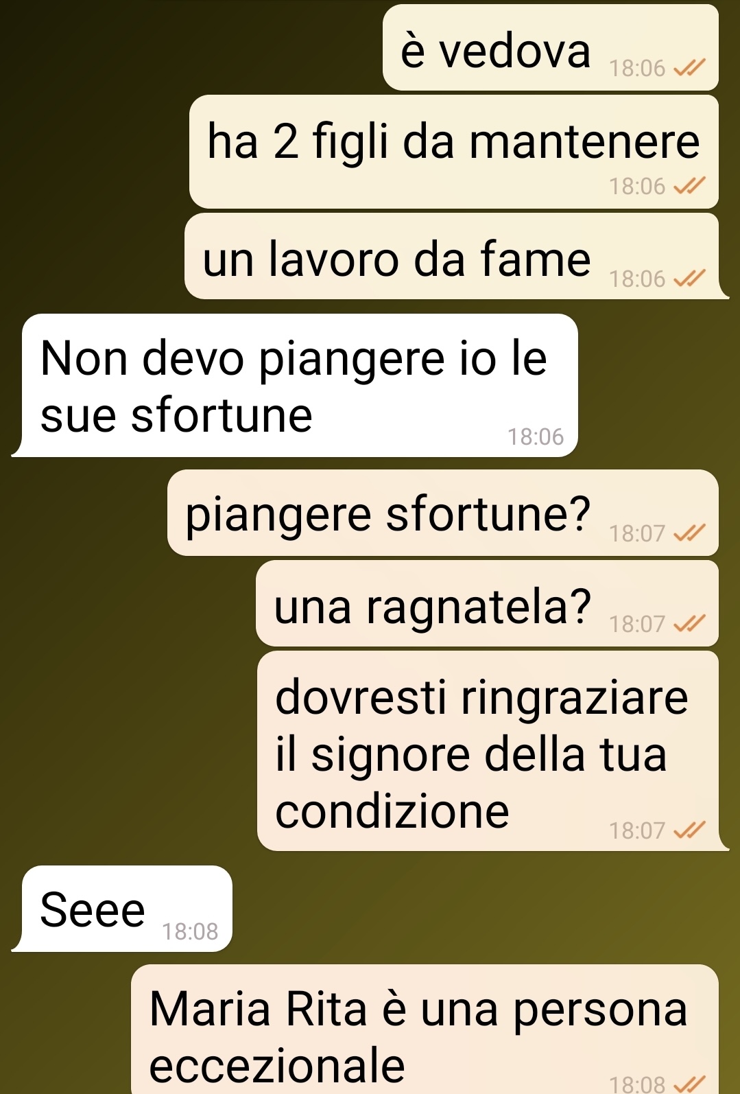 Secondo quanto raccontato dal nostro follower, la moglie ha iniziato a diventare molto esigente e critica nei confronti del lavoro svolto da Maria Rita. Ritiene che le pulizie non siano eseguite con sufficiente precisione e ha cominciato a segnalare piccole imperfezioni, trasformandole in motivi di scontento. A detta del nostro fan, la moglie sarebbe ormai diventata una “maniaca del pulito” e una ricercatrice di difetti.