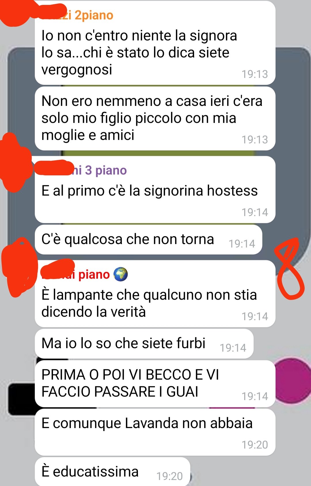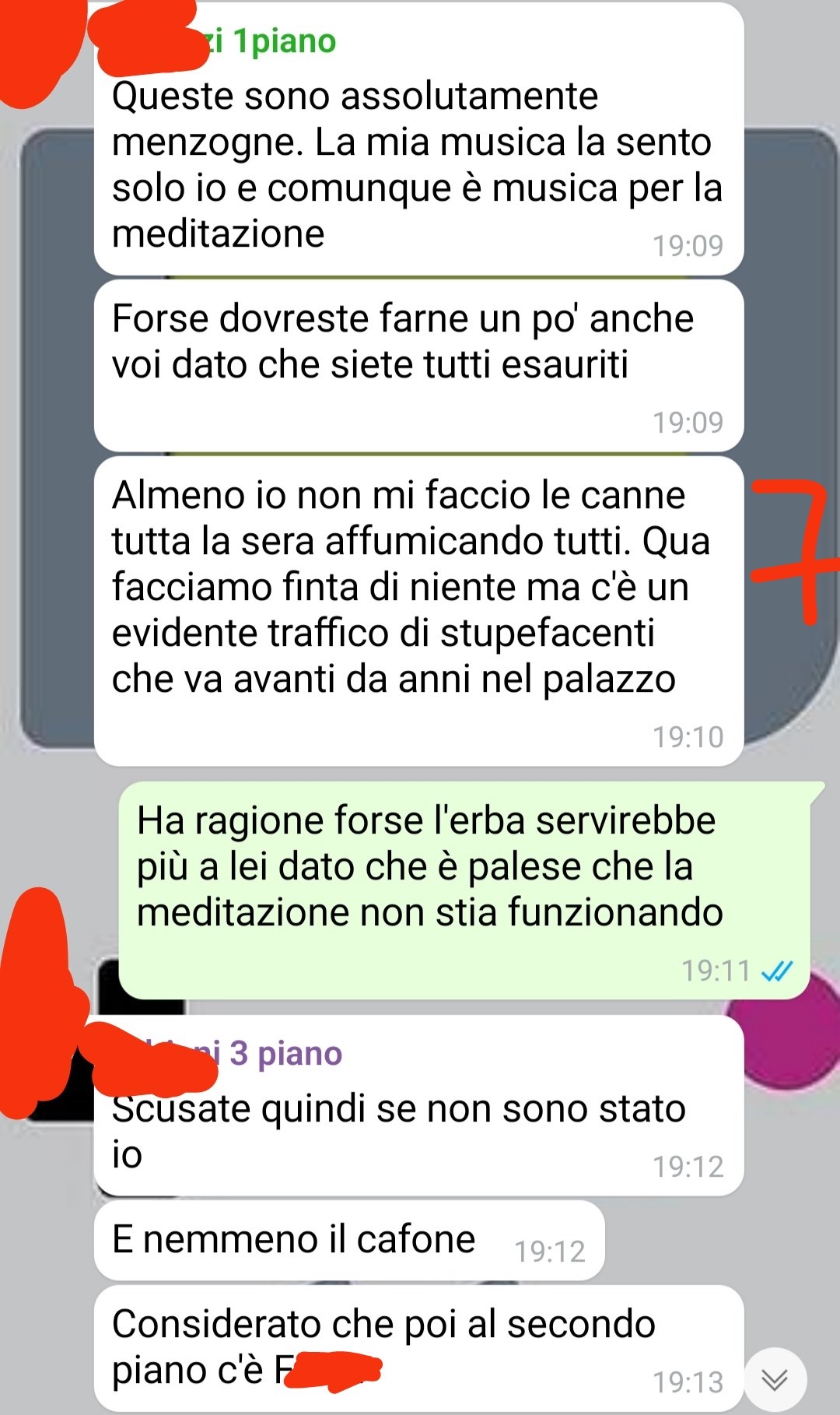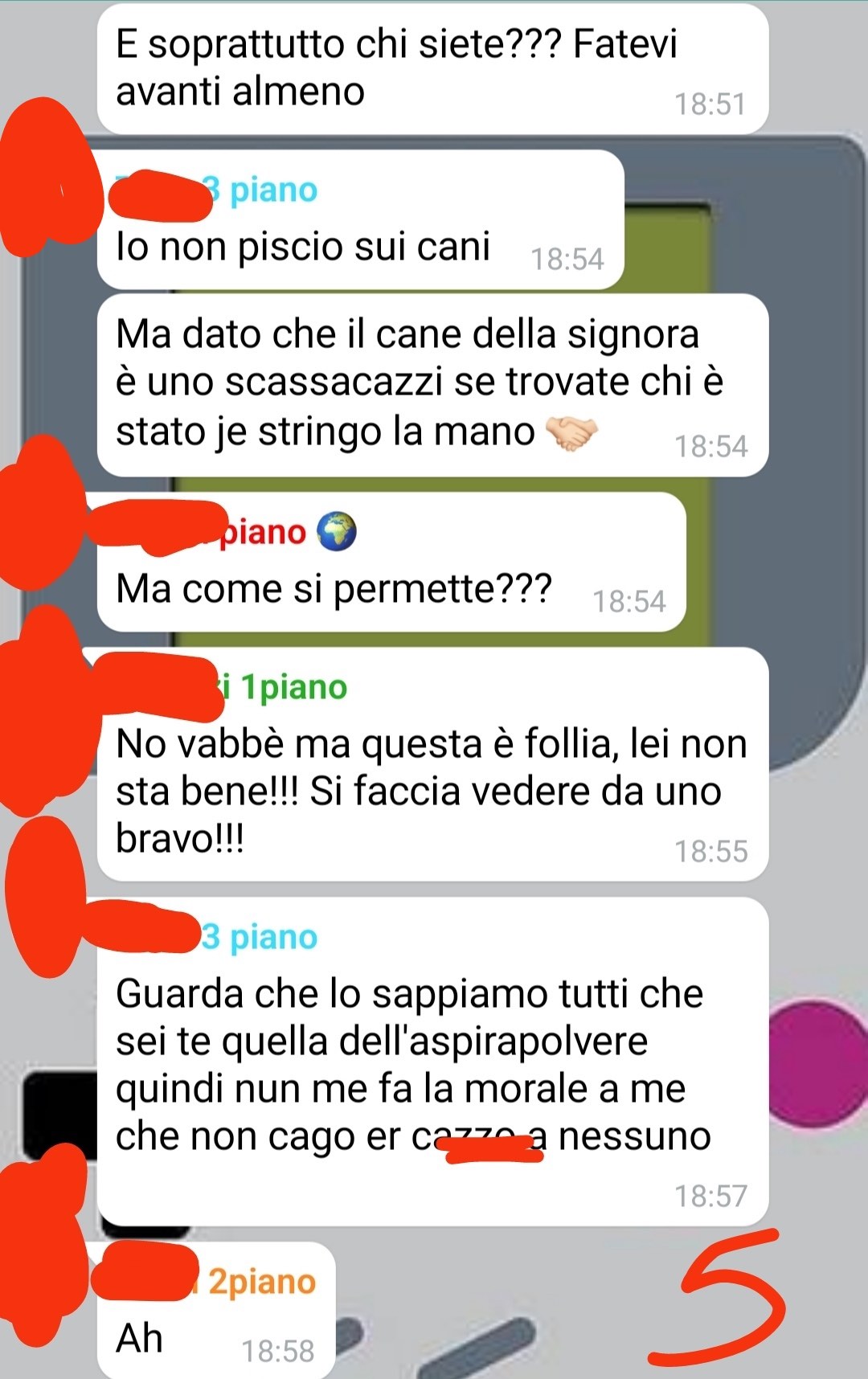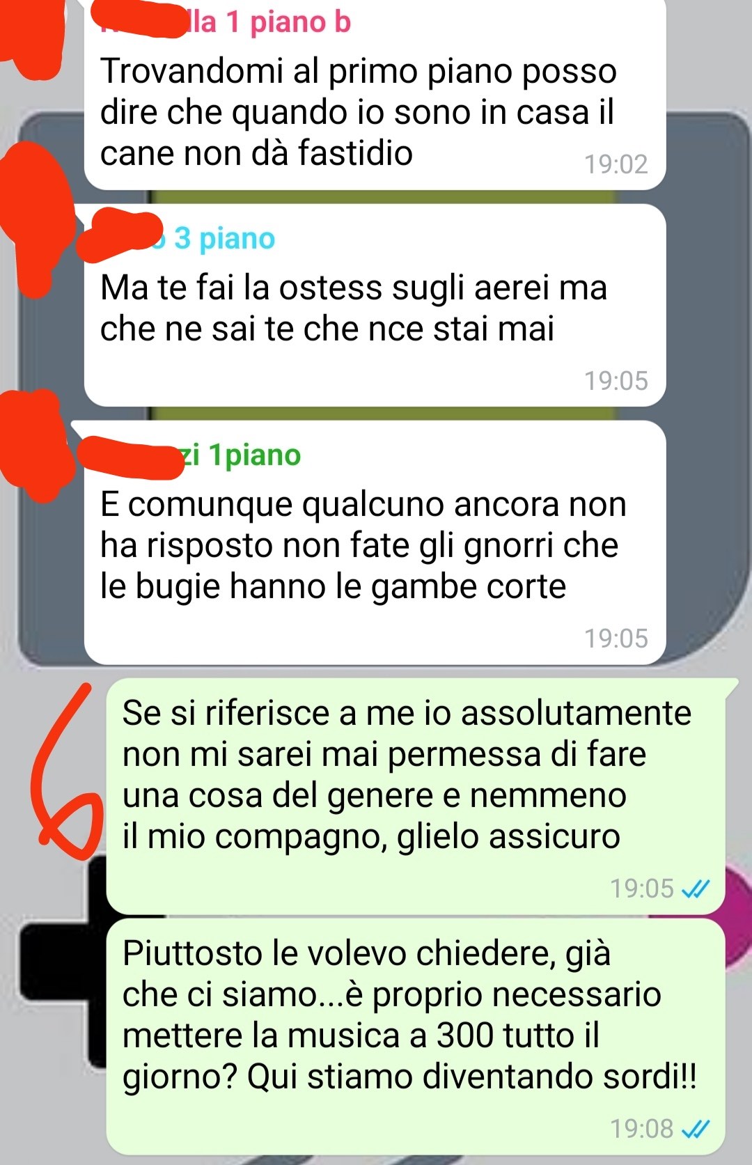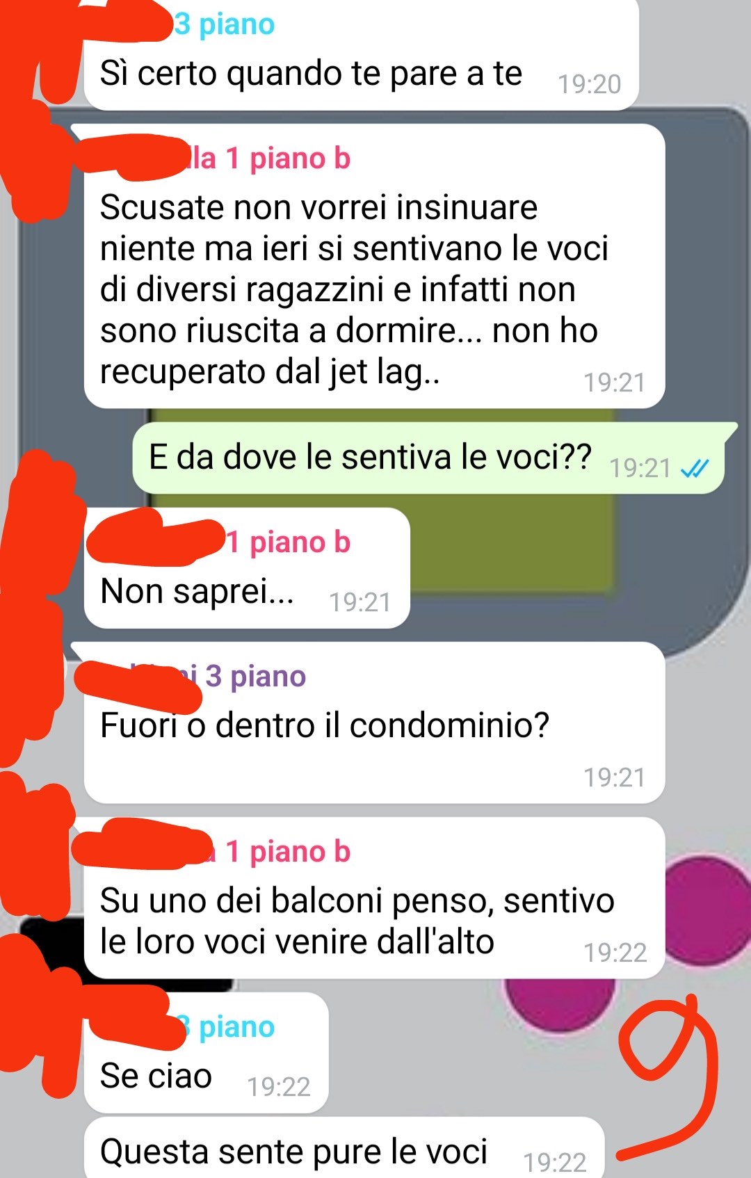Sara condivide una conversazione avvenuta nel gruppo WhatsApp del condominio in cui vive da cinque anni. Nonostante il tempo trascorso nel palazzo, Sara ammette di conoscere poco gli altri condomini, che non sono molto socievoli. Lei cerca comunque di partecipare alle riunioni di condominio, anche se spesso finiscono in litigi, costringendola ad andarsene. Nella conversazione in questione, si discuteva di un evento particolarmente strano che aveva turbato alcuni inquilini. Sara, che inizialmente non ne sapeva nulla, ha letto i messaggi nel gruppo e si è fatta due risate, notando come sia praticamente impossibile sdrammatizzare con i suoi vicini, che sembrano sempre pronti a litigare.