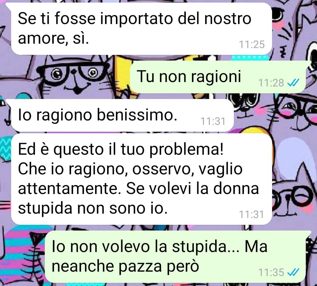 Il nostro fan Alessandro ha deciso di condividere una storia inventata, di sua proprietà intellettuale, che ruota attorno a una conversazione difficile avuta con la sua ormai quasi ex fidanzata. Un momento carico di tensione e delusione, che ha segnato un punto di rottura in una relazione già messa alla prova da dinamiche complesse.