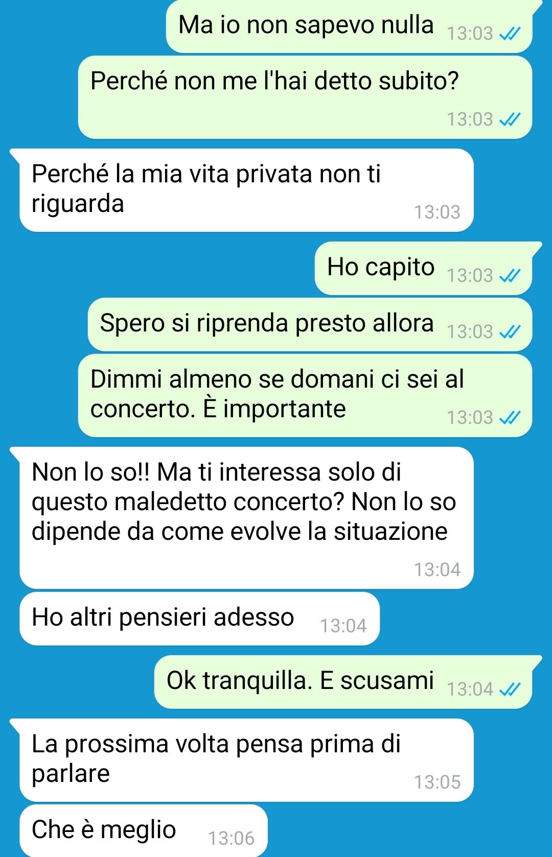 Nel contesto musicale, spiega l’amica, questo tipo di separazione risulta ancora più difficile. Le collaborazioni artistiche, infatti, si fondano spesso anche su una forte intesa personale, su un certo tipo di sintonia emotiva, e il tempo passato insieme durante le prove o i concerti può facilmente far nascere amicizie o, in alcuni casi, anche qualcosa di più profondo. La nostra fan, però, ha imparato che bisogna fare attenzione a instaurare legami con determinate persone, perché da rapporti inizialmente positivi si possono generare situazioni molto spiacevoli.