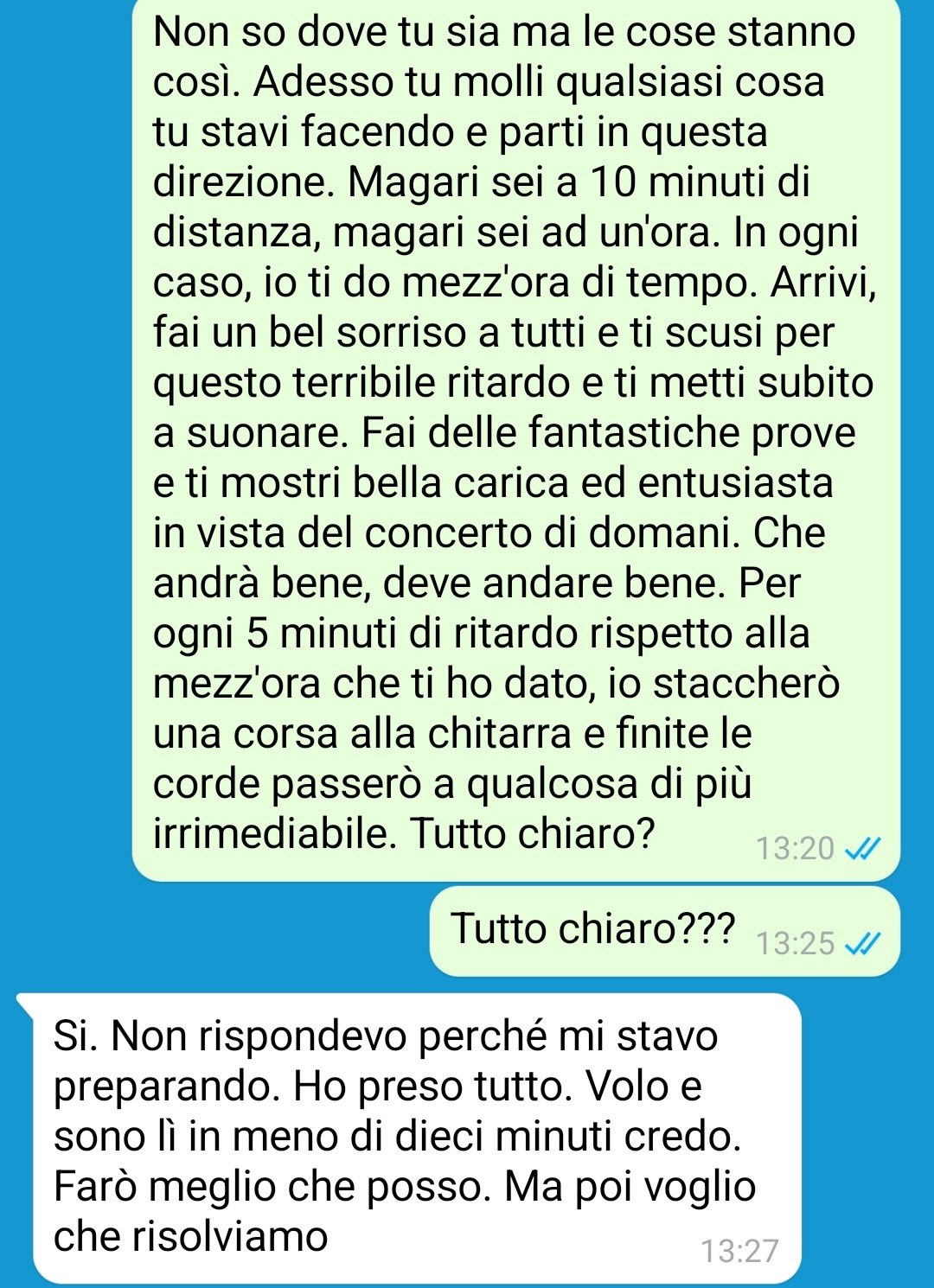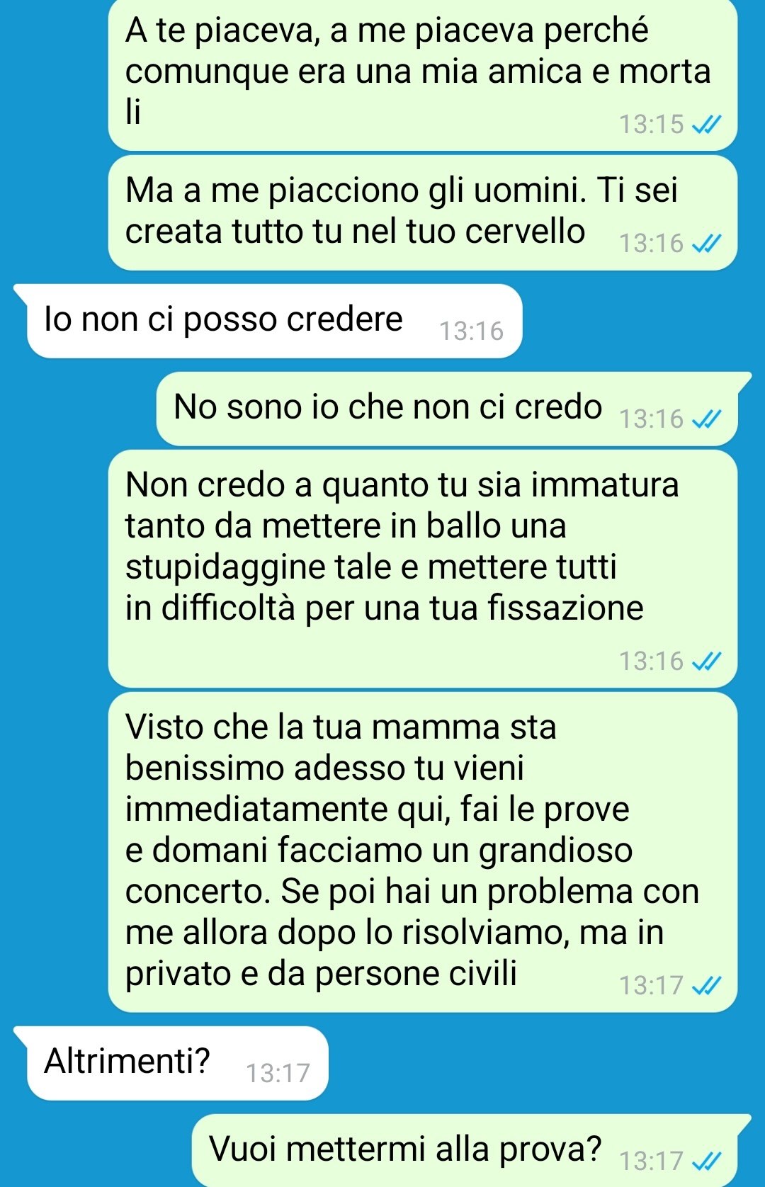 Ciò che l’ha sconvolta maggiormente, come scrive nel suo racconto, è stato scoprire che in realtà, per tutto quel tempo, la chitarrista covava un risentimento nascosto. Secondo quanto riferisce, quella che sembrava una tregua professionale era solo una maschera, dietro cui si celava una vendetta pianificata nel tempo. L’amica racconta di essere rimasta profondamente delusa da questo comportamento, poiché non si aspettava che una situazione personale potesse sfociare in un attacco mirato in ambito lavorativo.