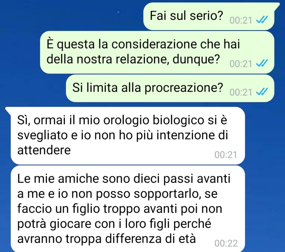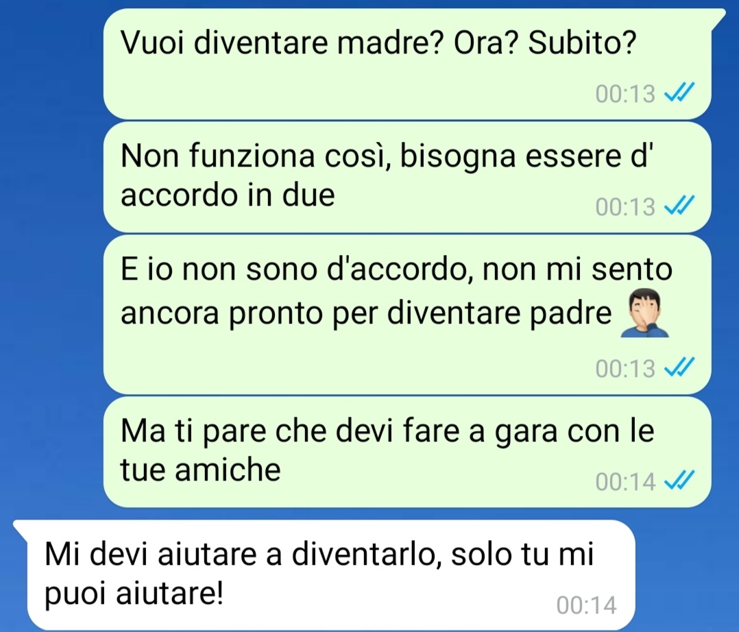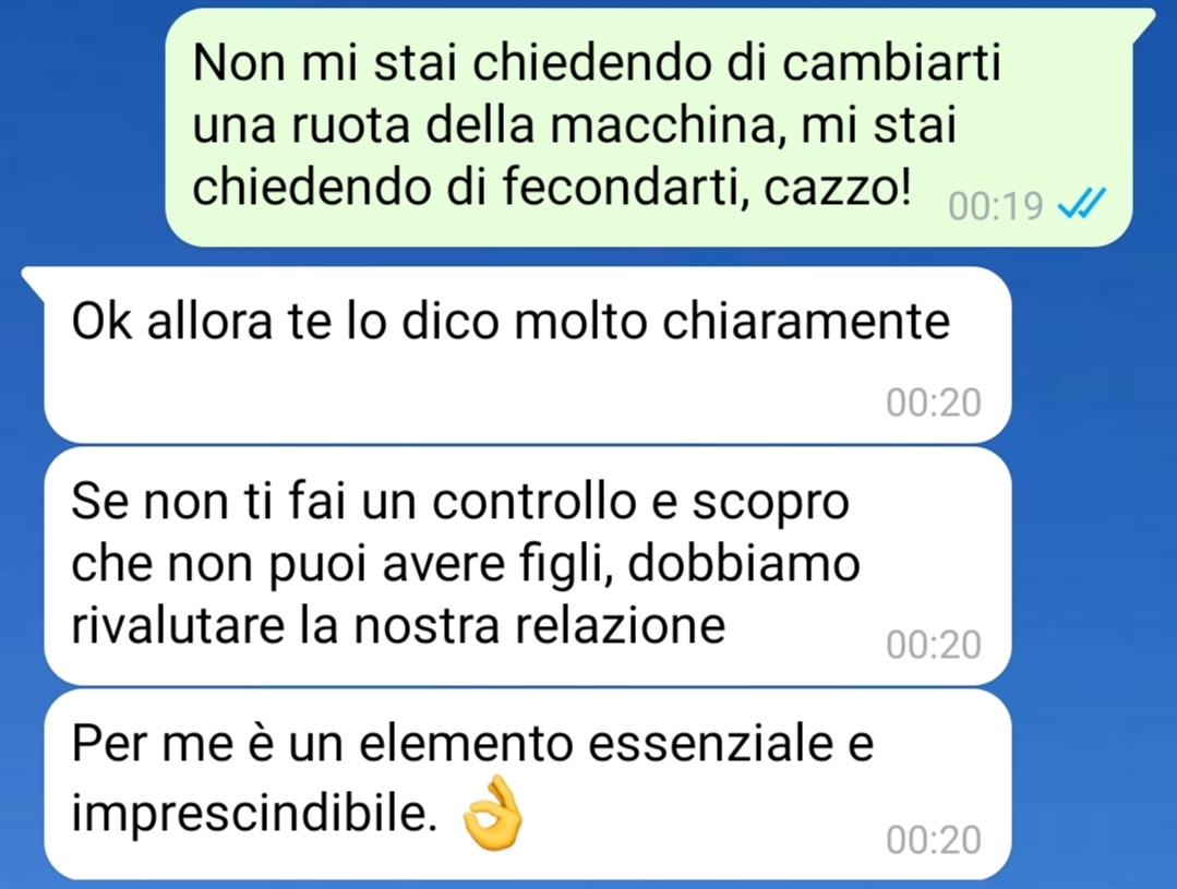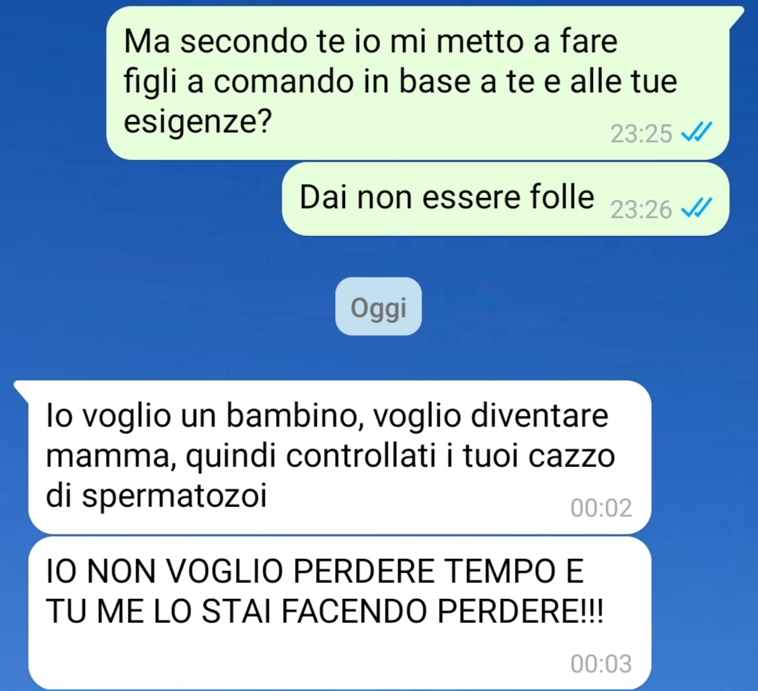 Nel suo caso, la compagna avrebbe iniziato a manifestare in modo pressante la volontà di avere un figlio, trasformando – a detta del nostro follower – questo desiderio in un argomento costante e fonte di discussione. In particolare, uno dei punti più critici sarebbe stata la richiesta, da parte della fidanzata, che lui si sottoponesse a un controllo per verificare la qualità del proprio sperma. Una richiesta che il nostro amico ha definito come un’imposizione alla quale ha deciso di opporsi senza esitazione.