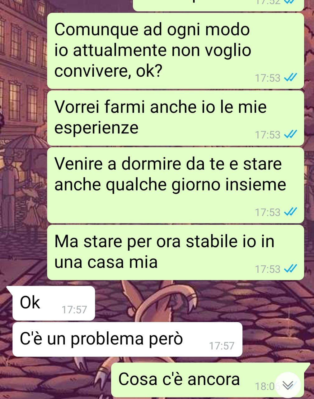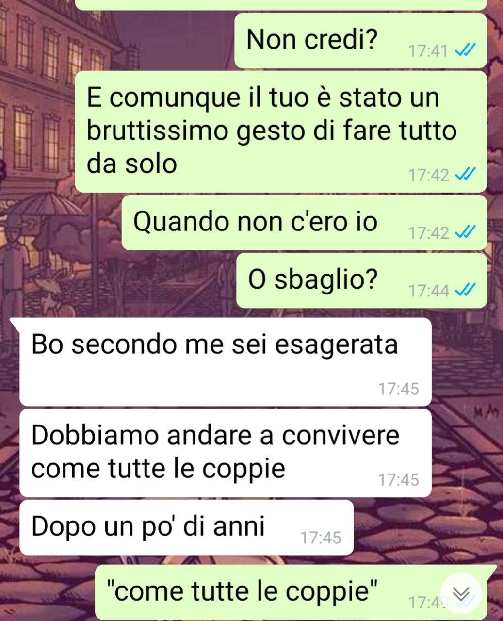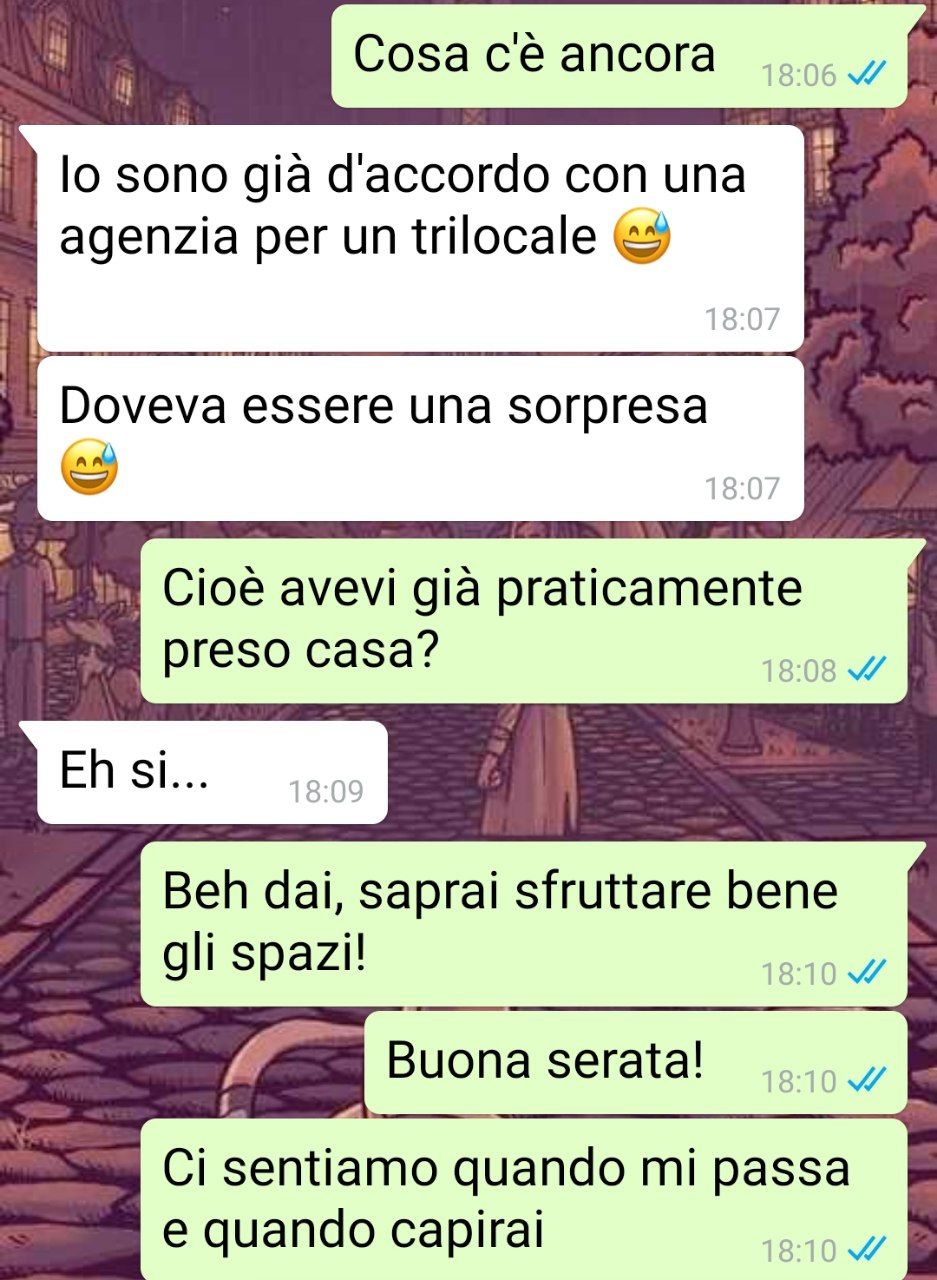 Esprime stupore e frustrazione per il fatto che il fidanzato abbia preso un’iniziativa così significativa senza consultarlo e senza discutere in anticipo la questione. Questo comportamento è percepito come un’assunzione di scontatezza e una mancanza di considerazione nei confronti del narratore e delle sue opinioni. La situazione lascia il narratore a riflettere sull’atteggiamento del fidanzato e sulla mancanza di comunicazione nella loro relazione.