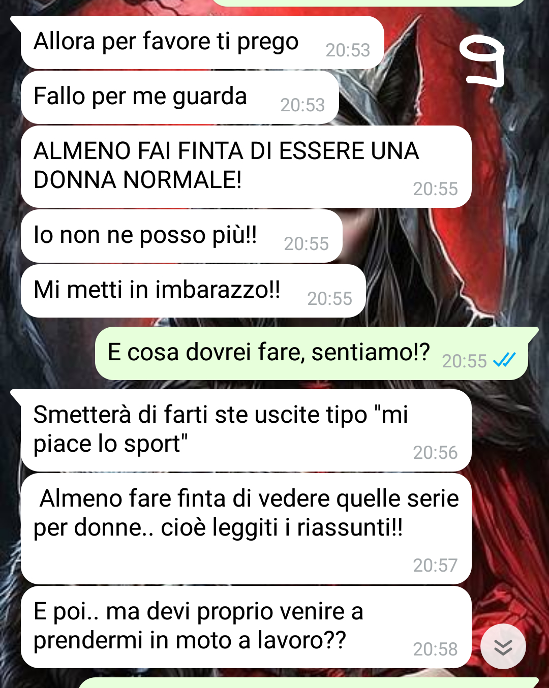 Tra le passioni che più la caratterizzano ci sono inoltre le auto e i motori. In particolare, la nostra amica nutre un forte interesse per le moto. Possiede una moto a cui è profondamente legata e che considera speciale. Questo interesse per il mondo dei motori è uno degli aspetti che il suo ex ragazzo riteneva poco in linea con la sua idea di donna.