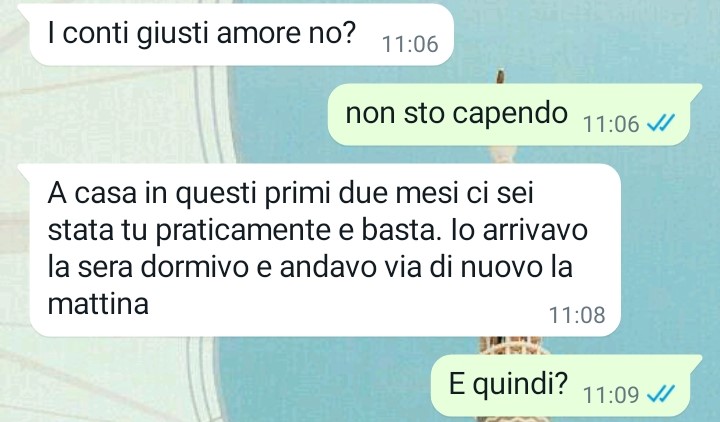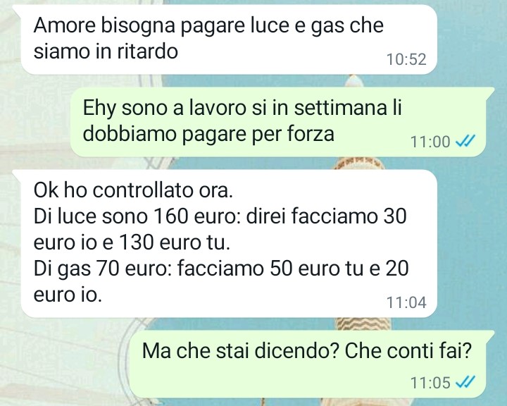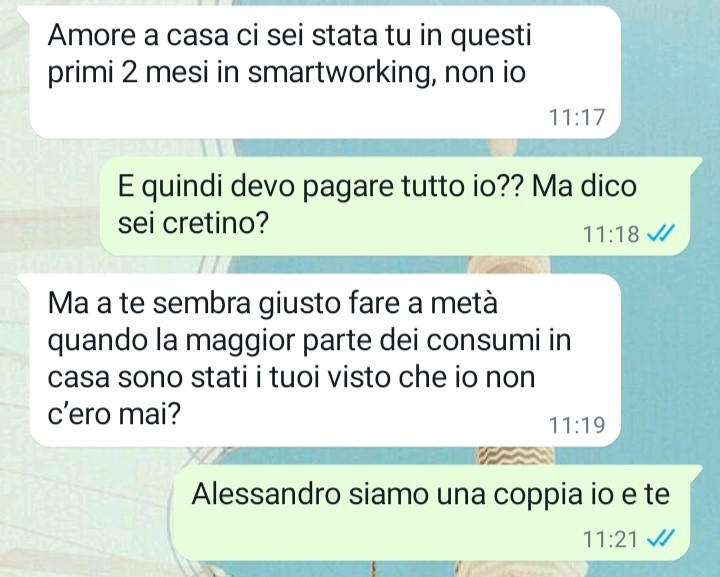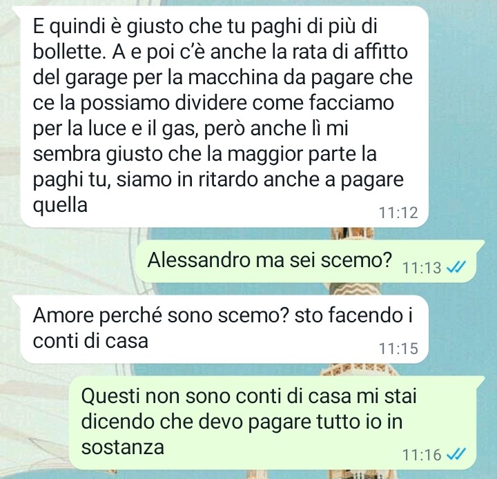 Il mio nome è Claudia e ho deciso di mandarvi una chat da brivido avuta prima con il mio compagno Alessandro. Io e lui due mesi e mezzo fa abbiamo deciso di andare a convivere e almeno fino ad oggi tutto sembrava procedere per il meglio. Ma aspettate di leggere la chat per scoprire cosa è successo oggi e che tipo di proposta mi avrebbe fatto Alessandro per affrontare la cosa secondo lui in una maniera “giusta equa e rispettosa di noi come coppia” . Leggete e tenetevi forte io intanto me ne vado a vomitare.