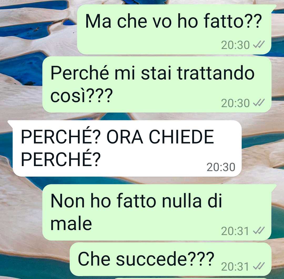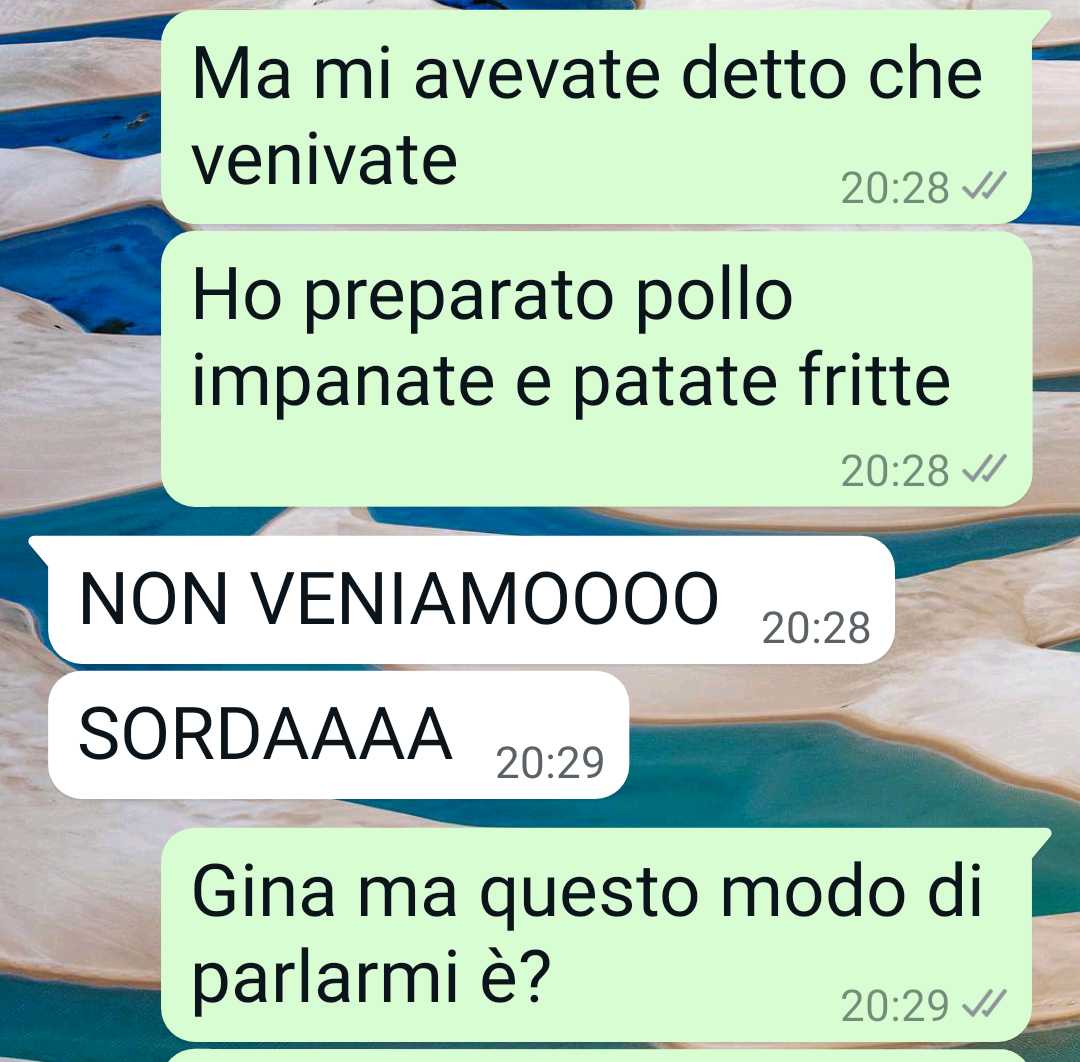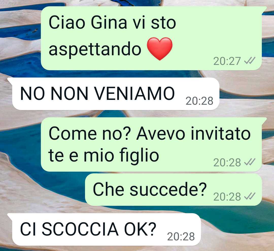 Mia nuora è una donna crudele. Avevo invitato lei e mio figlio a cena, ma c’è anche un altro ospite che l’ha fa;a infuriare. Sono una signora, sono una donna, una madre, una vedova. Mi merito ogni gioia anche se sono grande. Posso ancora vivere una vita piena e ricca di esperienze. Perché mi sembra che i ragazzi di oggi (alcuni per carità) siano più bigoE e puritani di noi ultracentenari. Ok, boomer, ma almeno mentalmente siamo più liberi. Io non lo capisco questo bigoEsmo, non comprendo la rabbia per una cosa tanto naturale. Vi allego le immagini di questa conversazione su whatapp per farvi capire la crudeltà e i modi di una persona che dovrebbe essere di famiglia. Mio figlio la segue a ruota. Pensa anche lui che io sia una poco di buono. No, veramente, ragazzi, non si può essere così legaO alla so;ana a una certa età. A una certa età i genitori li dovete lasciare liberi di fare le loro esperienze. Sembra assurdo dirlo. Ma i figli oggi pretendono di fare i genitori severi a noi che siamo i loro genitori. Ecco gli allegaO. Cordiali saluO, una donna libera.