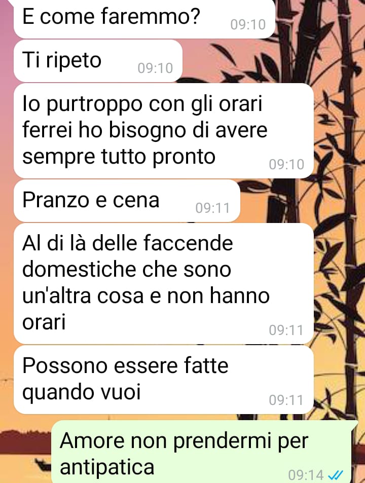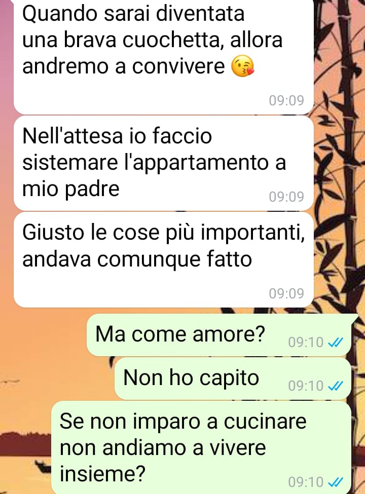 Tuttavia, proprio nel momento in cui si apre su questo desiderio, riceve una risposta che la lascia spiazzata. Il compagno, invece di condividere l’entusiasmo, cambia tono e inizia a parlare delle “responsabilità” che lei dovrebbe assumersi. In particolare, le dice chiaramente che, prima di pensare a una vita insieme, dovrebbe andare da sua madre a imparare a cucinare.