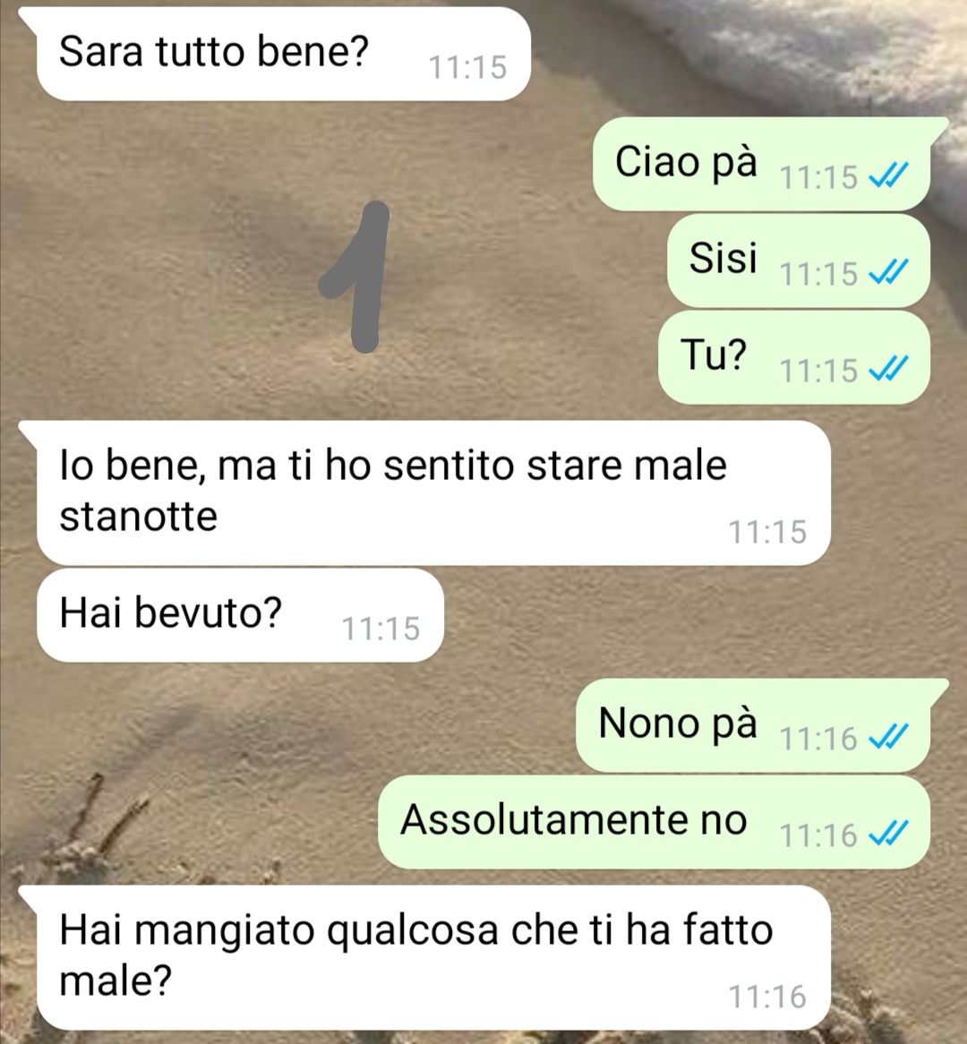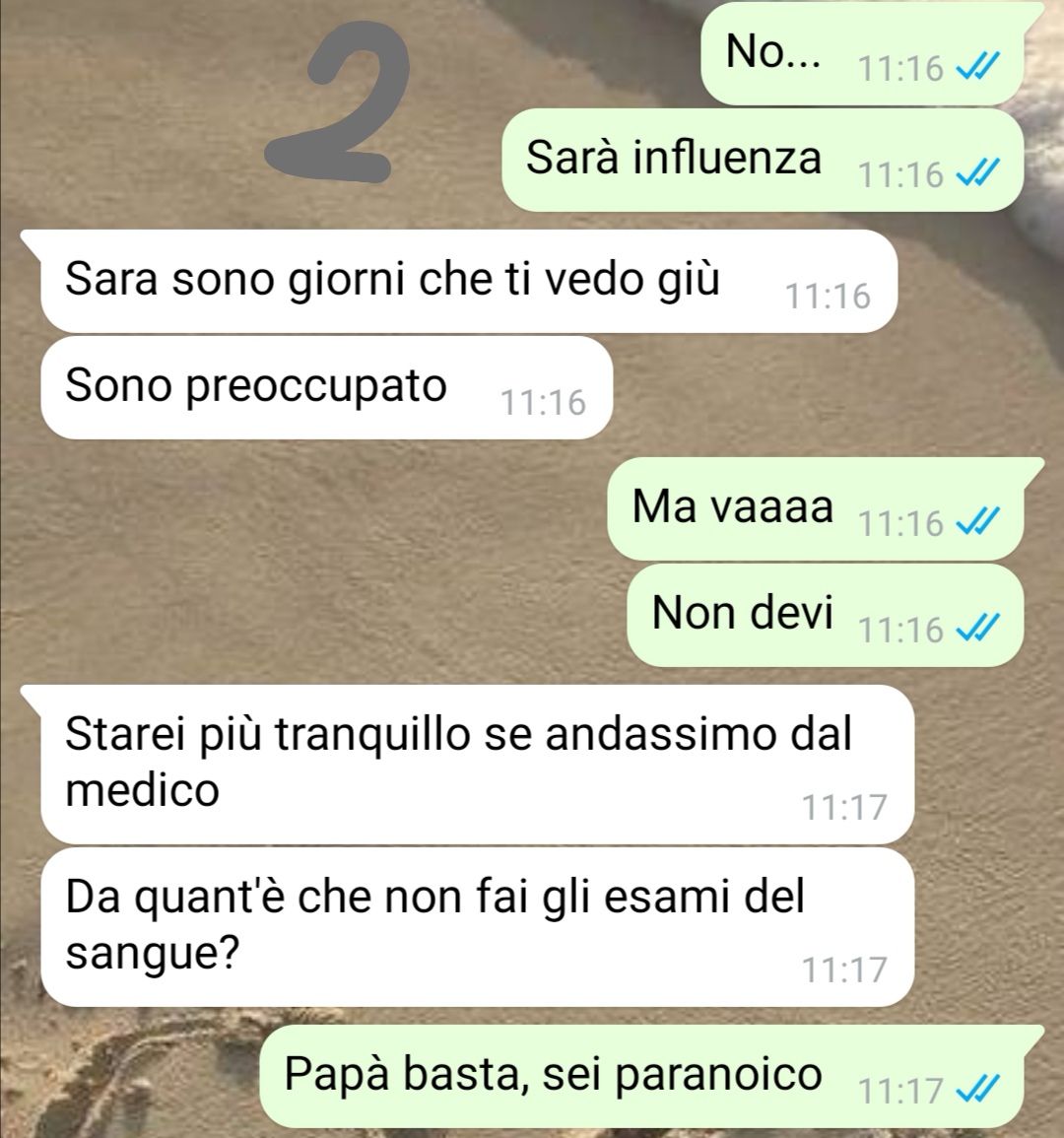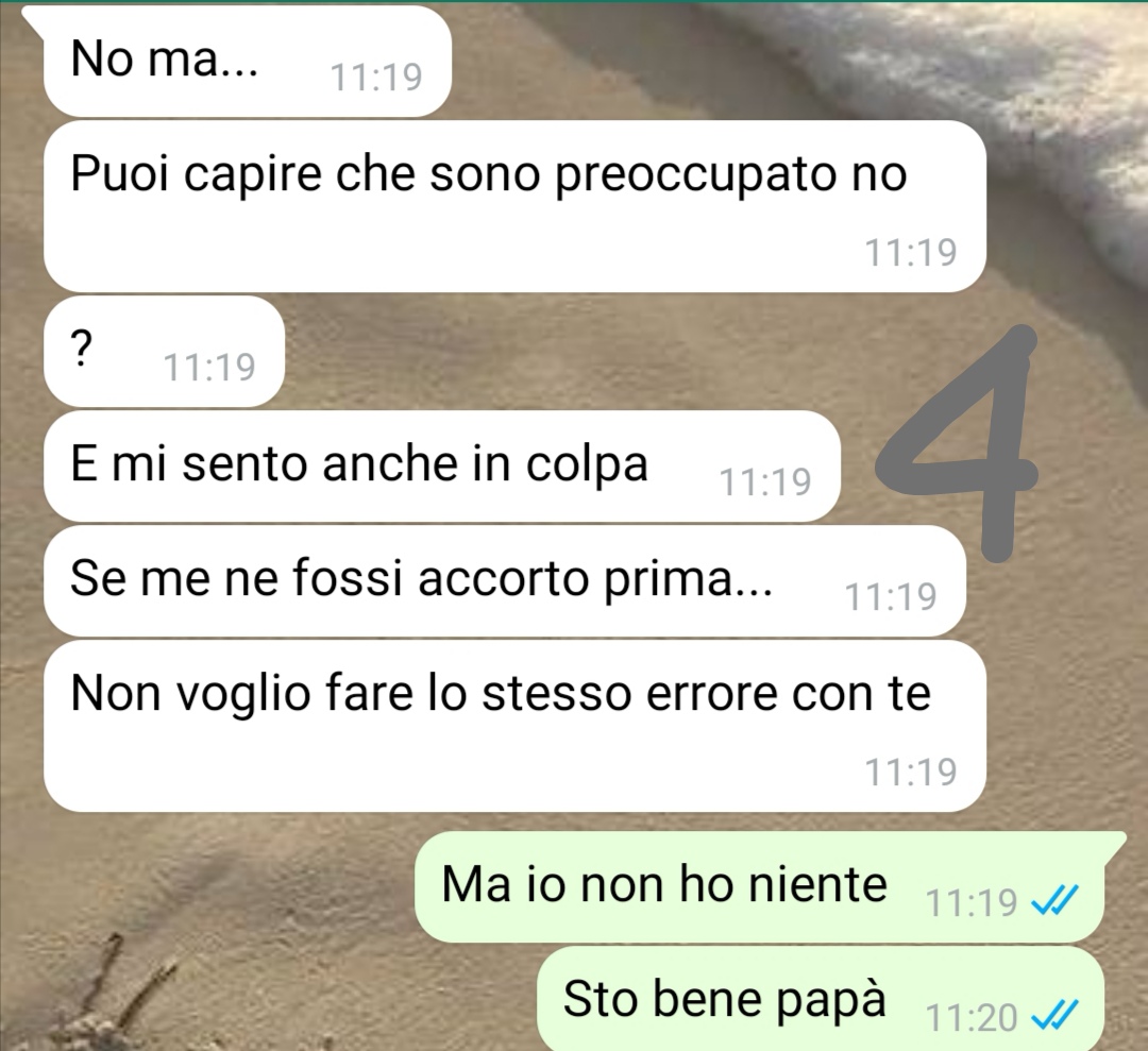 Mi chiamo Sara, tra poco compirò 20 anni e anche se sono molto giovane ho già alle spalle un passato difficile, fatto di momenti che sinceramente preferirei dimenticare.La mia famiglia una volta era composta da mia mamma, mio papà, mia sorella maggiore Francesca e me.Poi i miei si sono separati e mia mamma adesso vive in Belgio e lavora lì.Io e Francesca siamo rimaste a vivere con nostro padre che si è sempre preso cura di noi con molto amore.Poi due anni fa scopriamo che Francesca non sta bene. Lotta come una leonessa per un anno, ma dopo un anno purtroppo perde la sua battaglia.Ovviamente questo sconvolge mio padre e anche me. Ma mio padre comincia a diventare particolarmente ansioso. Al primo accenno di raffreddore si preoccupa per me eccessivamente e così una mattina di qualche settimana fa mi scrive perché la sera prima mi aveva sentito stare male.Mi fermo qui perché il resto lo capirete dalla chat. Ci tengo ad inviarla e a condividerla con voi e i vostri lettori perché per me questa conversazione resterà sempre un momento speciale…