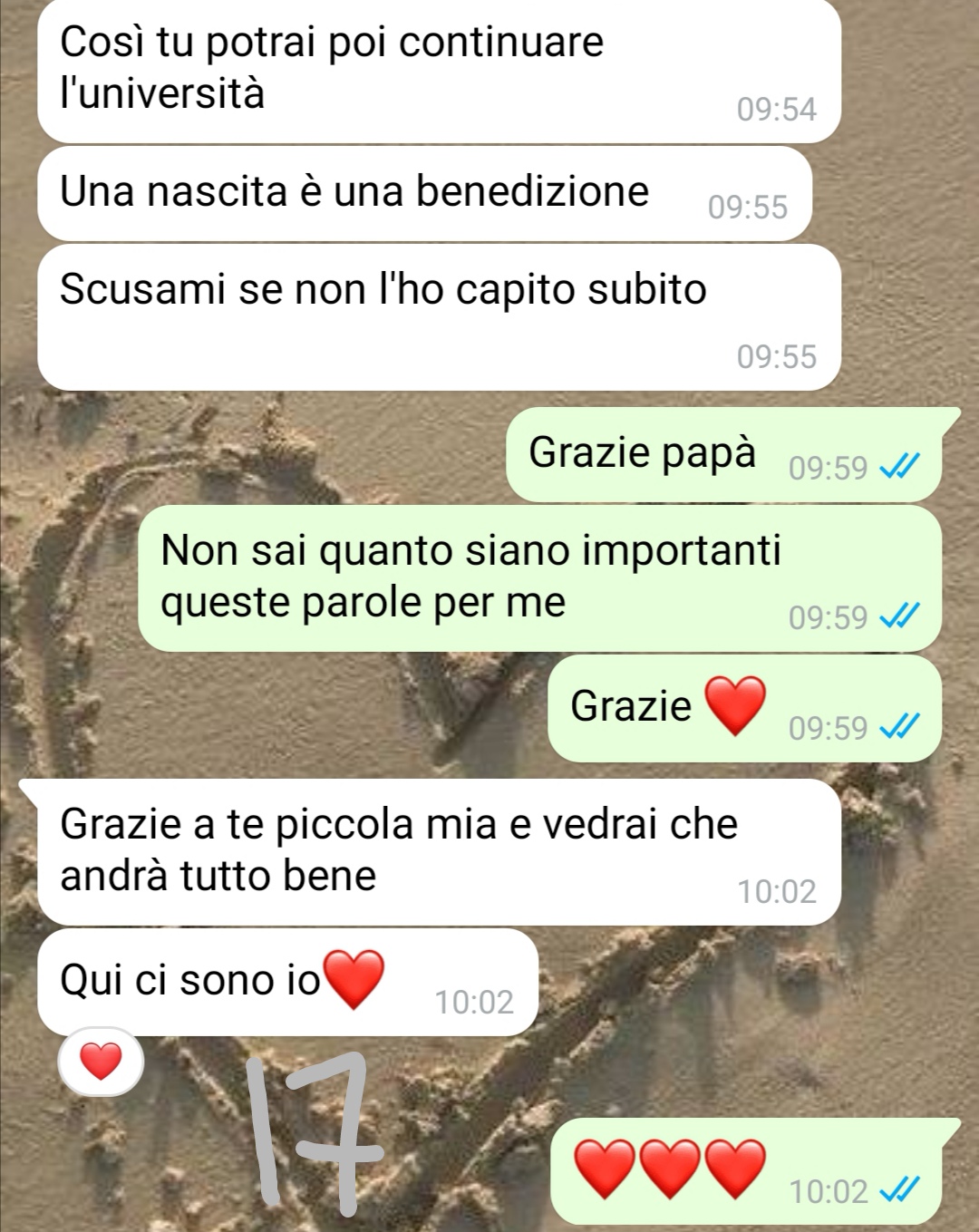 La nostra follower ha deciso di fermarsi qui nel racconto scritto, ma ci tiene particolarmente a condividere con la community di Commenti Memorabili una chat per lei molto significativa. Un momento che, come lei stessa racconta, conserverà per sempre nel cuore.